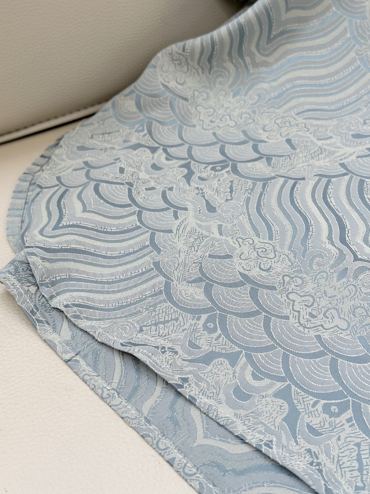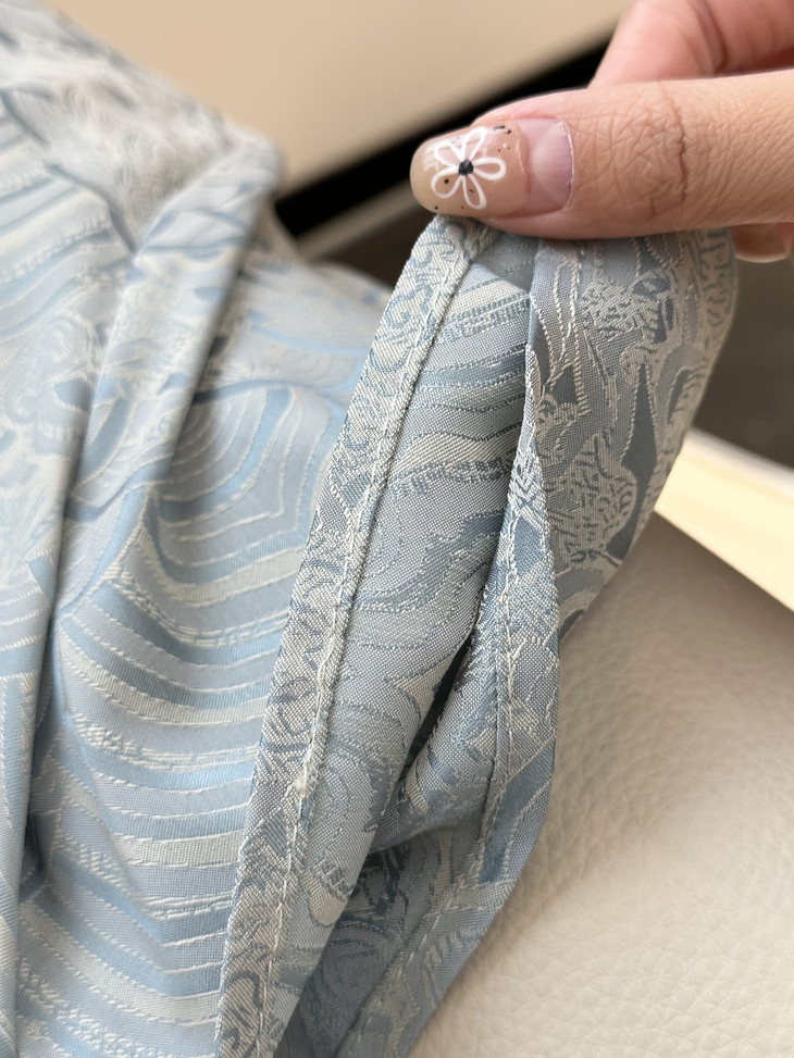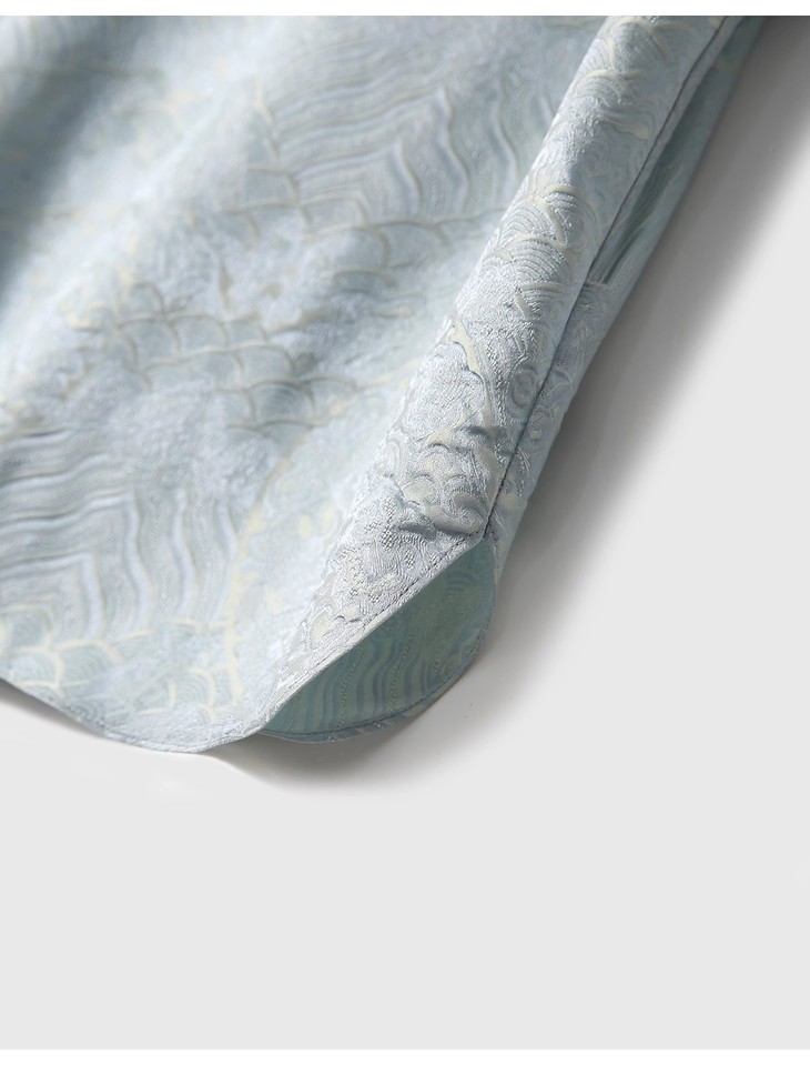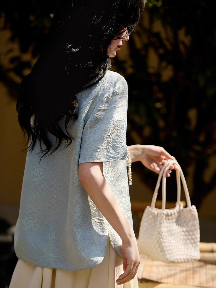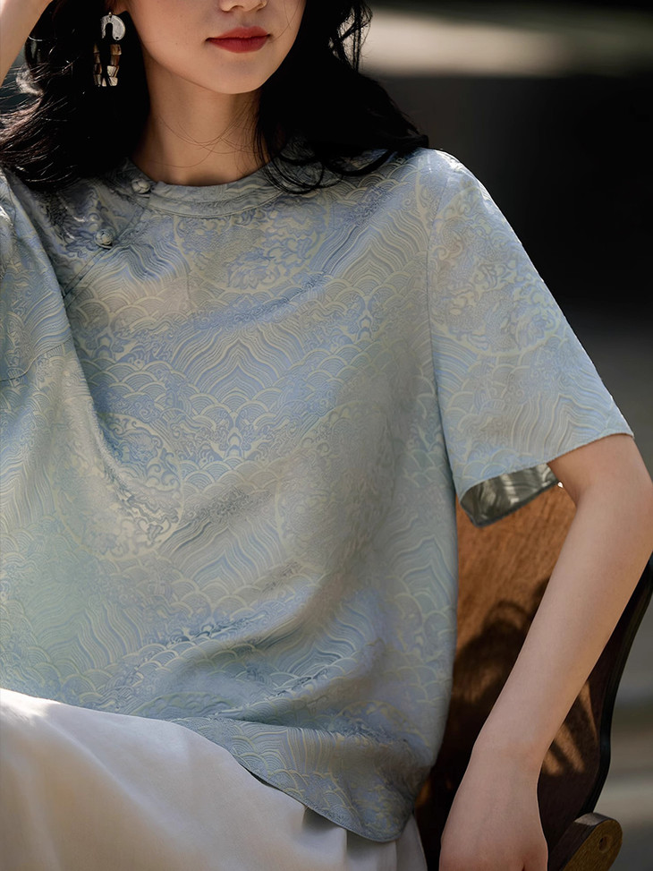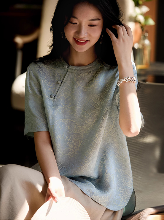 【新中式提花斜襟盘扣冰蓝色短袖】 ✅祥瑞的提花图案+斜襟盘扣精致又典雅 ✅宽松版型,对身材包容高 ✅经过设计师精挑细选,剪裁大气,做工精细 ✅边角走线平整,足见做工用心