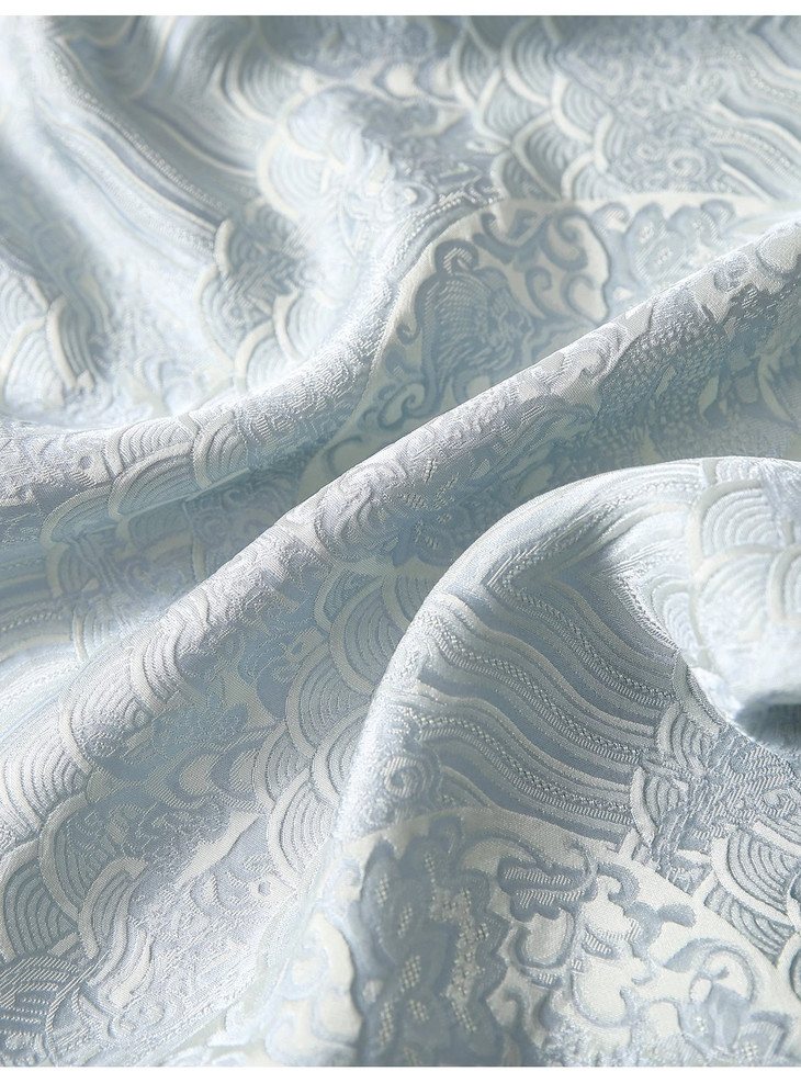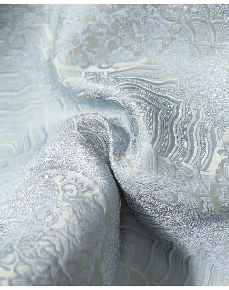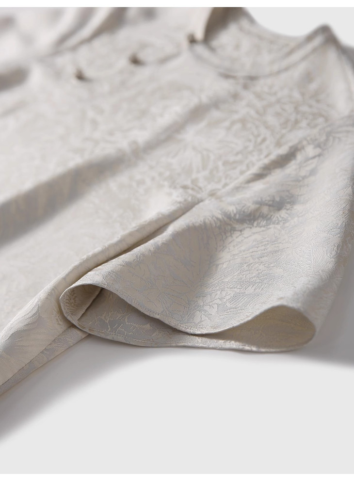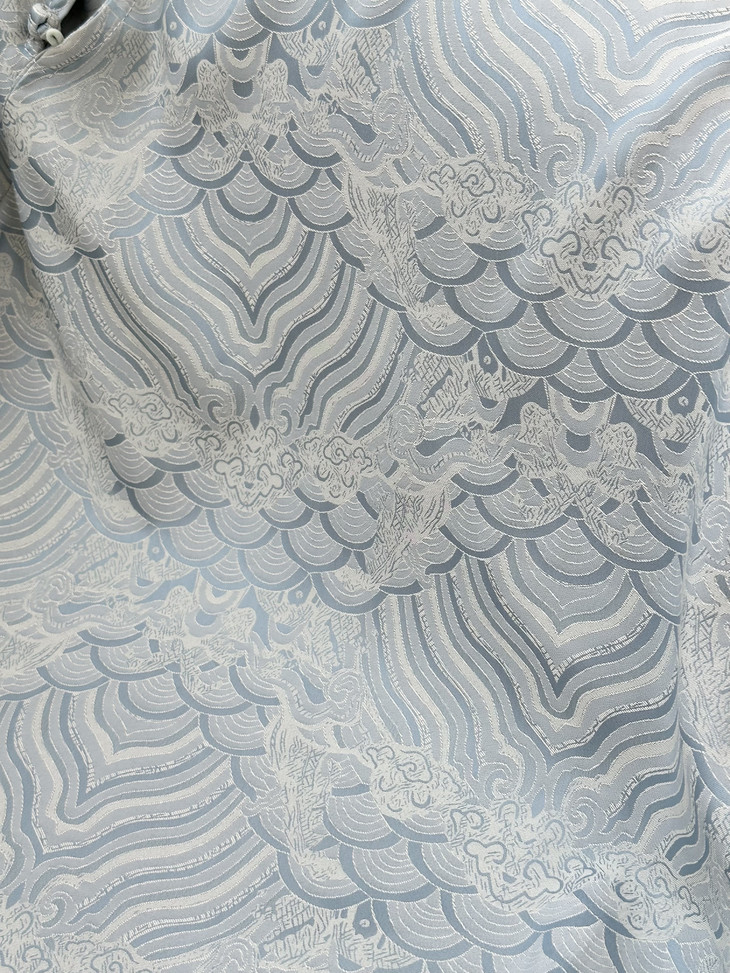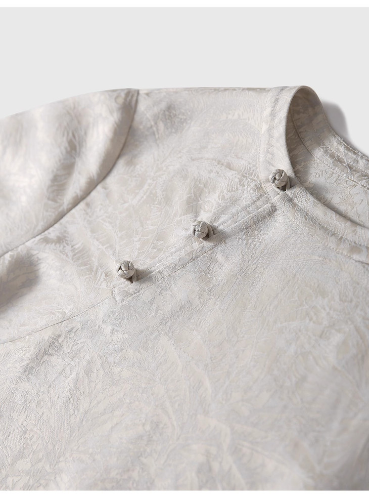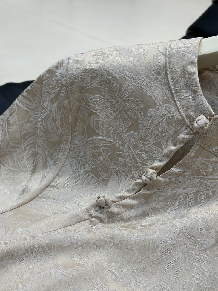 自带贵气,实用多种场合 宽松版型,对身材包容高 斜襟盘扣设计与古典,优雅并存 中式提花祥瑞图案,象征美好幸福 精湛的提花工艺,且边角走线平整,足见做工用心