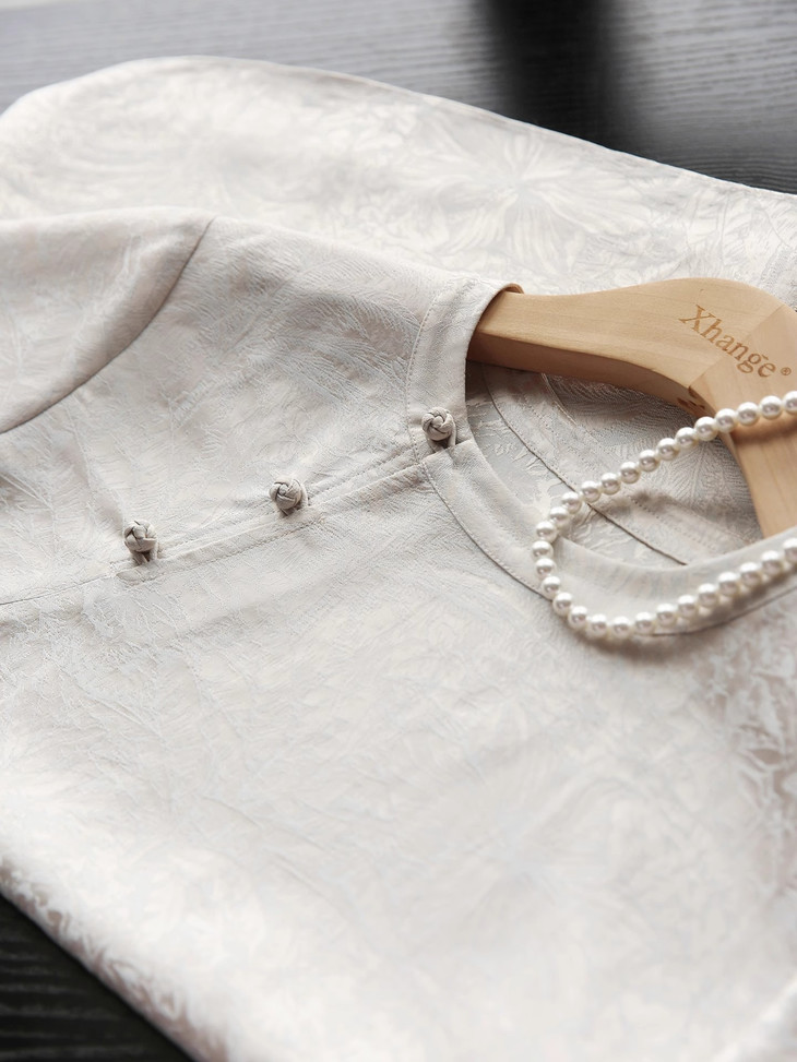 【新中式提花斜襟盘扣珠光杏短袖】 🔹纯手工立体盘绣,对工匠手缝技术要求高 🔹九万针数绣花工艺,精致高级品相敲好 🔹面料自带垂感,夏季穿着不闷汗,舒适与美感兼顾。 🔺包容各种身材,不挑体型,藏肉显瘦的同时,给予身体充足活动空间