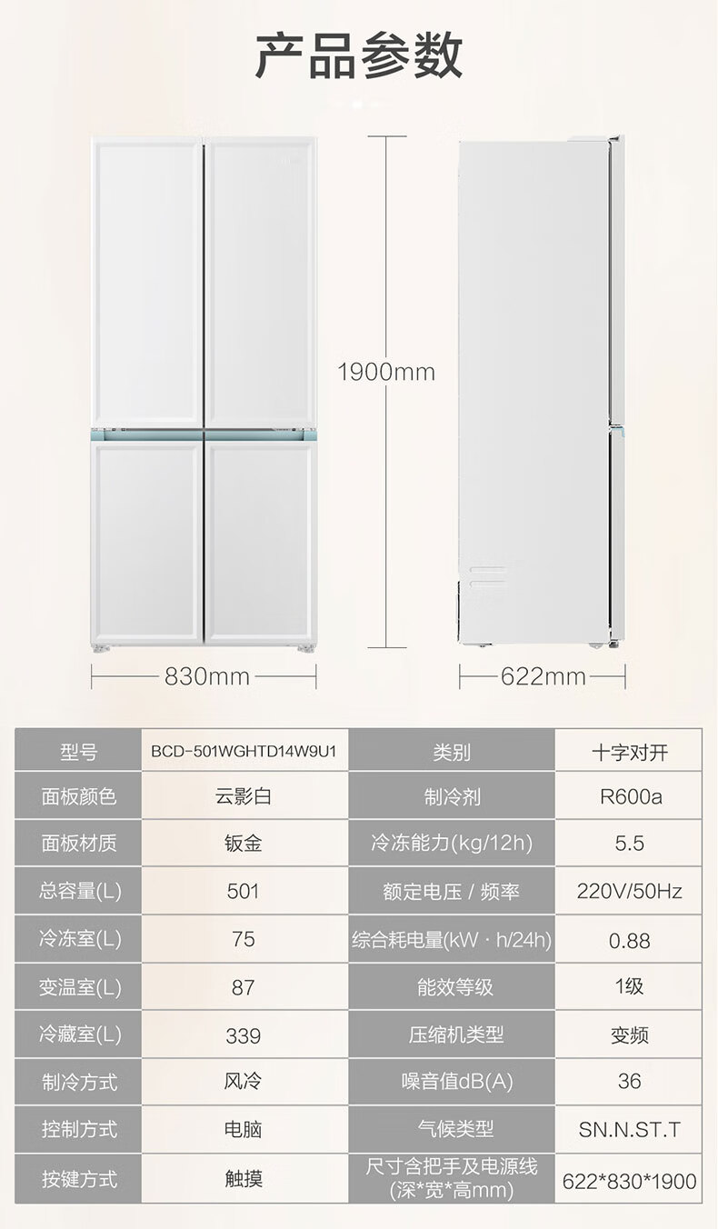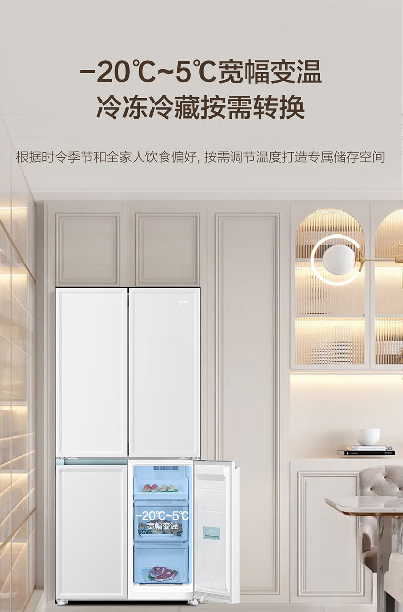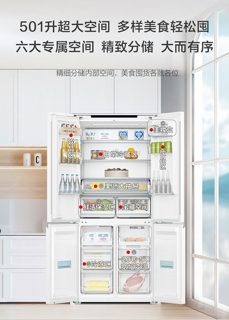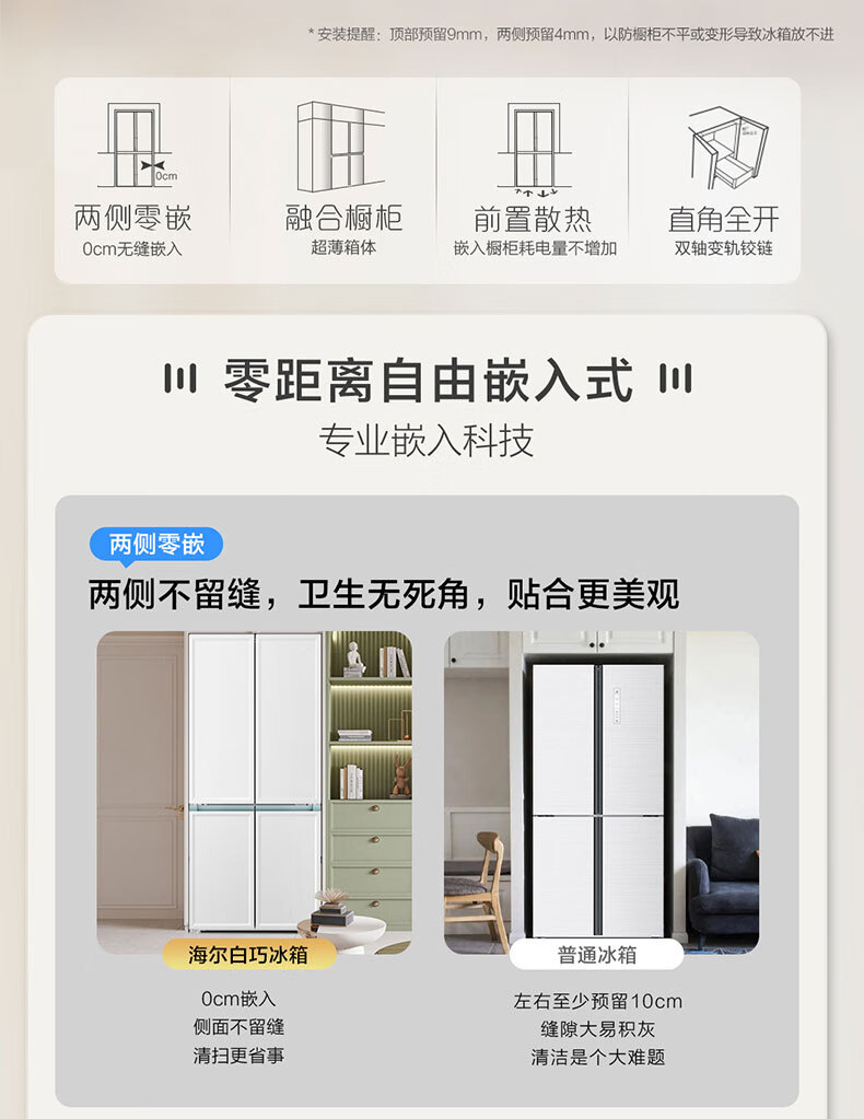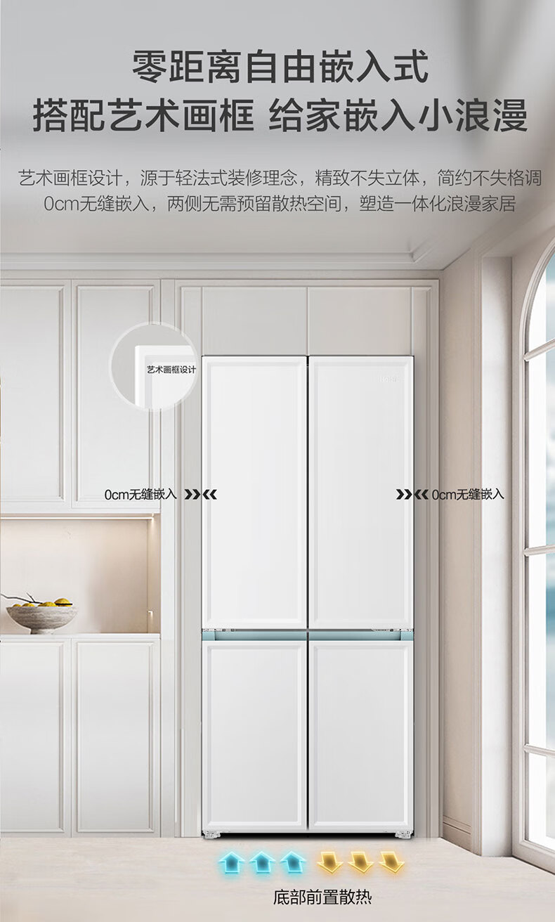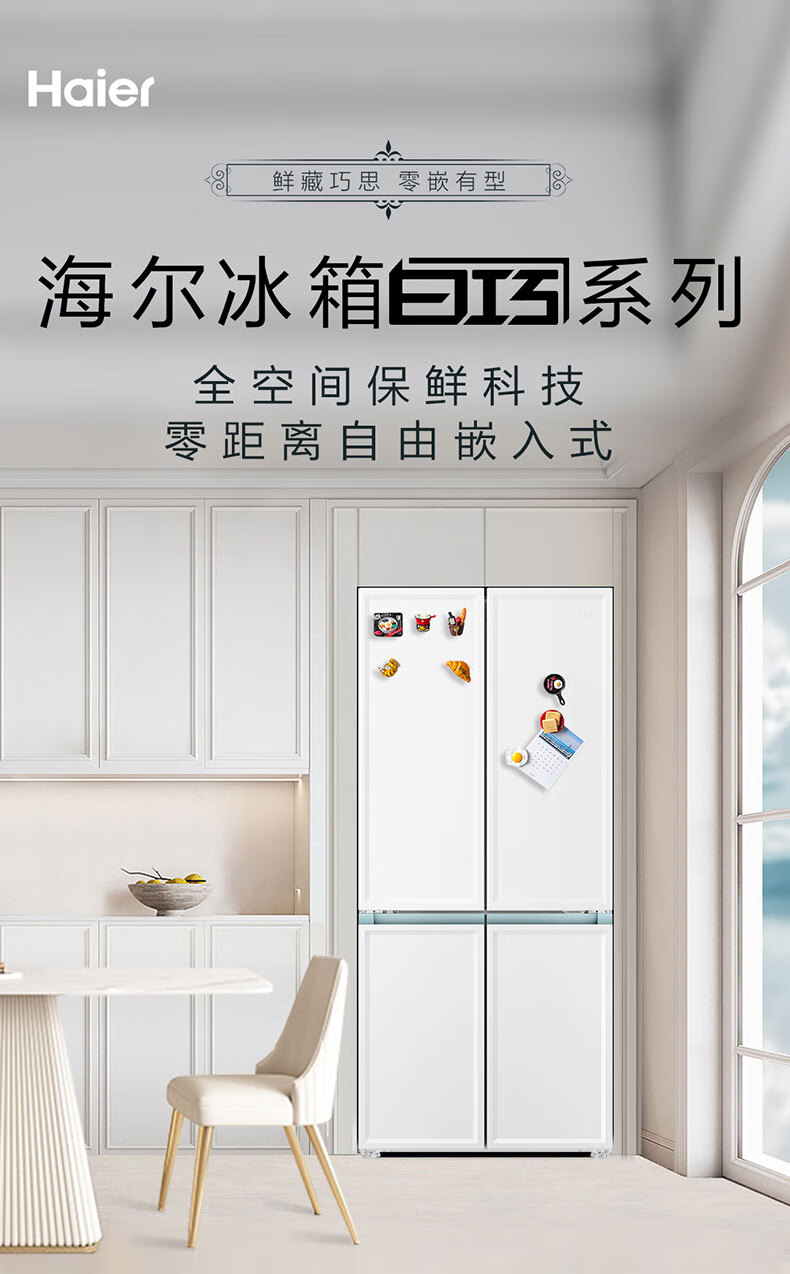 白巧系列-海尔501L零嵌全空间保鲜超薄冰箱四开门十字对开门零距离自由嵌入式风冷无霜家用大容量电冰箱 BCD-501WGHTD14W9U1