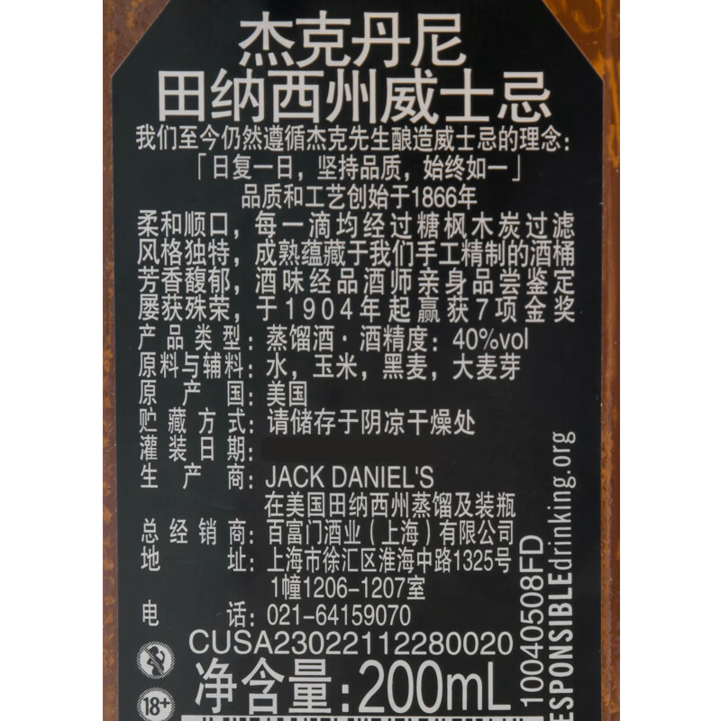 杰克丹尼田纳西州威士忌_40%vol _200ml