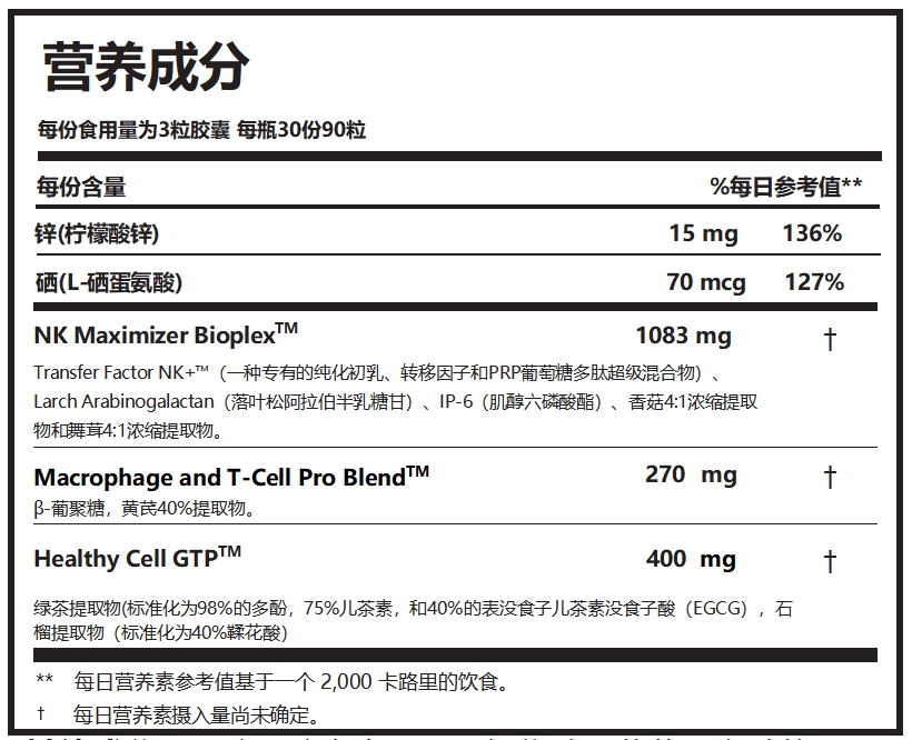 NK Maximizer Bioplex™:含转移因子、落叶松阿拉伯半乳聚糖、IP-6、香菇、舞茸蘑菇等成分
