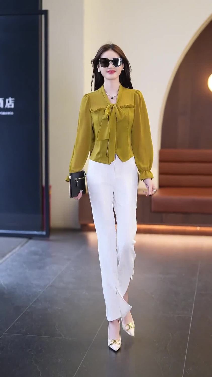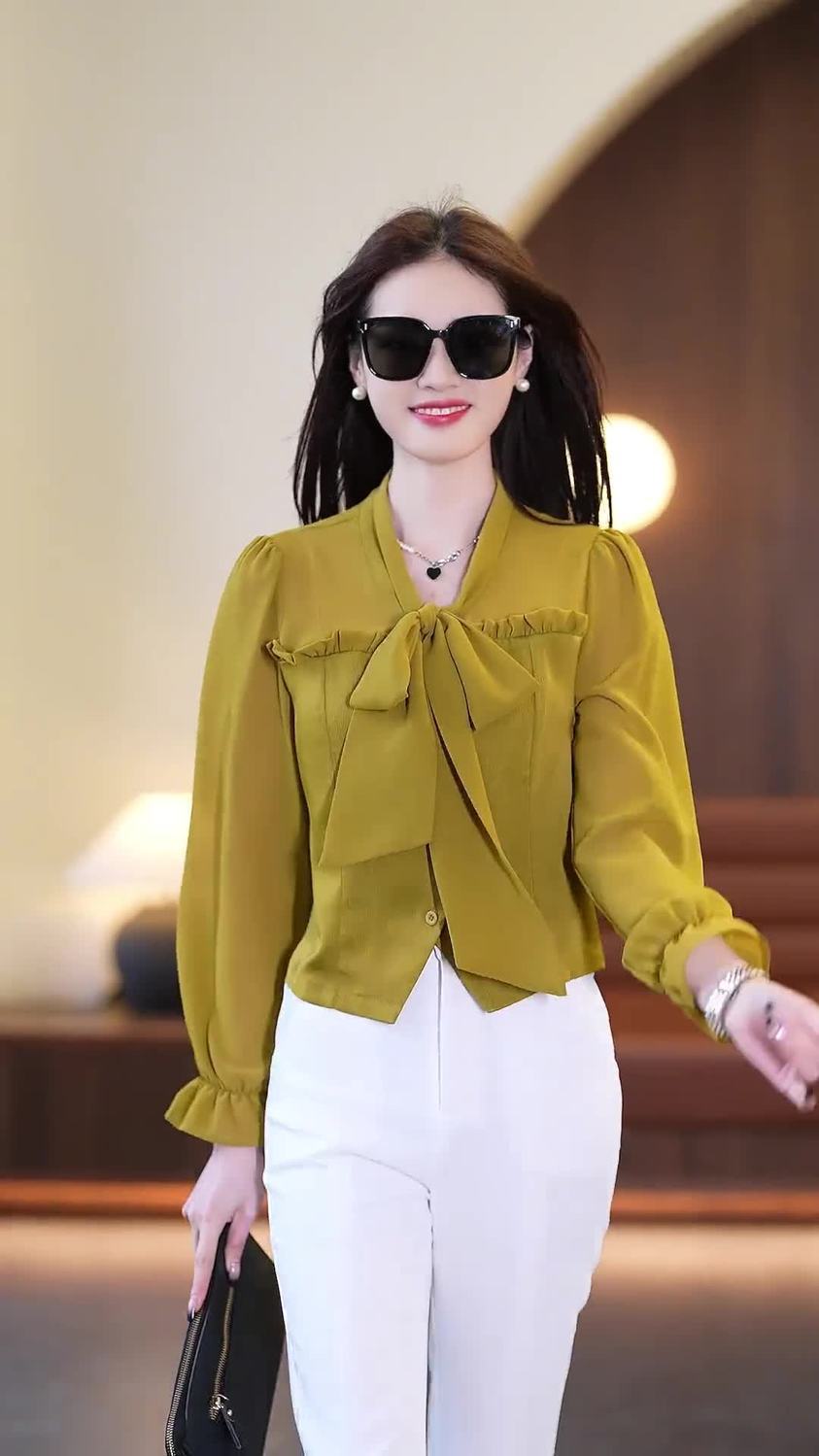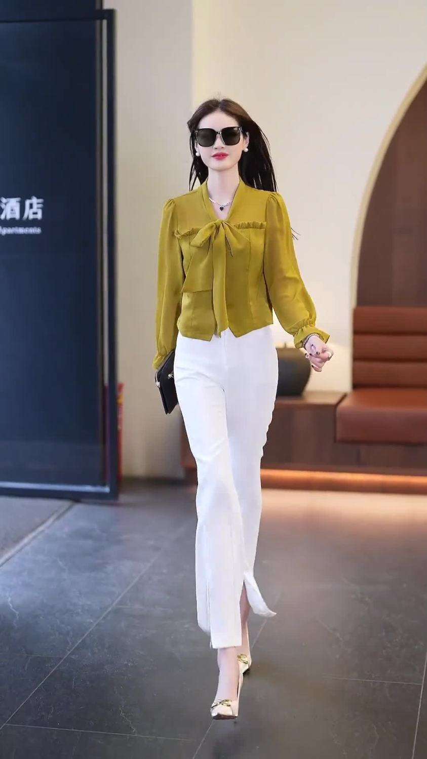 春夏新款蝴蝶结气质上衣显瘦高腰微喇裤修身西裤直筒裤开叉套装潮