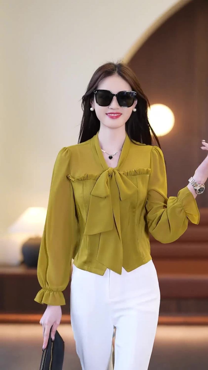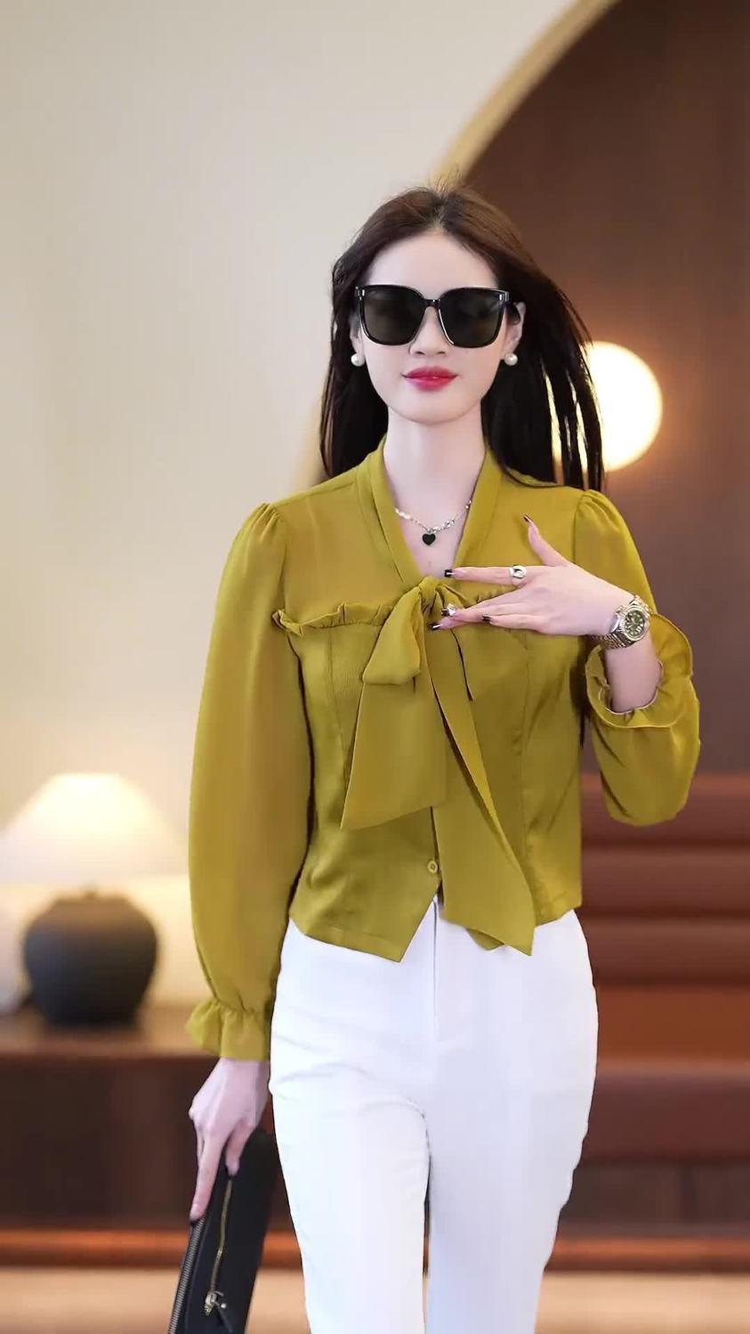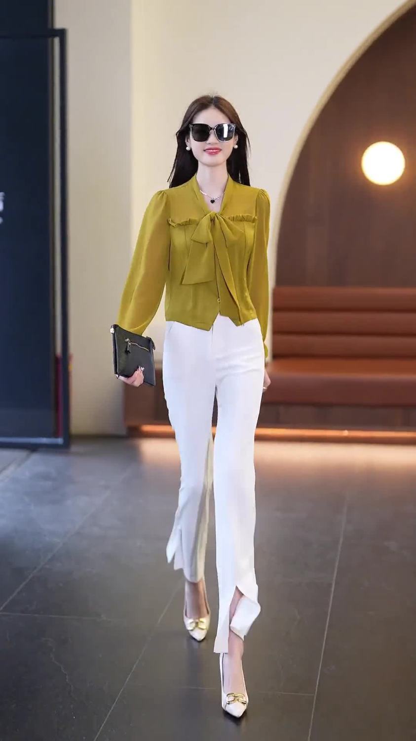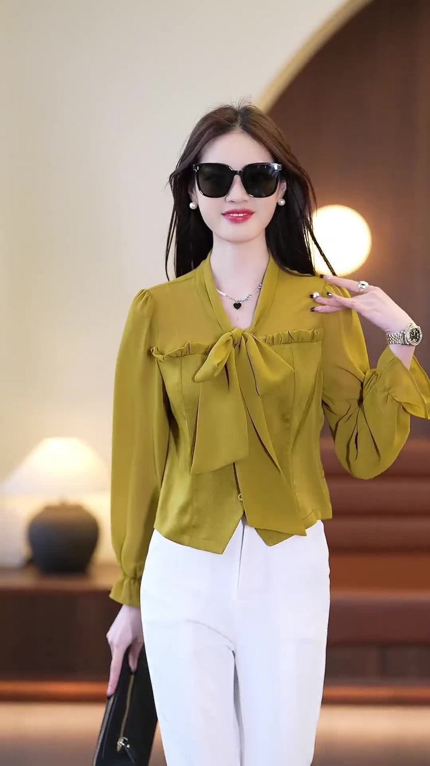 春夏新款蝴蝶结气质上衣显瘦高腰微喇裤修身西裤直筒裤开叉套装潮
