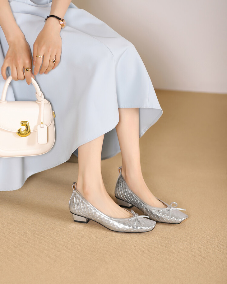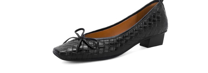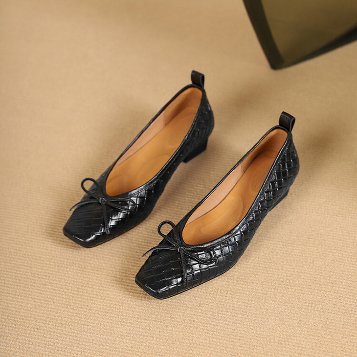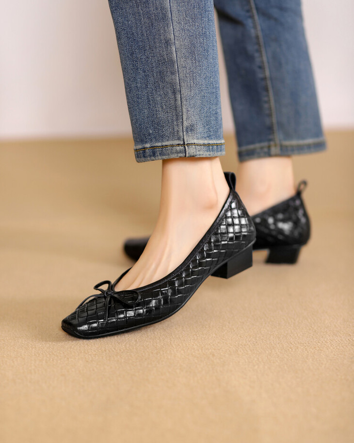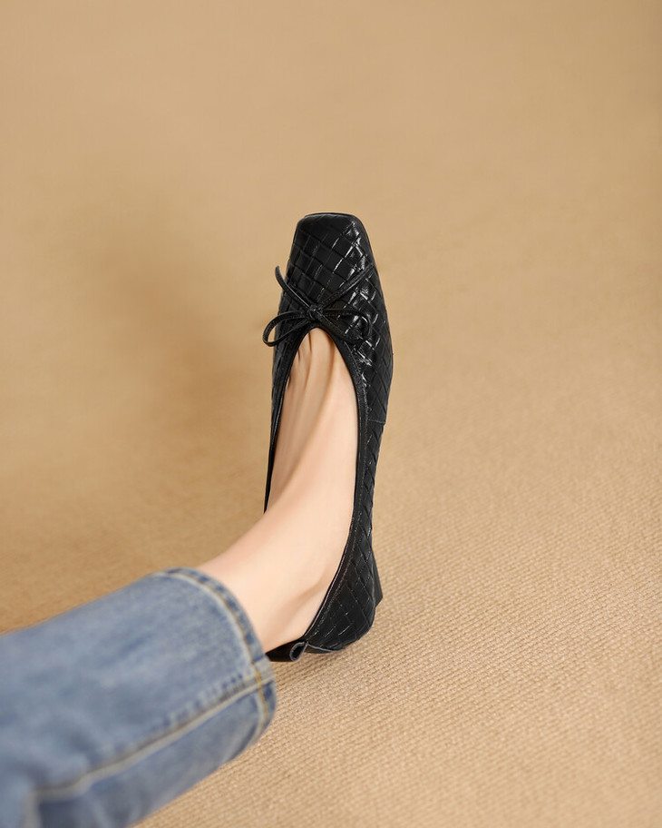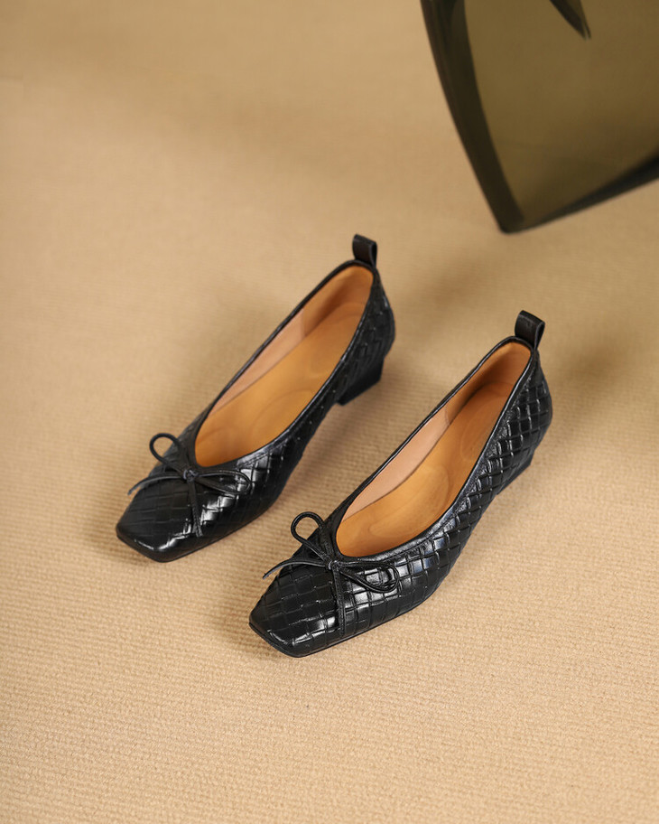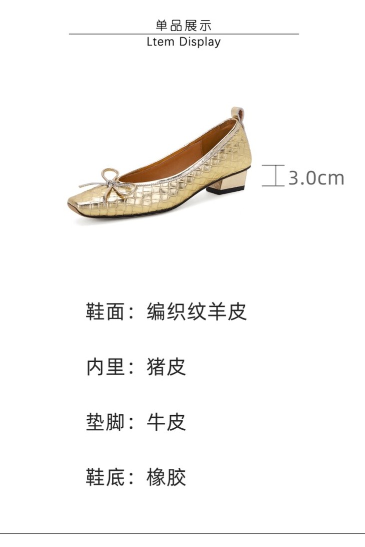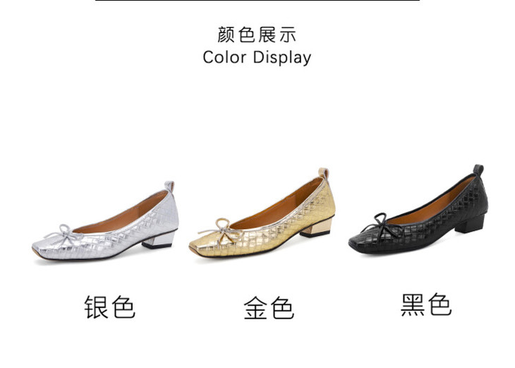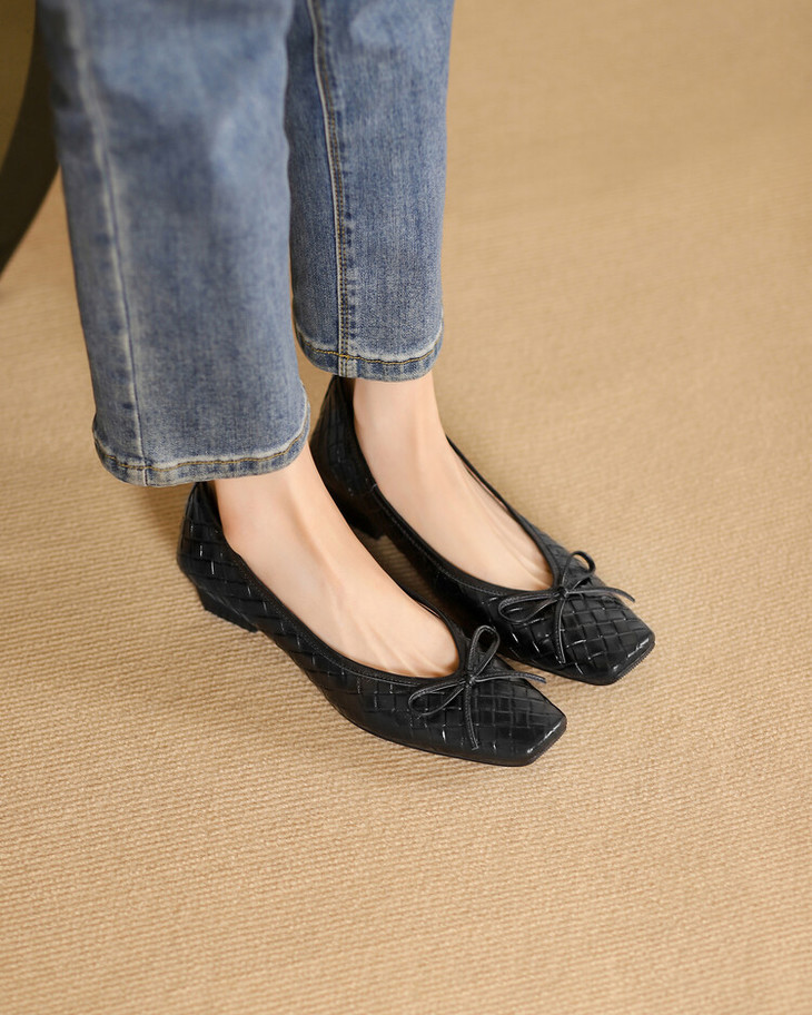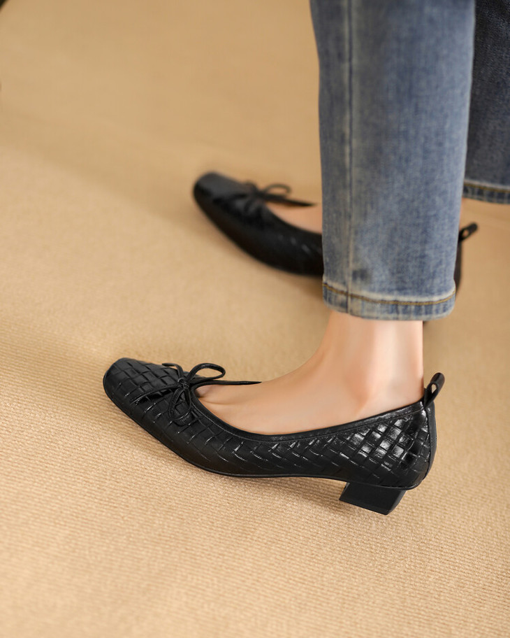 【预售5天】法式简约方头浅口编织纹羊皮低跟单鞋甜美蝴蝶结优雅舒适四季女鞋DTN&A1038-19