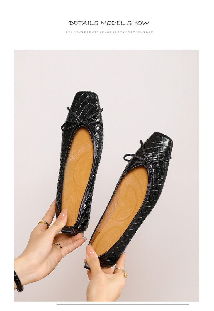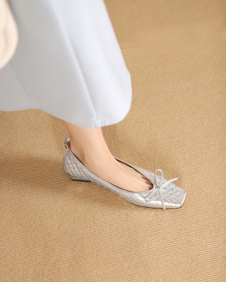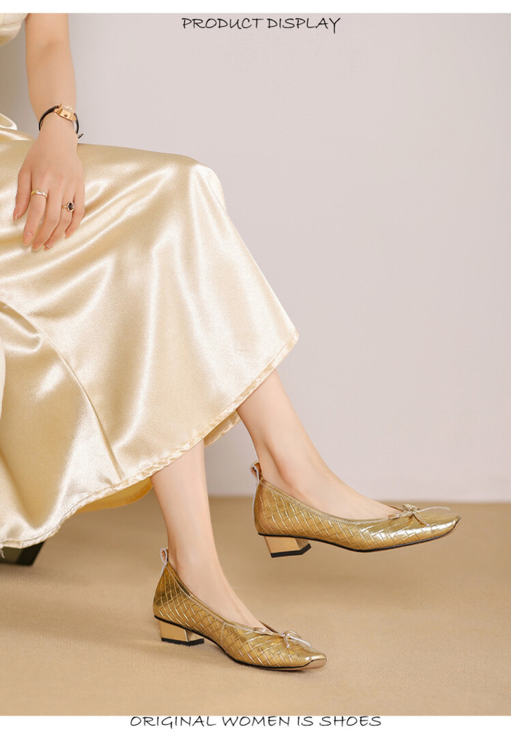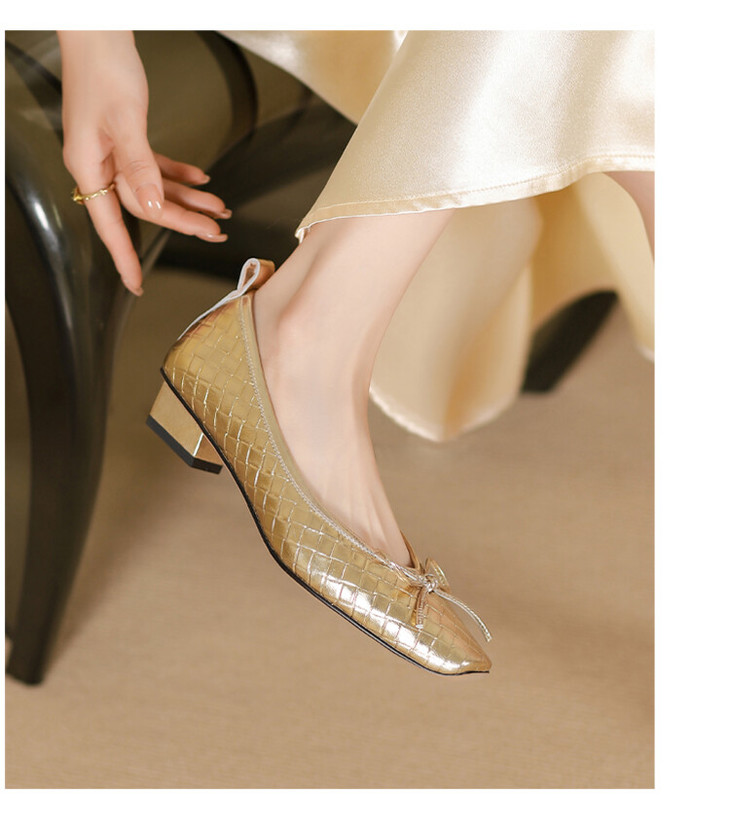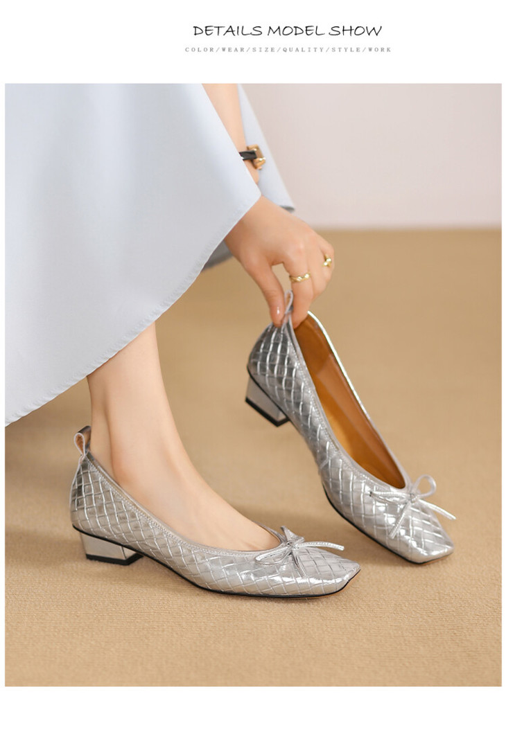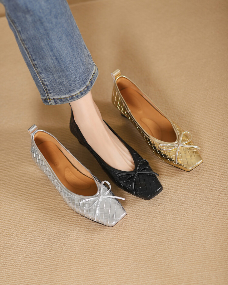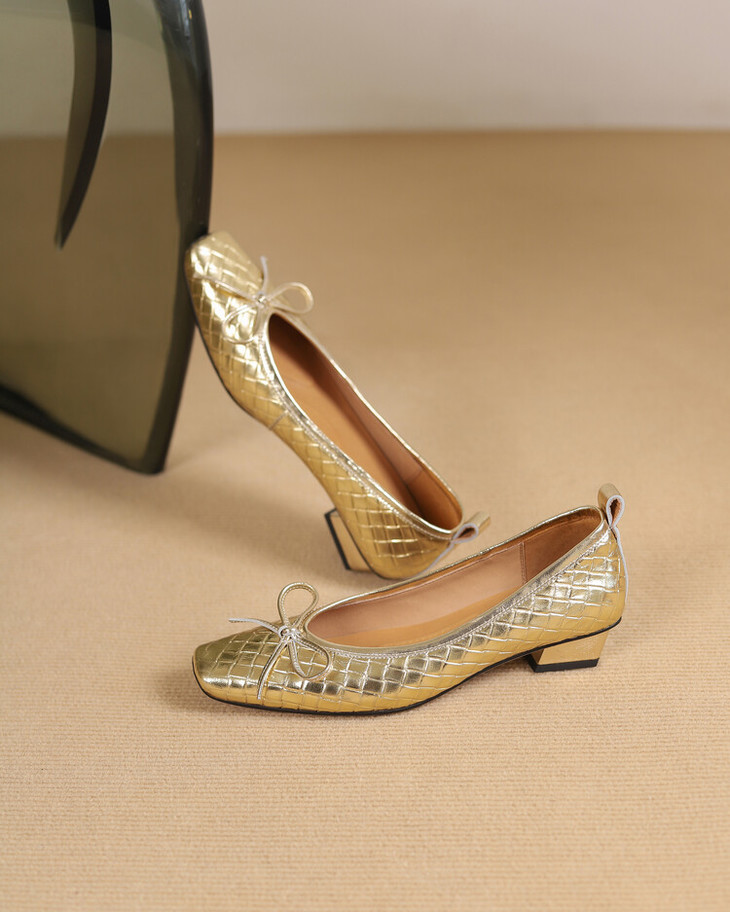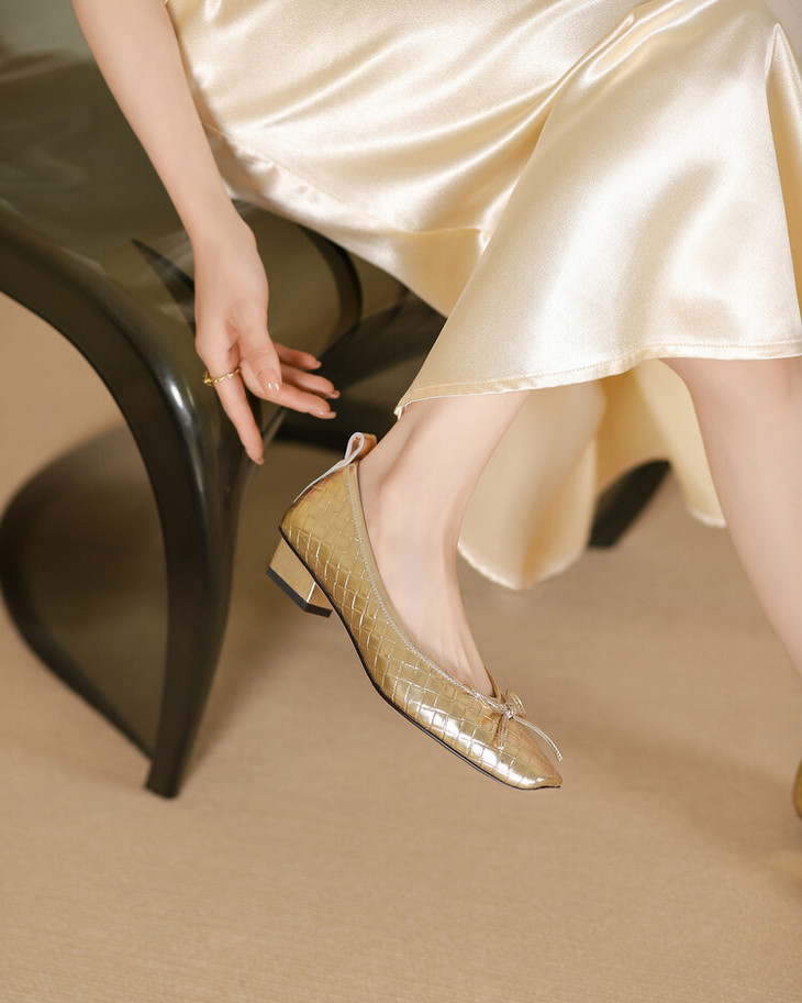 【预售5天】法式简约方头浅口编织纹羊皮低跟单鞋甜美蝴蝶结优雅舒适四季女鞋DTN&A1038-19
