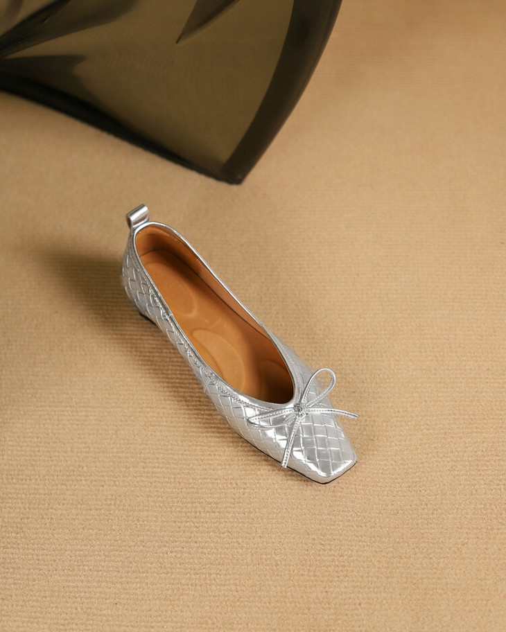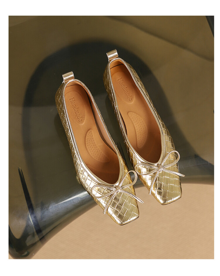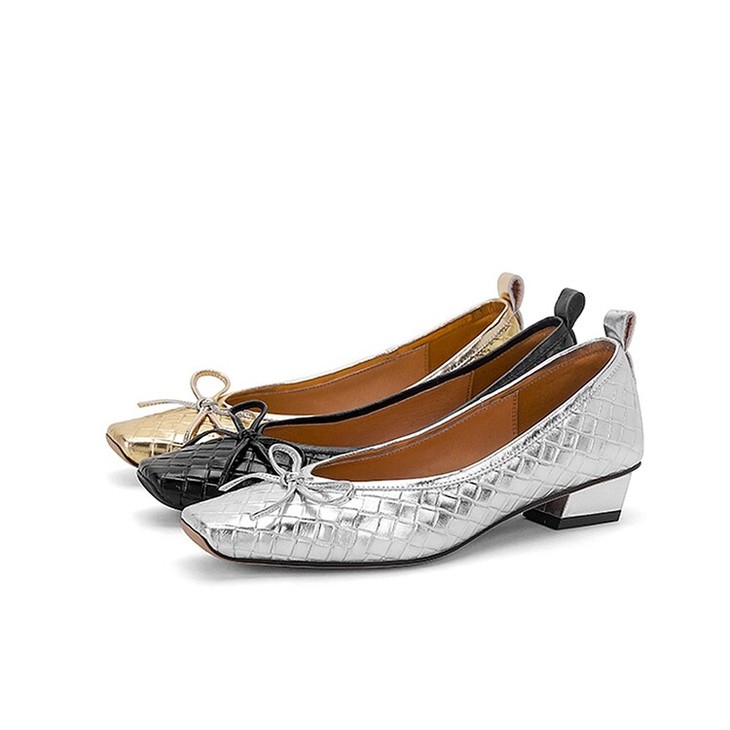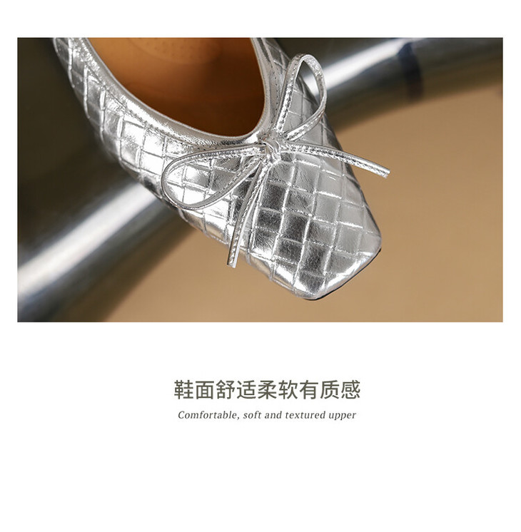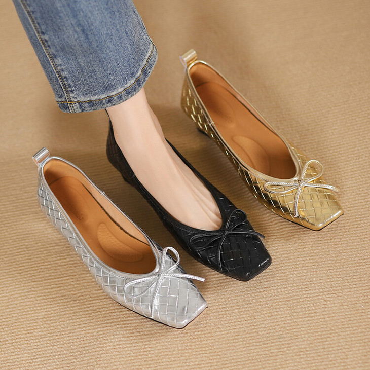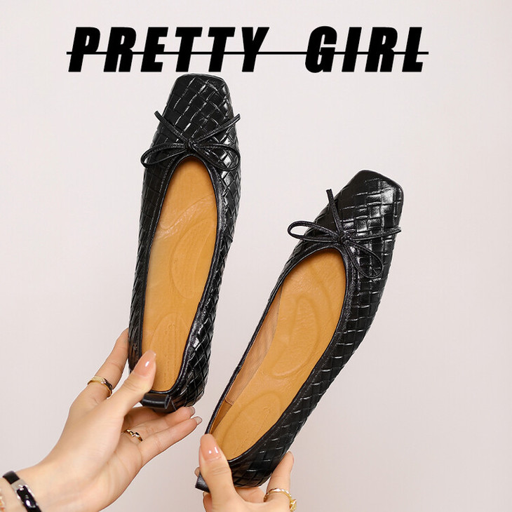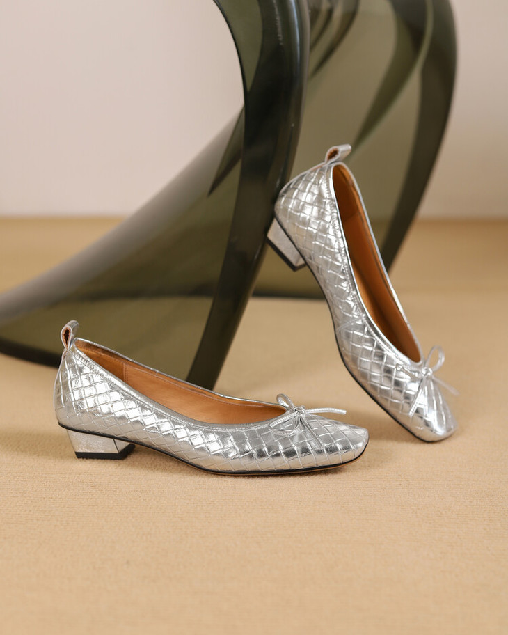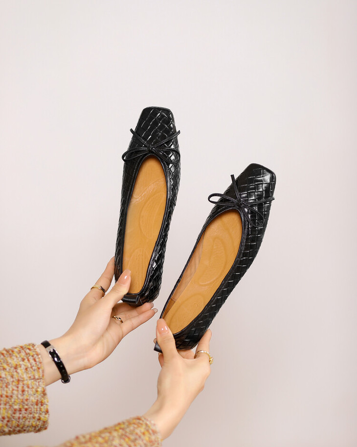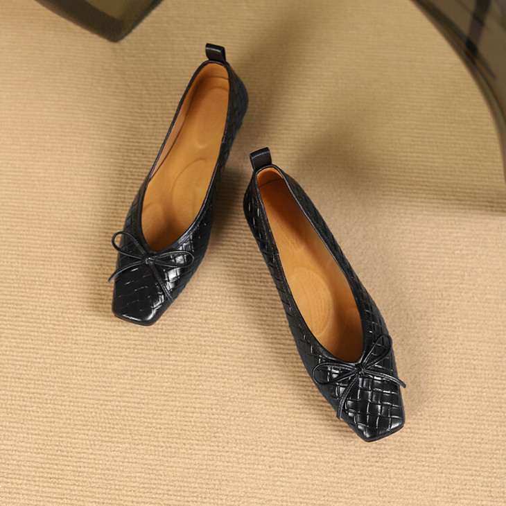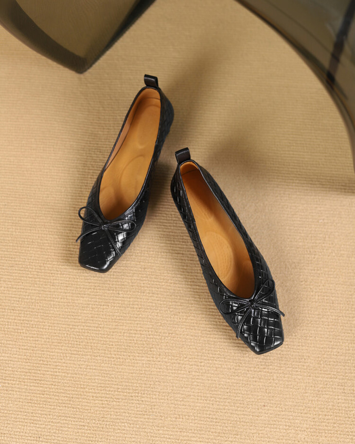 【预售5天】法式简约方头浅口编织纹羊皮低跟单鞋甜美蝴蝶结优雅舒适四季女鞋DTN&A1038-19