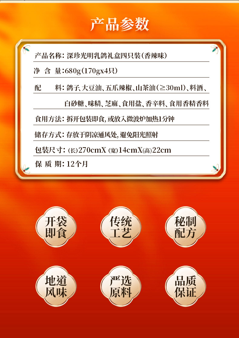 深圳手信深珍光明乳鸽香辣味170g*4只装