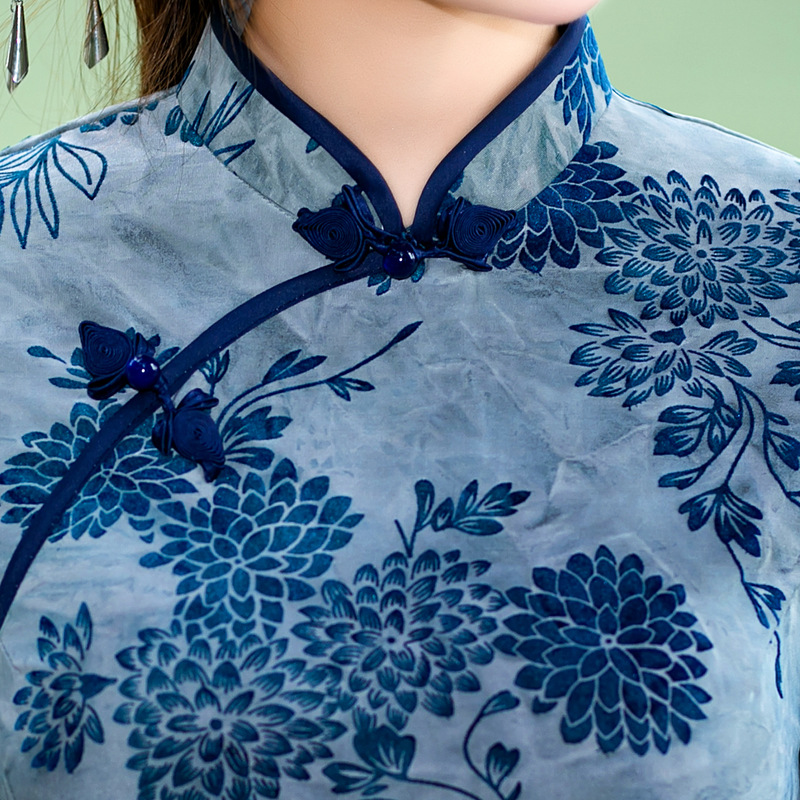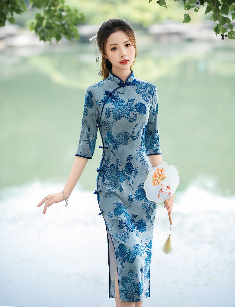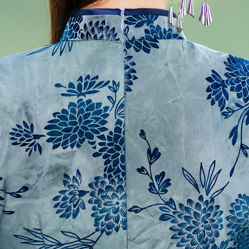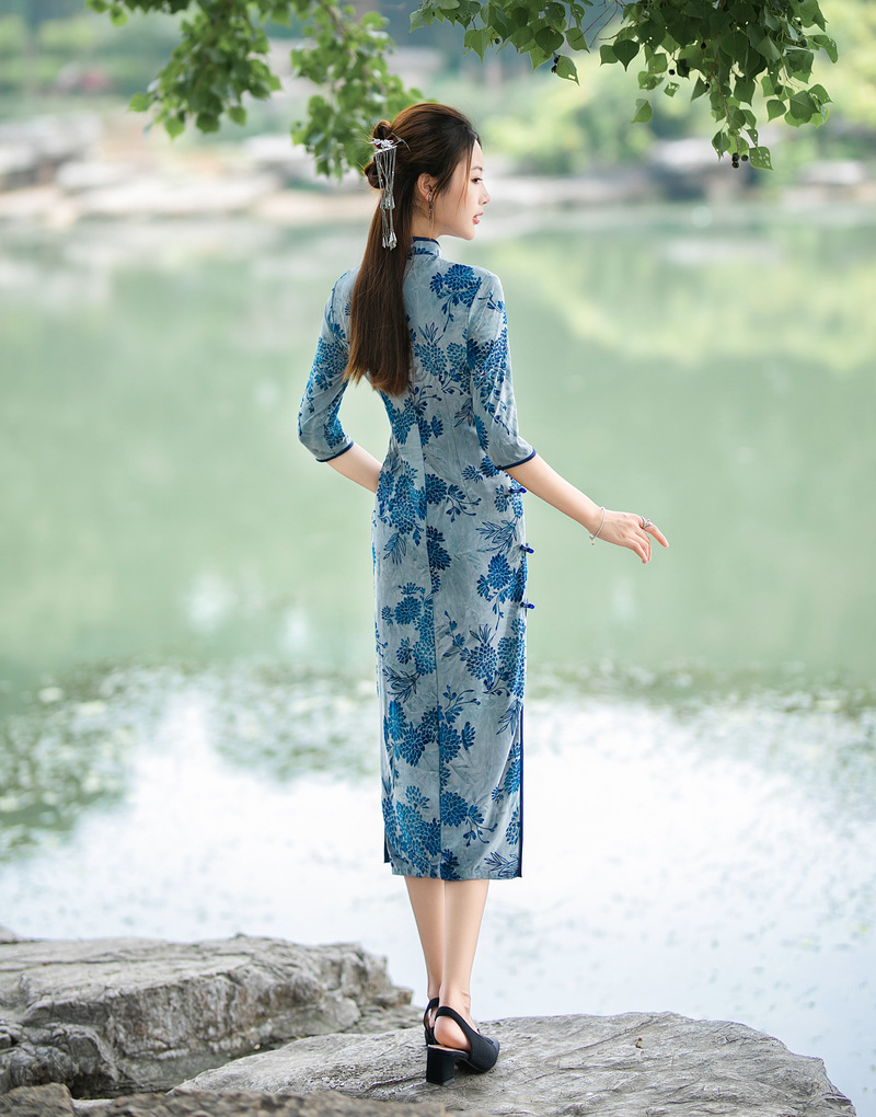 日常复古,秋冬长款双层雪尼尔七分袖旗袍改良植绒旗袍ZA-5181