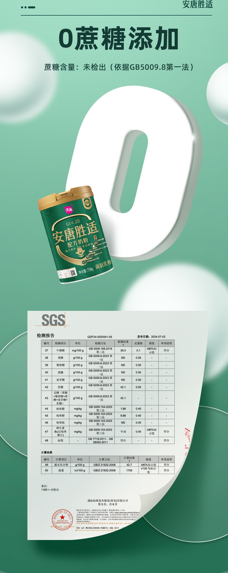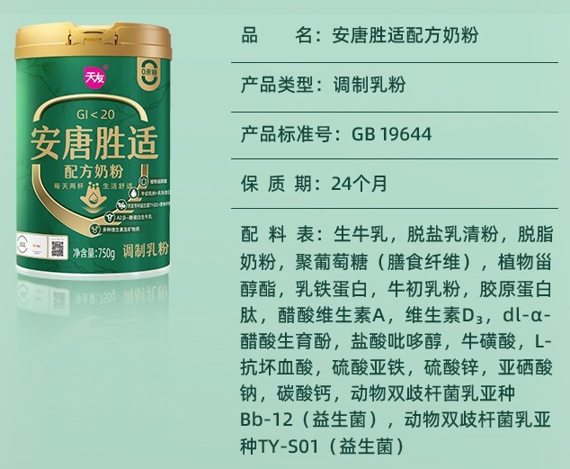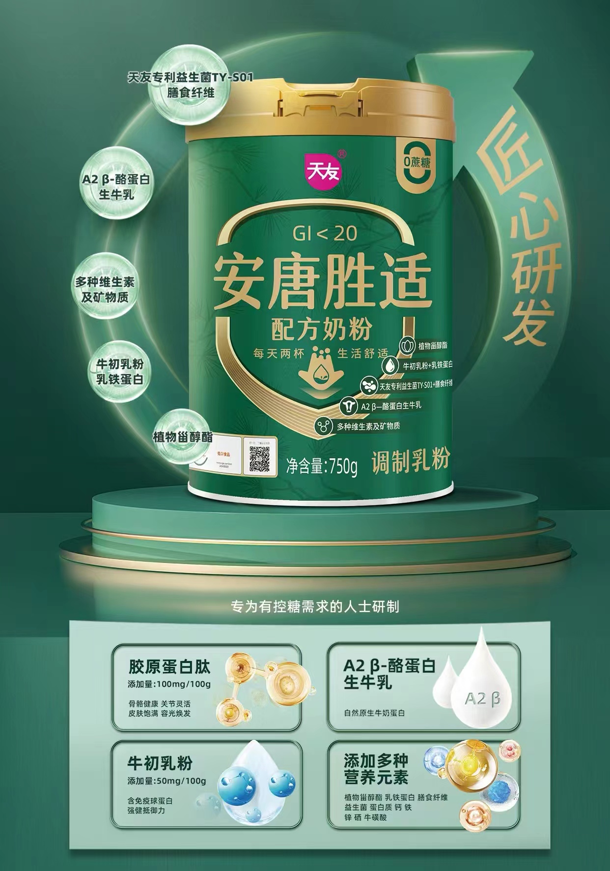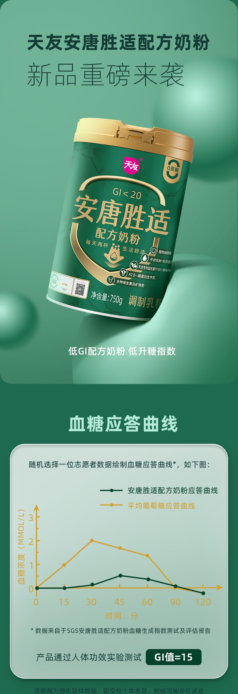 天友安唐胜适低GI配方奶粉比国家低GI要求高出1.5倍(国家要求小于等于55,天友小于等于20)