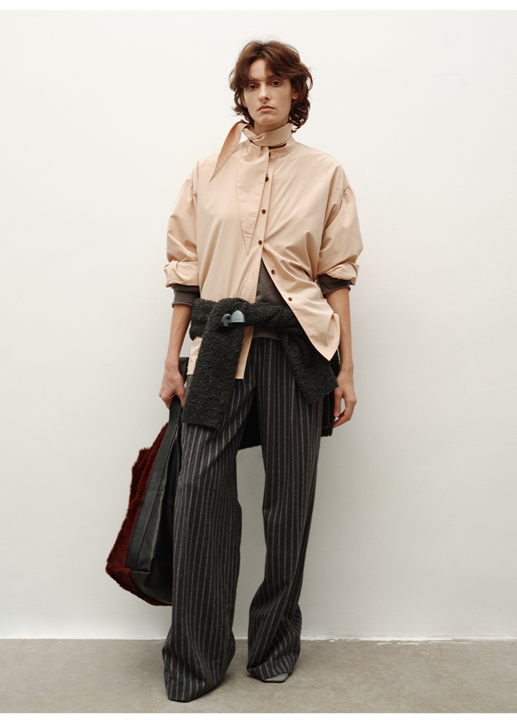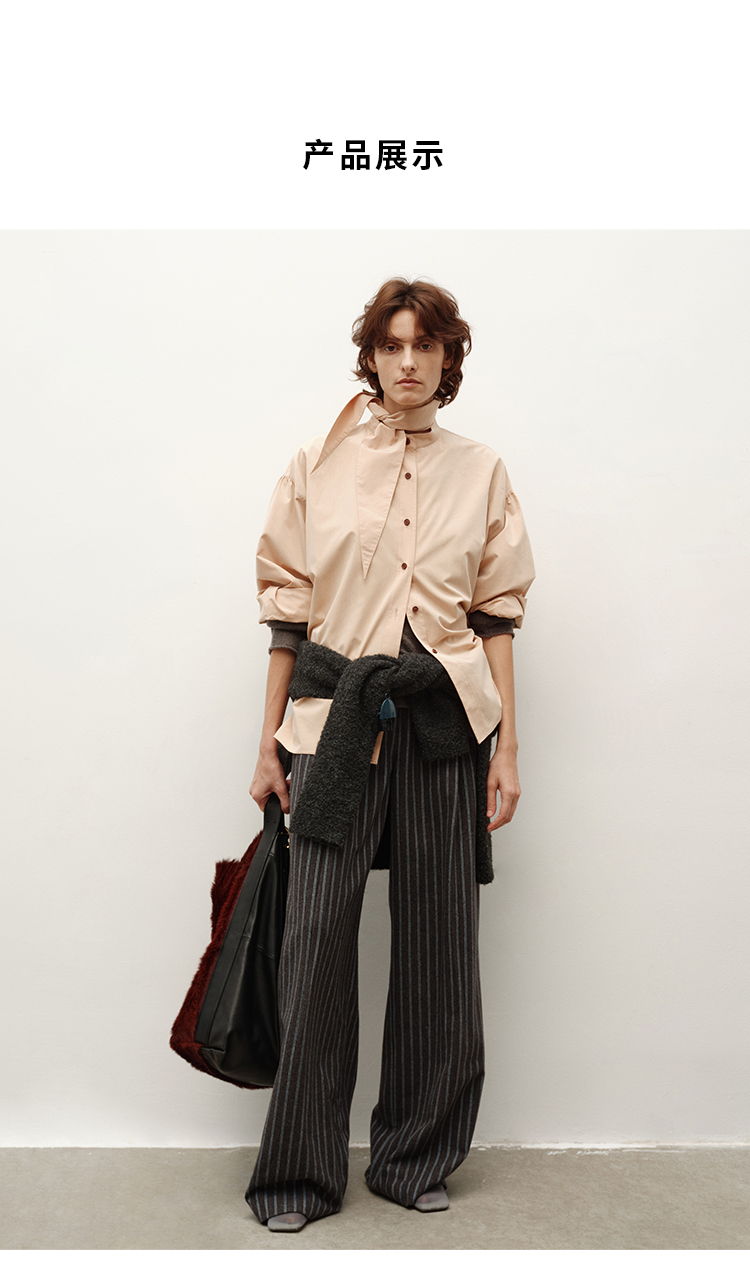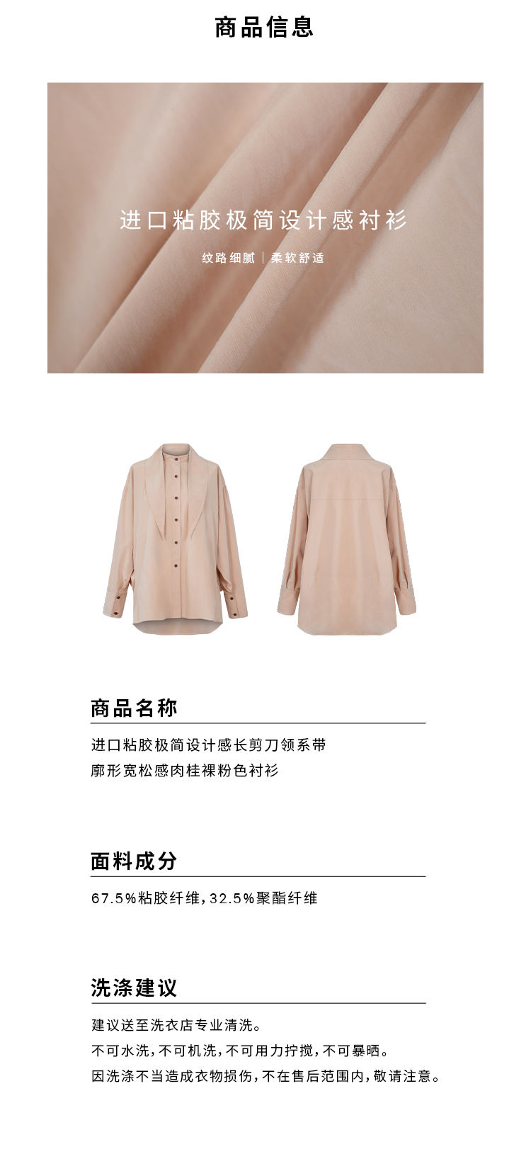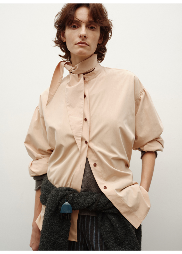 HIDEMI 进口粘胶极简设计感长剪刀领系带廓形宽松感肉桂裸粉色衬衫