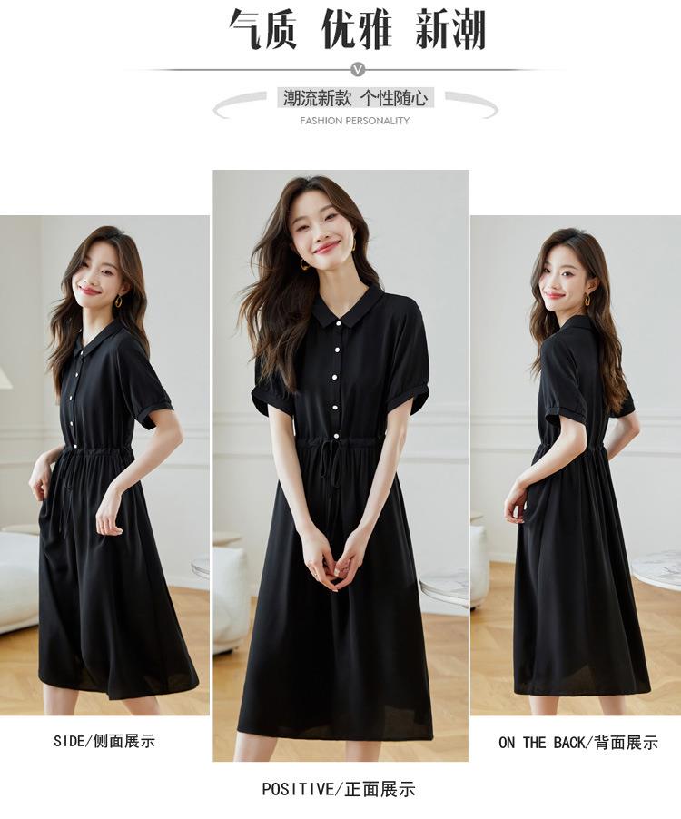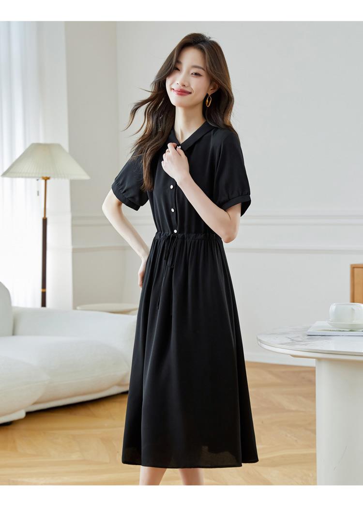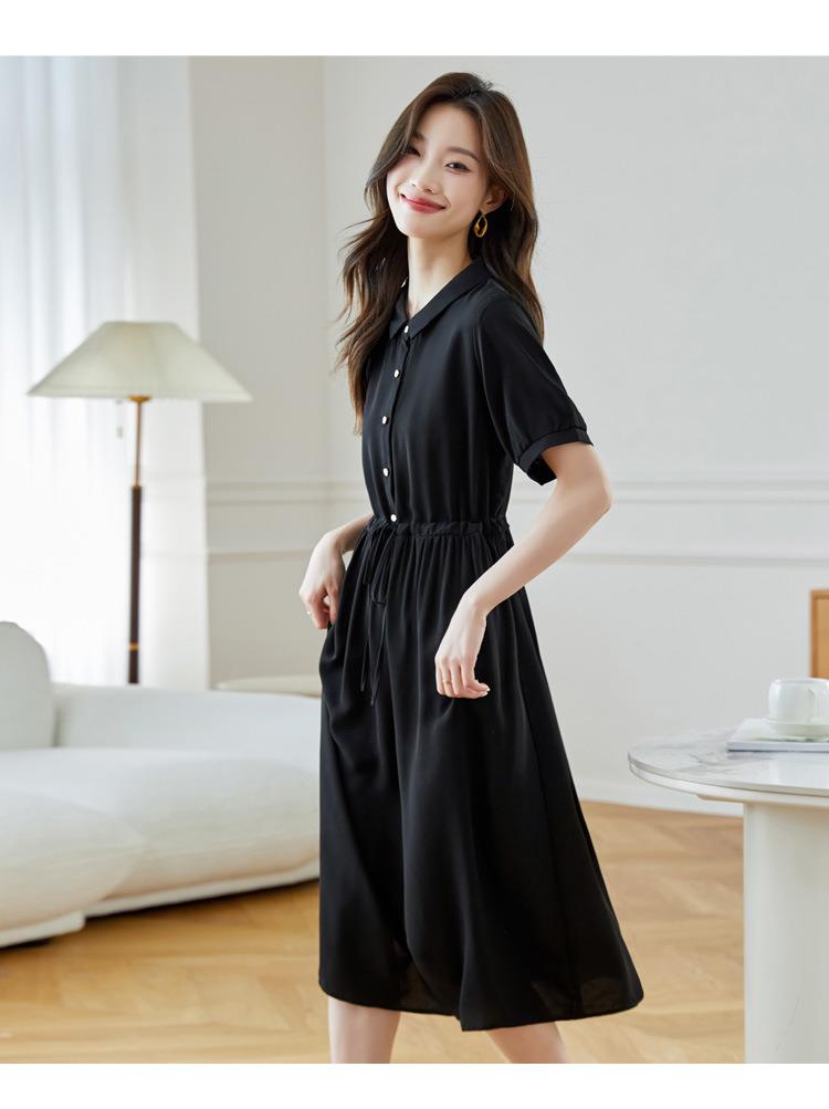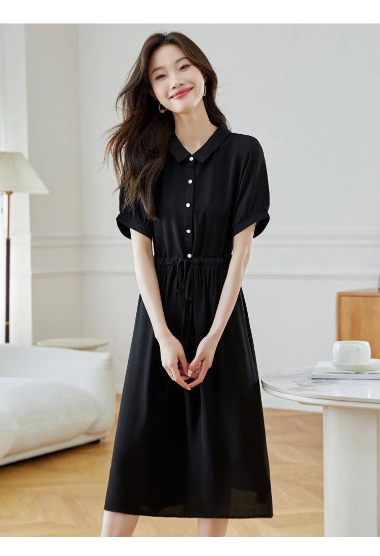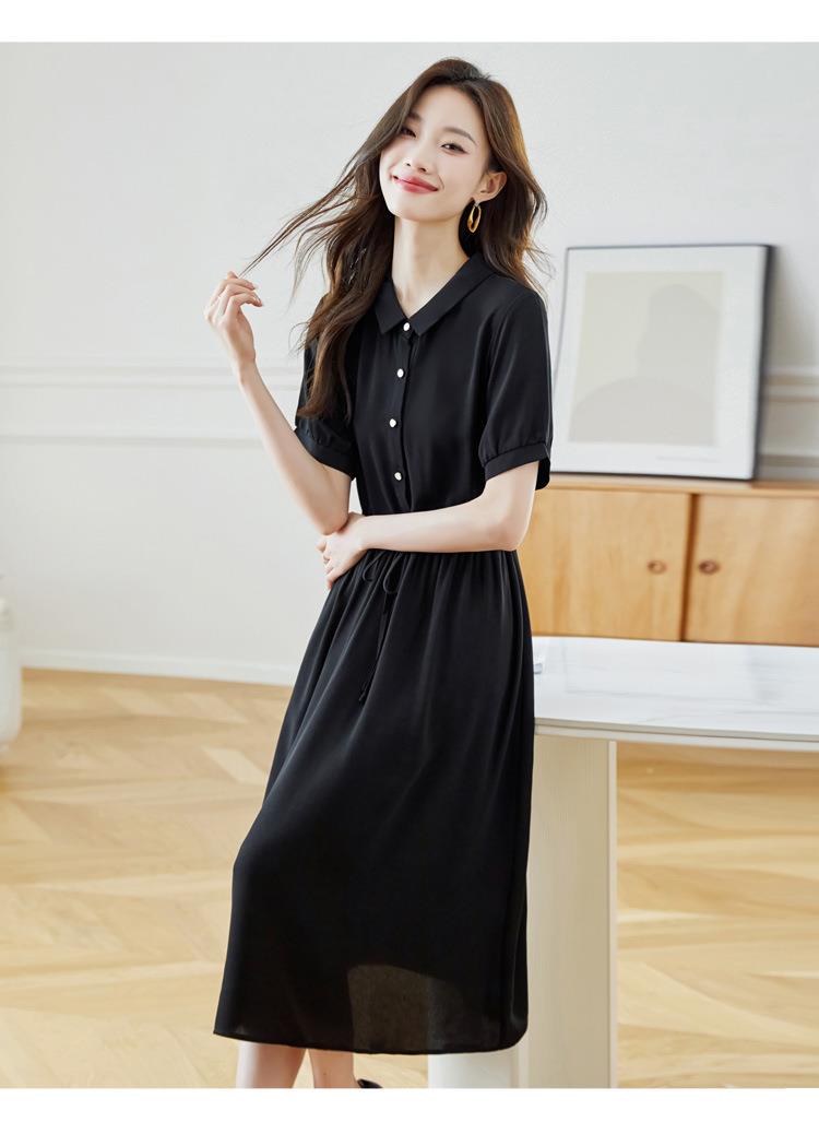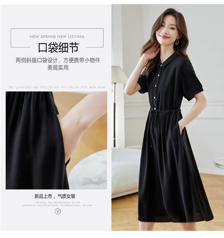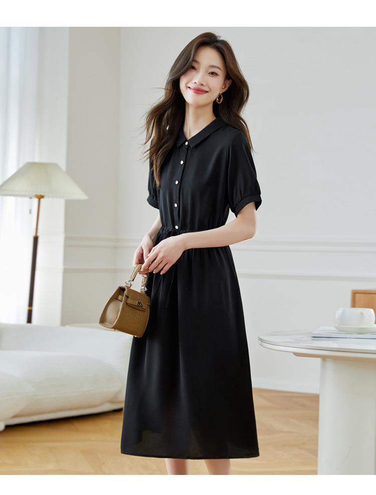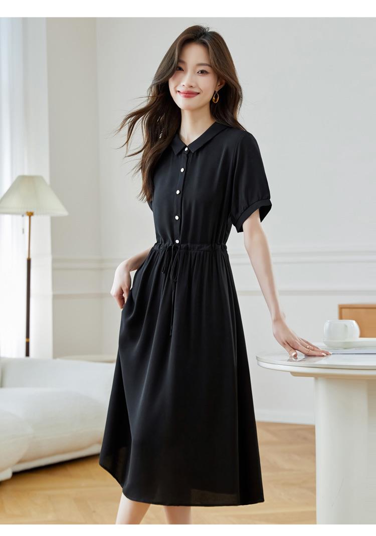 法式衬衫连衣裙女短袖2024夏新款赫本风黑色收腰显瘦气质雪纺长裙