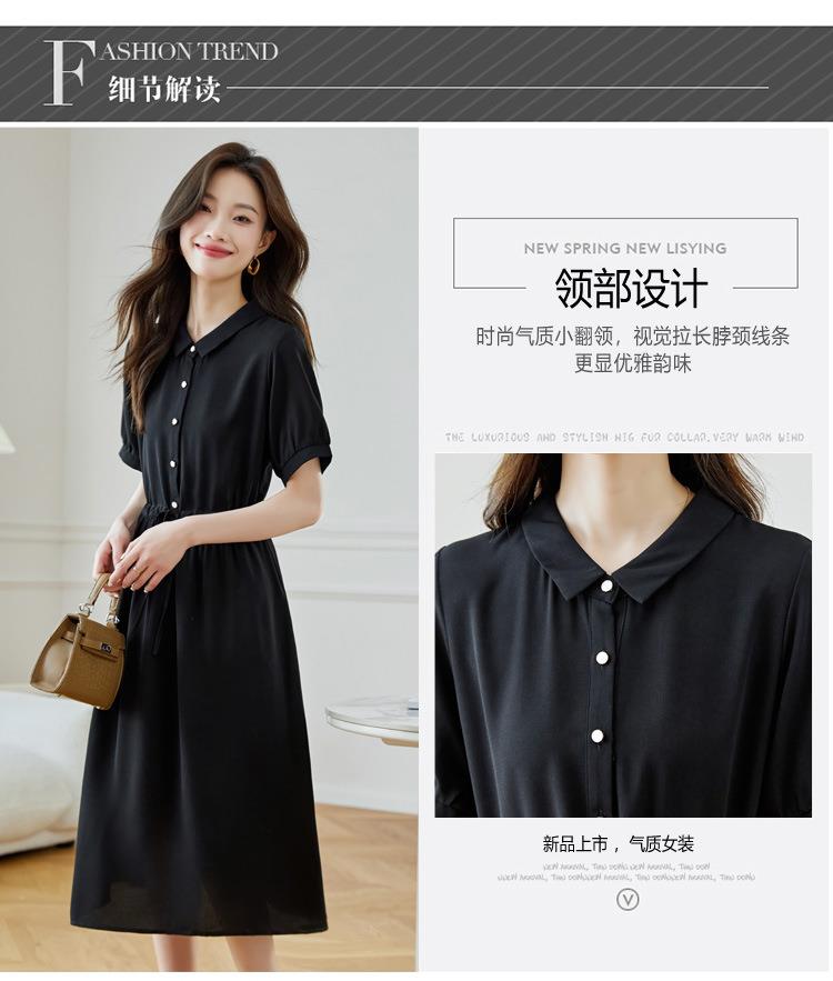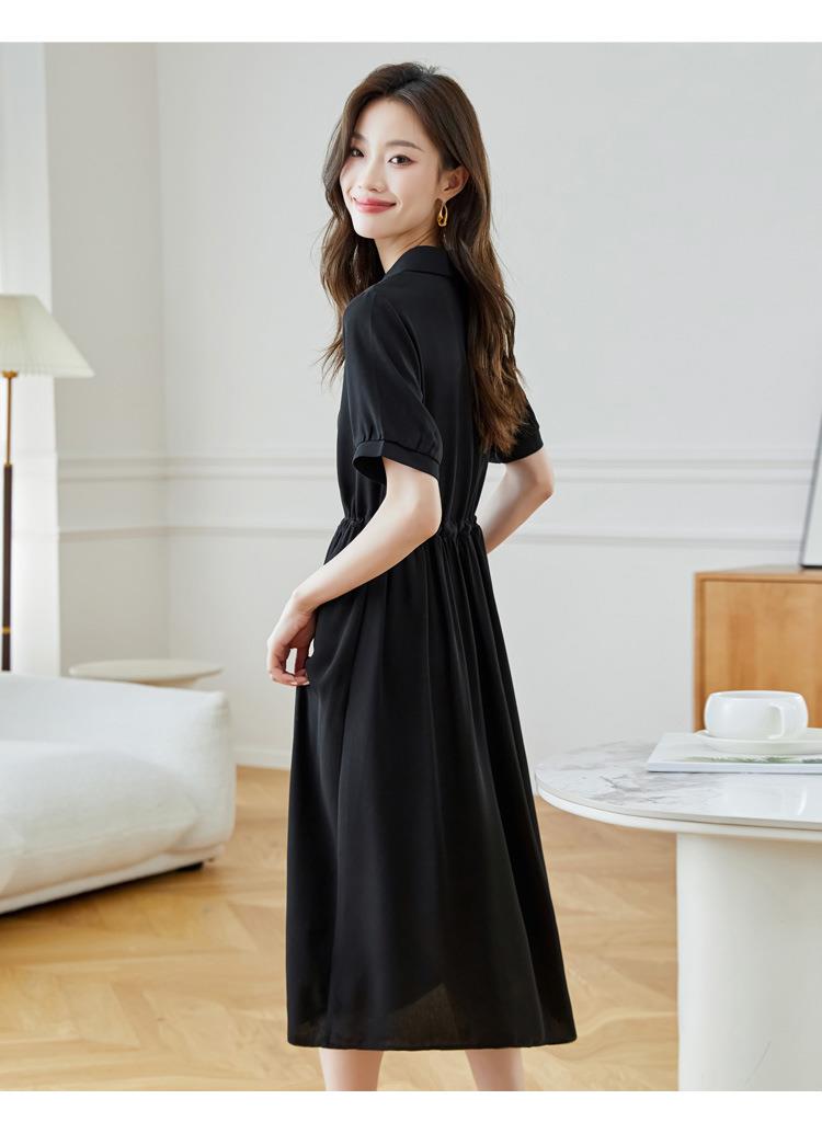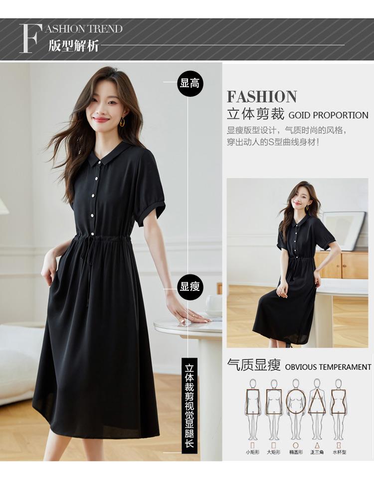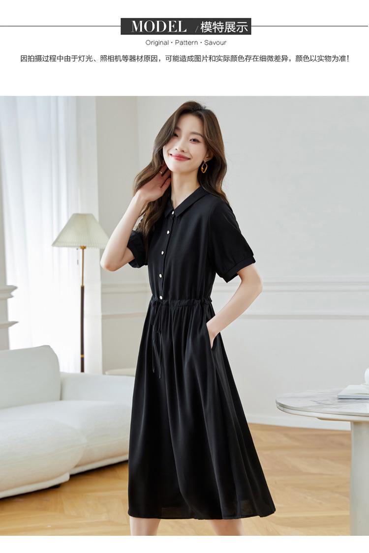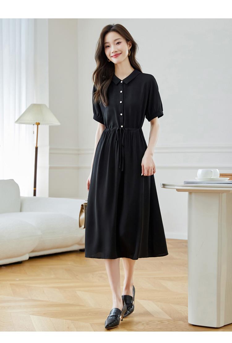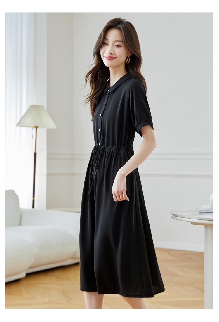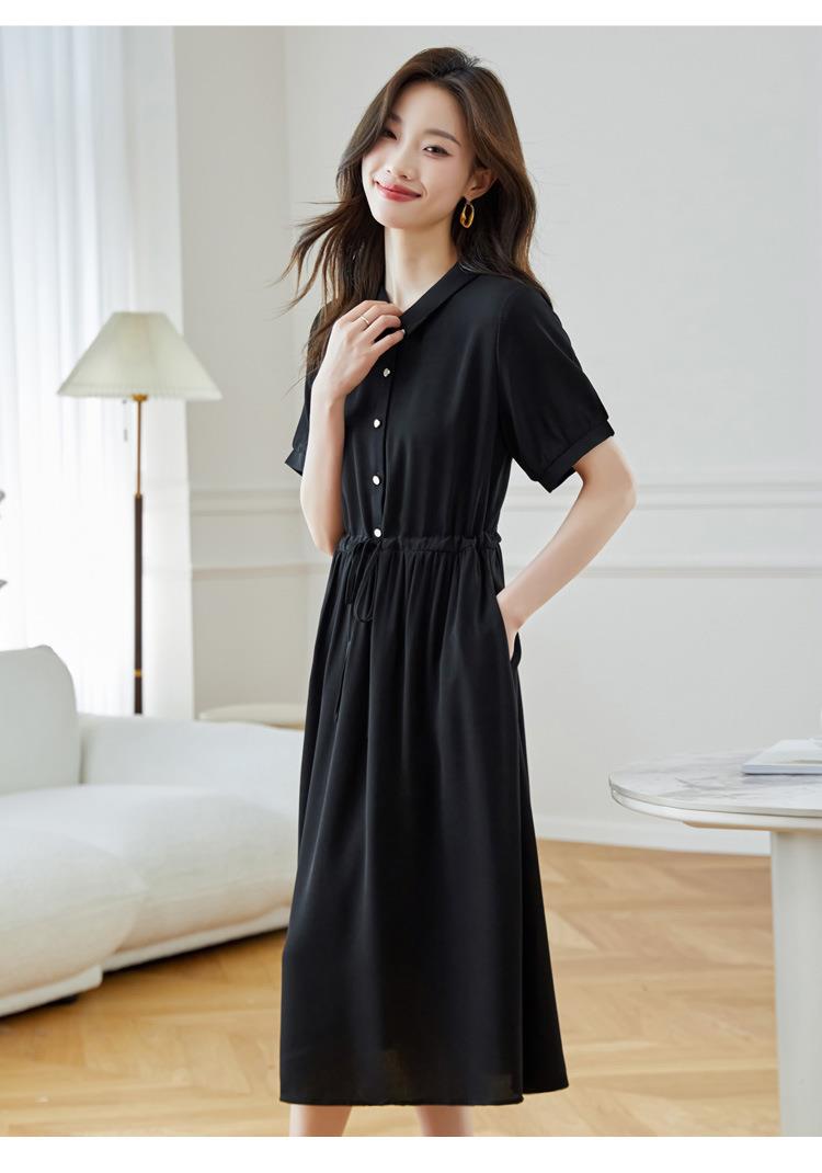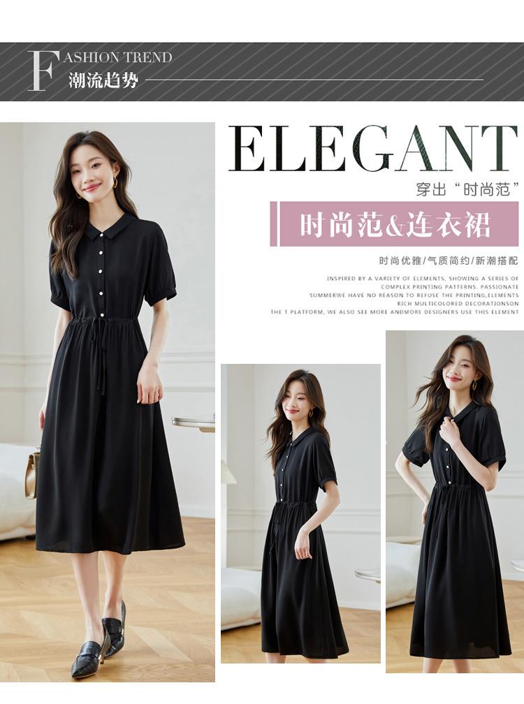 法式衬衫连衣裙女短袖2024夏新款赫本风黑色收腰显瘦气质雪纺长裙