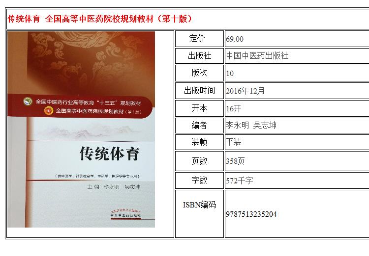 正版 传统体育 全国高等中医药院校规划教材(第十版)十三五规划教材 中国中医药出版社9787513235204