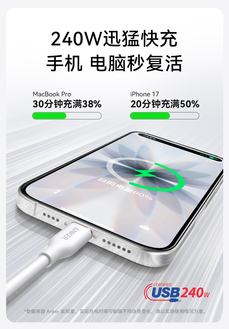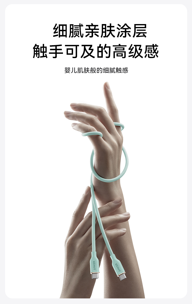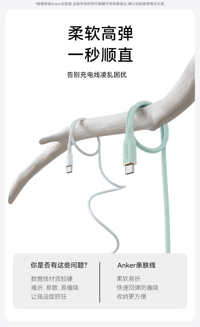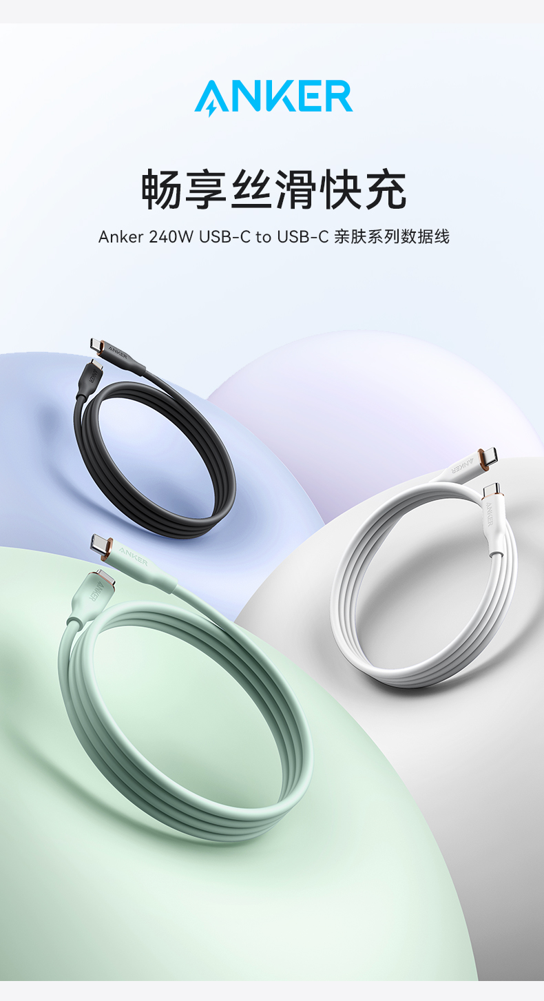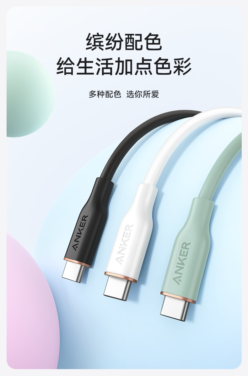 【热销】Anker安克 240W双Type-C硅胶亲肤数据线 PD快充线适用于华为小米1.8米 A8553