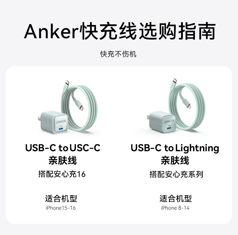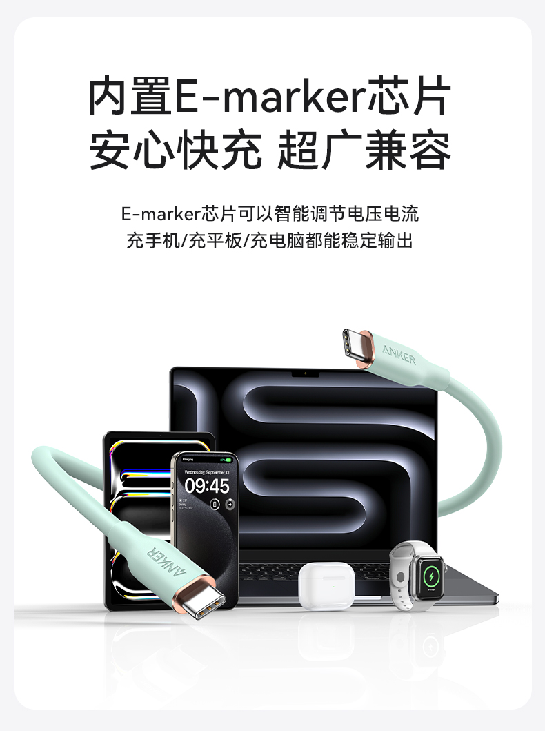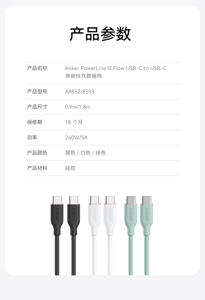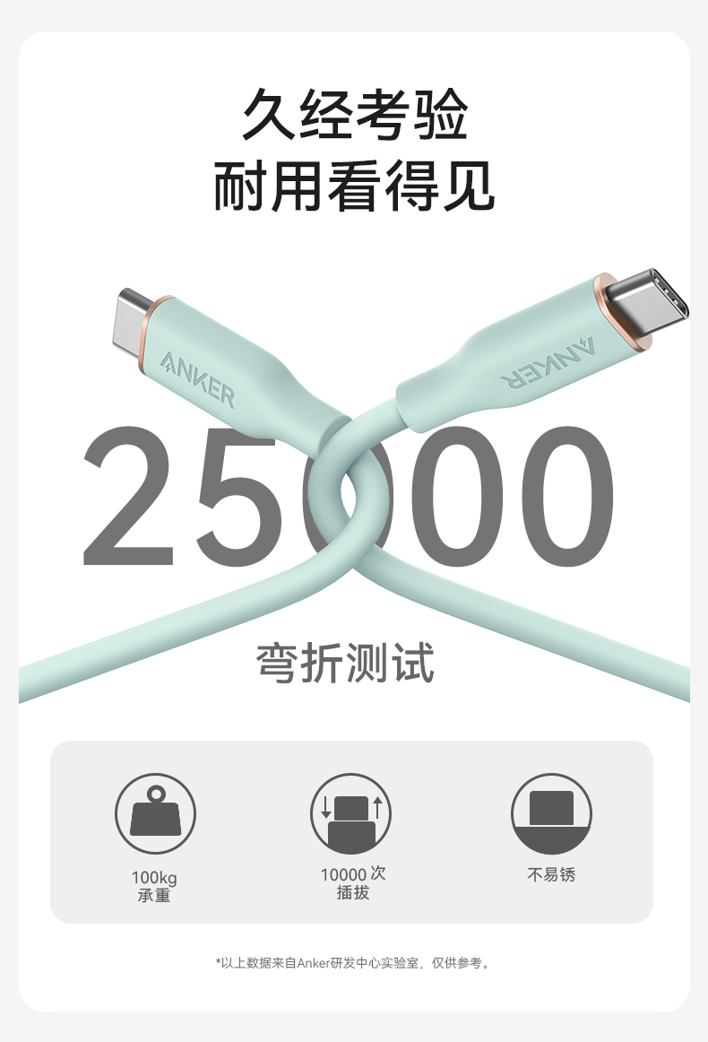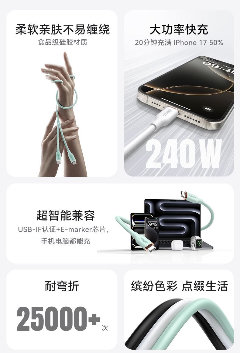 【热销】Anker安克 240W双Type-C硅胶亲肤数据线 PD快充线适用于华为小米1.8米 A8553