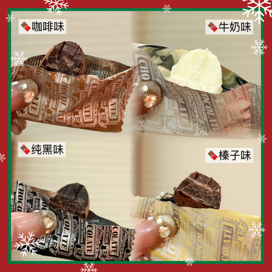 🍫招牌原味:余味甜美清香,口感甜润,芬芳馥郁,感觉就像穿着圣诞裙的小姑娘,喜欢巧克力的宝子们闭眼入 。 🍫咖啡味:醇厚丝滑,令人上头,品味经典,咖啡爱好者必入,每口都让你大喊WOW! 🍫榛子味:入口即化的口感,真的是感觉在吃“酱”,丝滑纯正,难以释怀的美味 🍫牛奶味:牛奶的香气香甜和巧克力的口感,甜而不腻,就是童年的味道