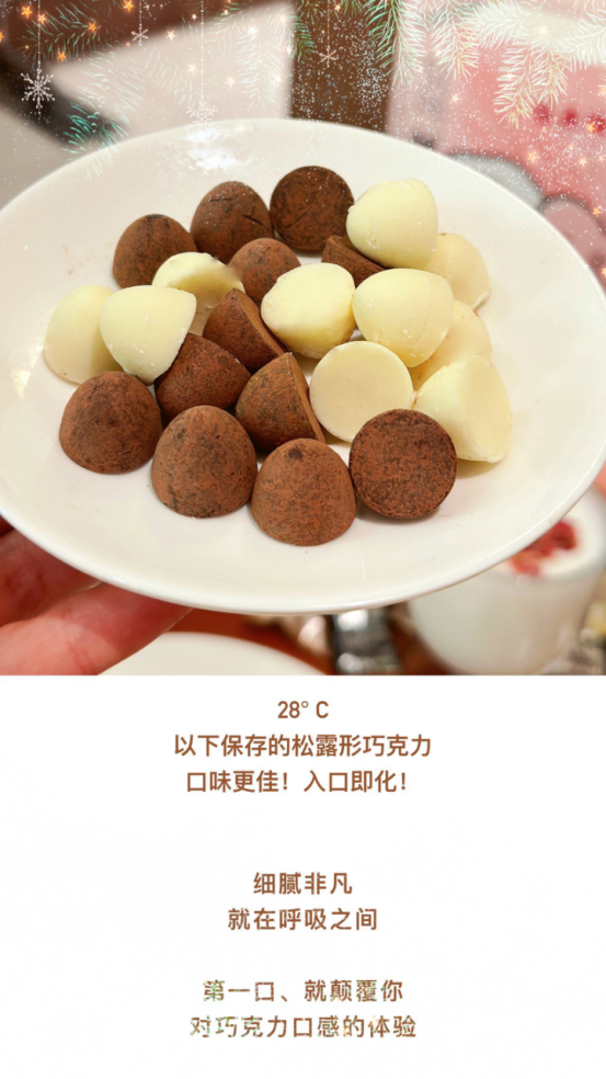 冬天啦,大家多吃点巧克力暖暖身子呀甜食还可以治愈坏心情呢把一整块巧克力含在嘴里,满满的幸福感 一口咬下去超满足,甜度适中巧克力味超浓郁当原汁原味的巧克力像雪花一样在口中融化 口感绝了是无法抗拒的感官盛宴标准每一口都是恰到好处的浓郁每一口都丝滑纯正 带一点点微苦和微甜一口一个超过瘾经过烘焙的巧克力撒上可可粉甜中带点不易察觉的苦 最后入喉却只剩下满口醇香 是松露巧克力复杂且独有的风味 口腔里绽放的丝滑和甜带来的多巴胺, 每吃上一口都能获得双倍快乐