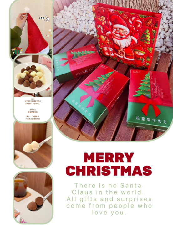 每一颗松露巧克力都是独立包装,干净卫生,方便储存和随身携带美味随时随地分享 每盒赠送一顶圣诞帽,氛围感拉满 经典松露造型,每颗外表都有一层松软的可可粉入口丝滑香浓,一口一个根本停不下来