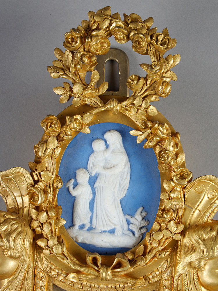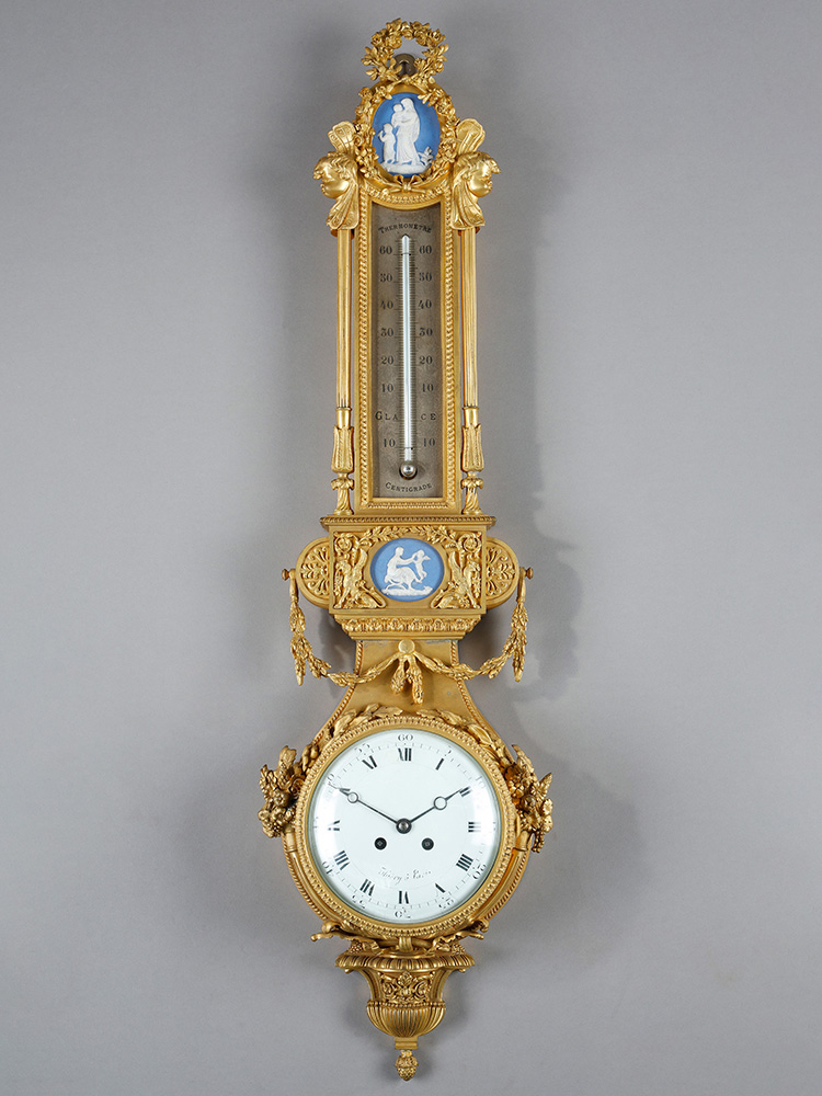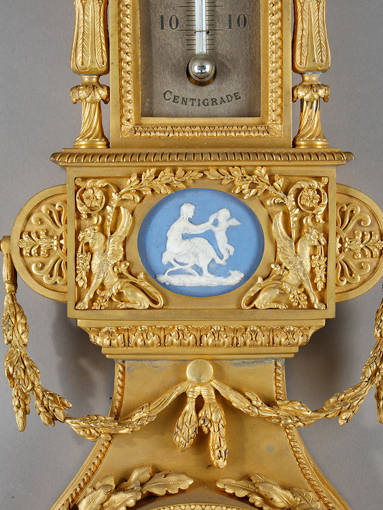 1880年代法国出品路易十六风格铜鎏金装饰嵌韦奇伍德瓷板晴雨表挂钟