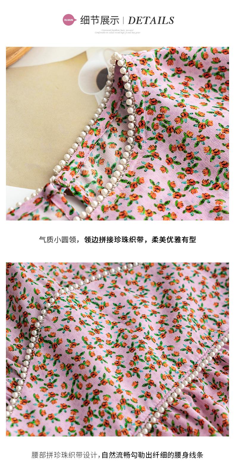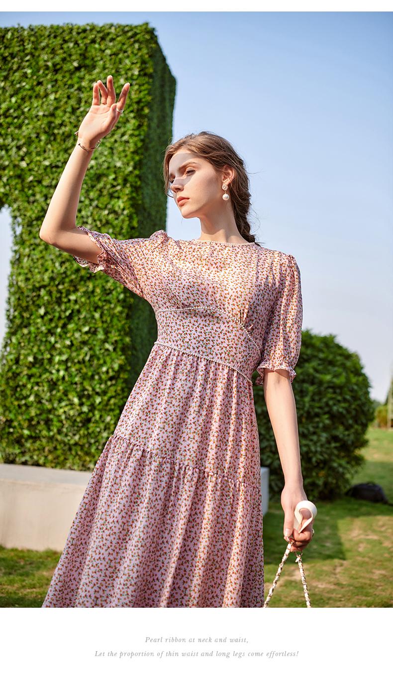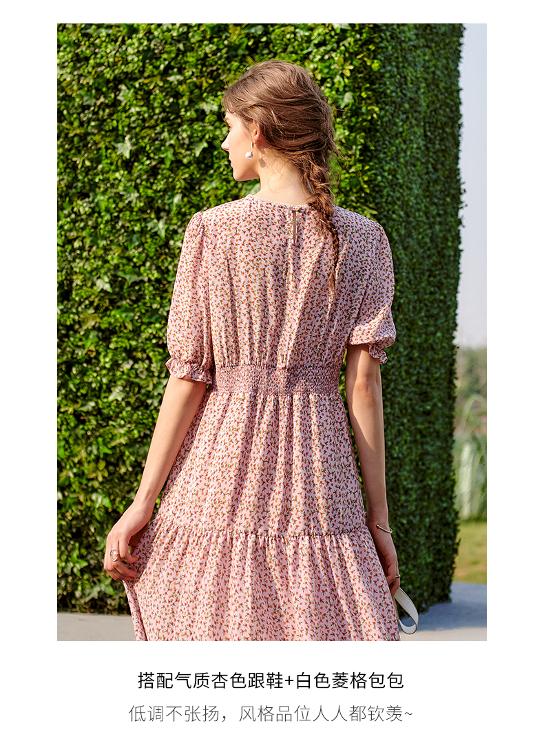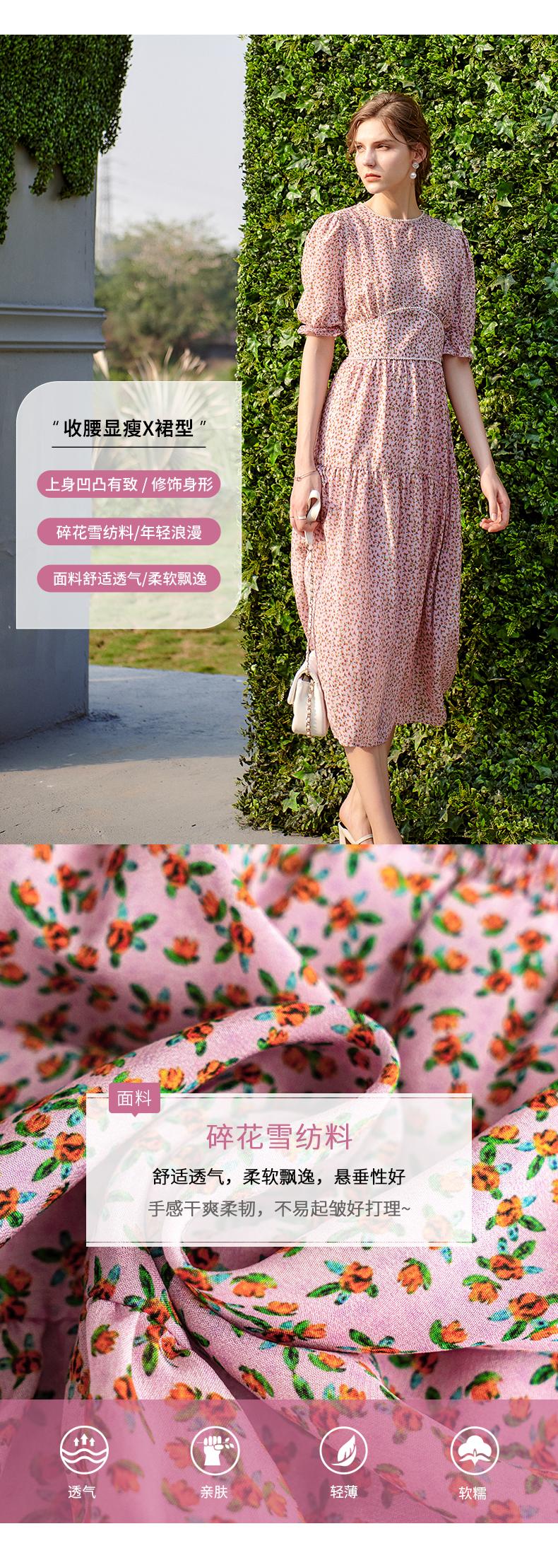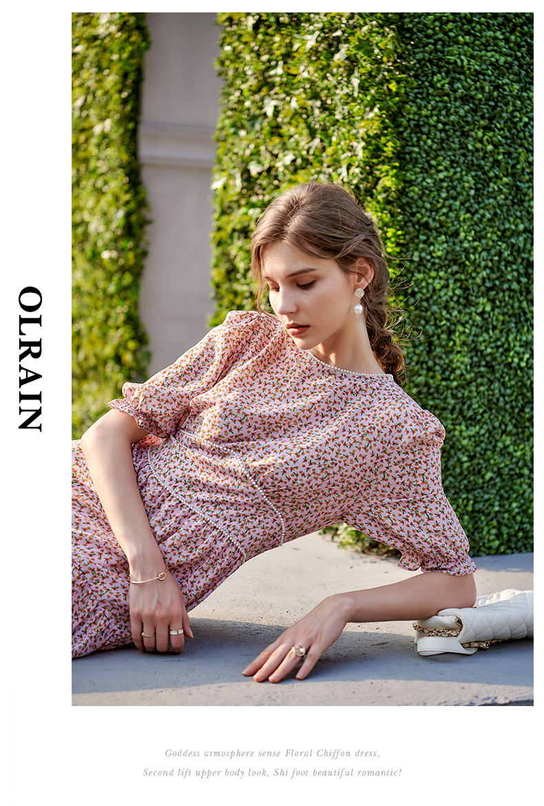 欧芮儿雪纺碎花连衣裙女2021新收腰气质短袖法式长款过膝裙子
