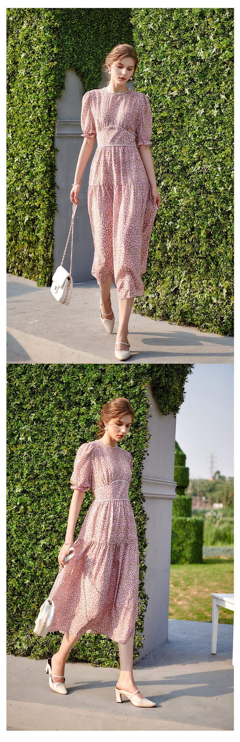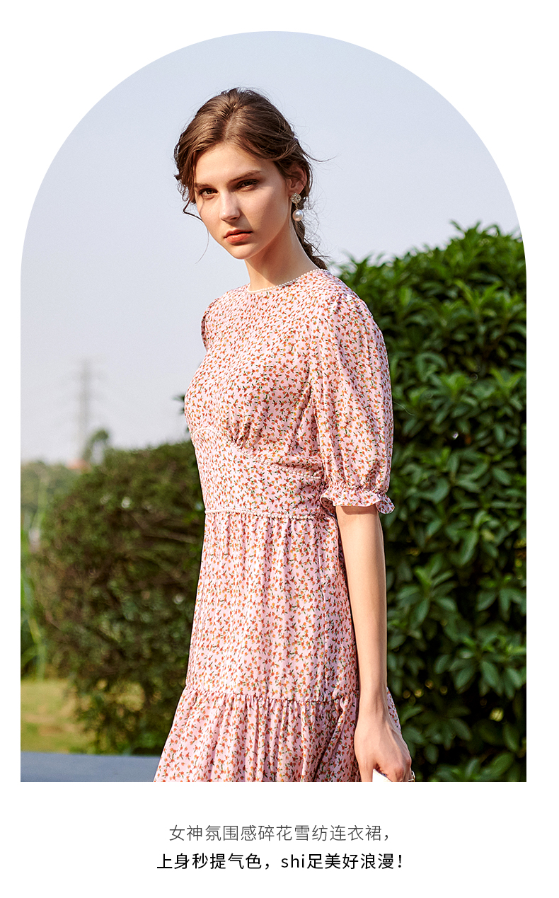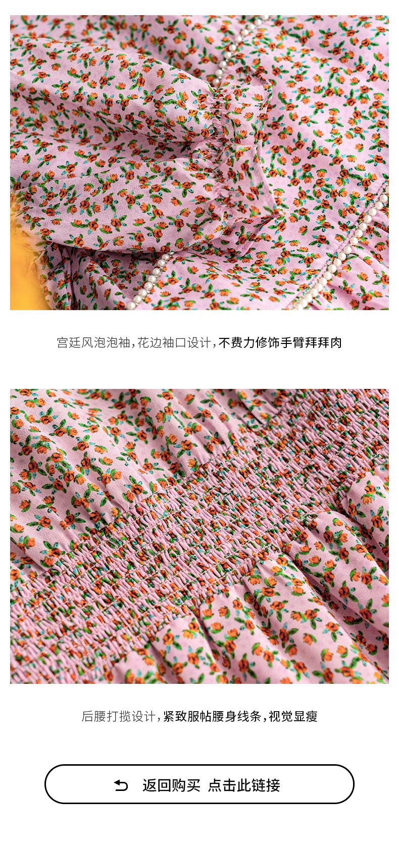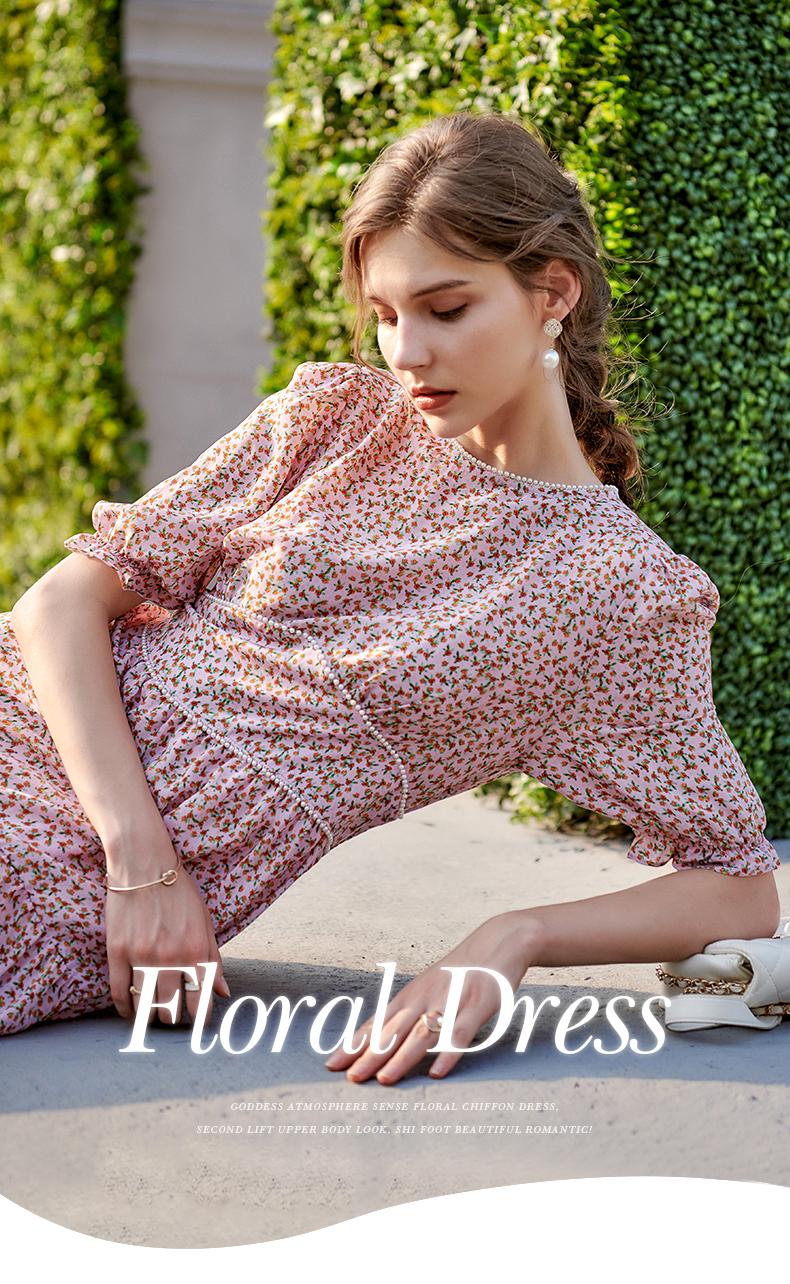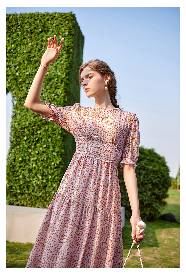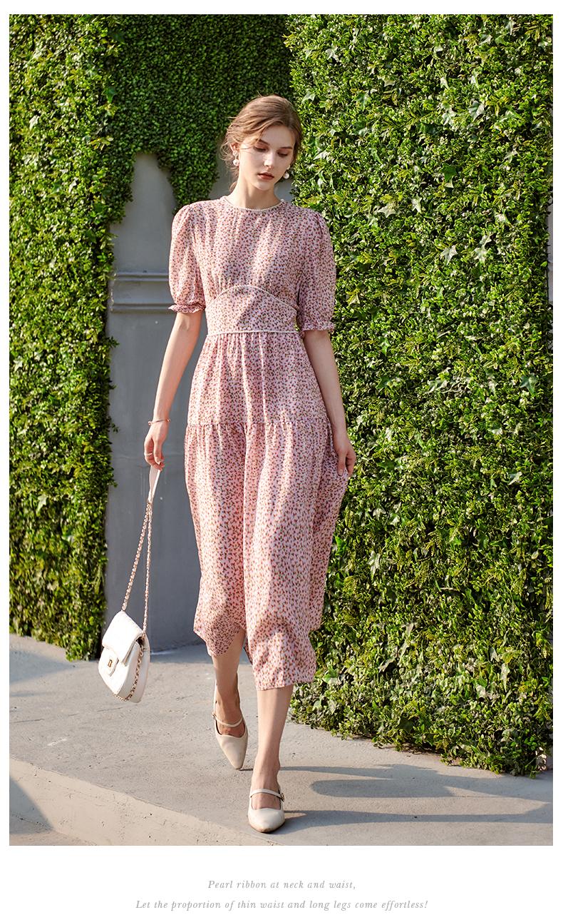 欧芮儿雪纺碎花连衣裙女2021新收腰气质短袖法式长款过膝裙子