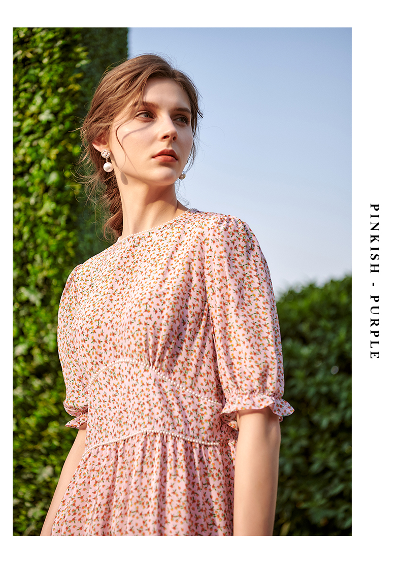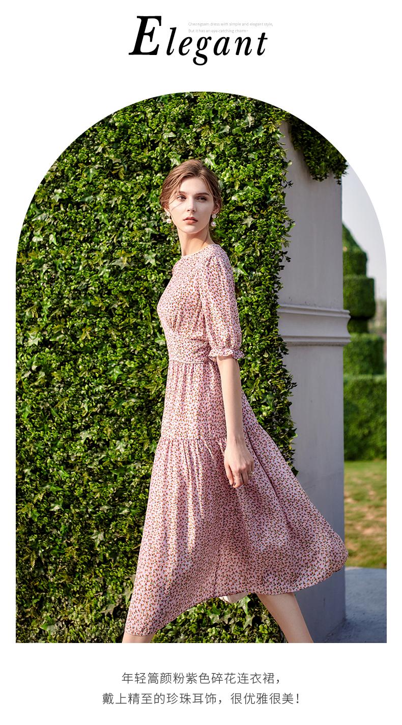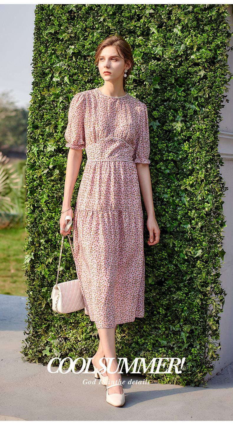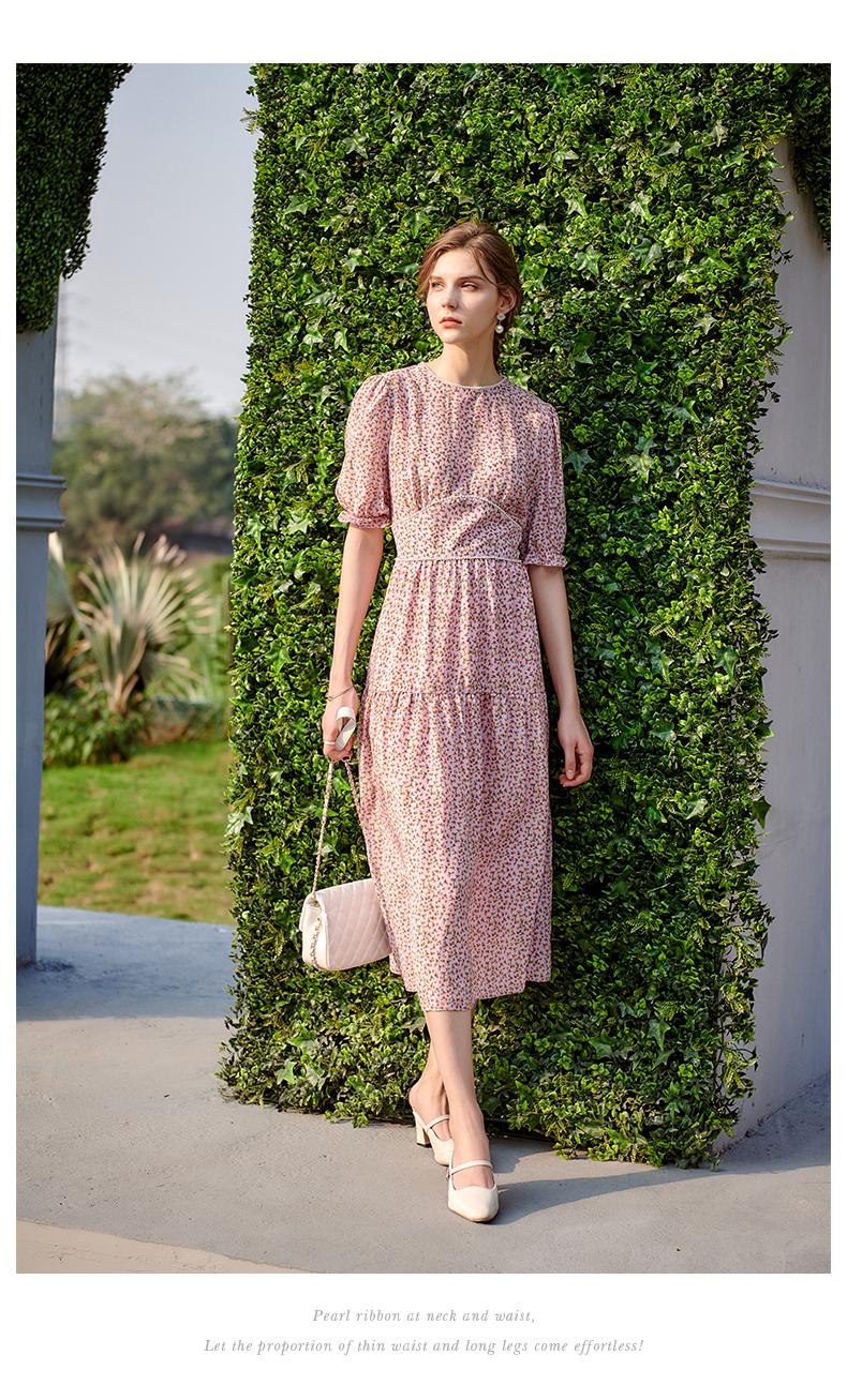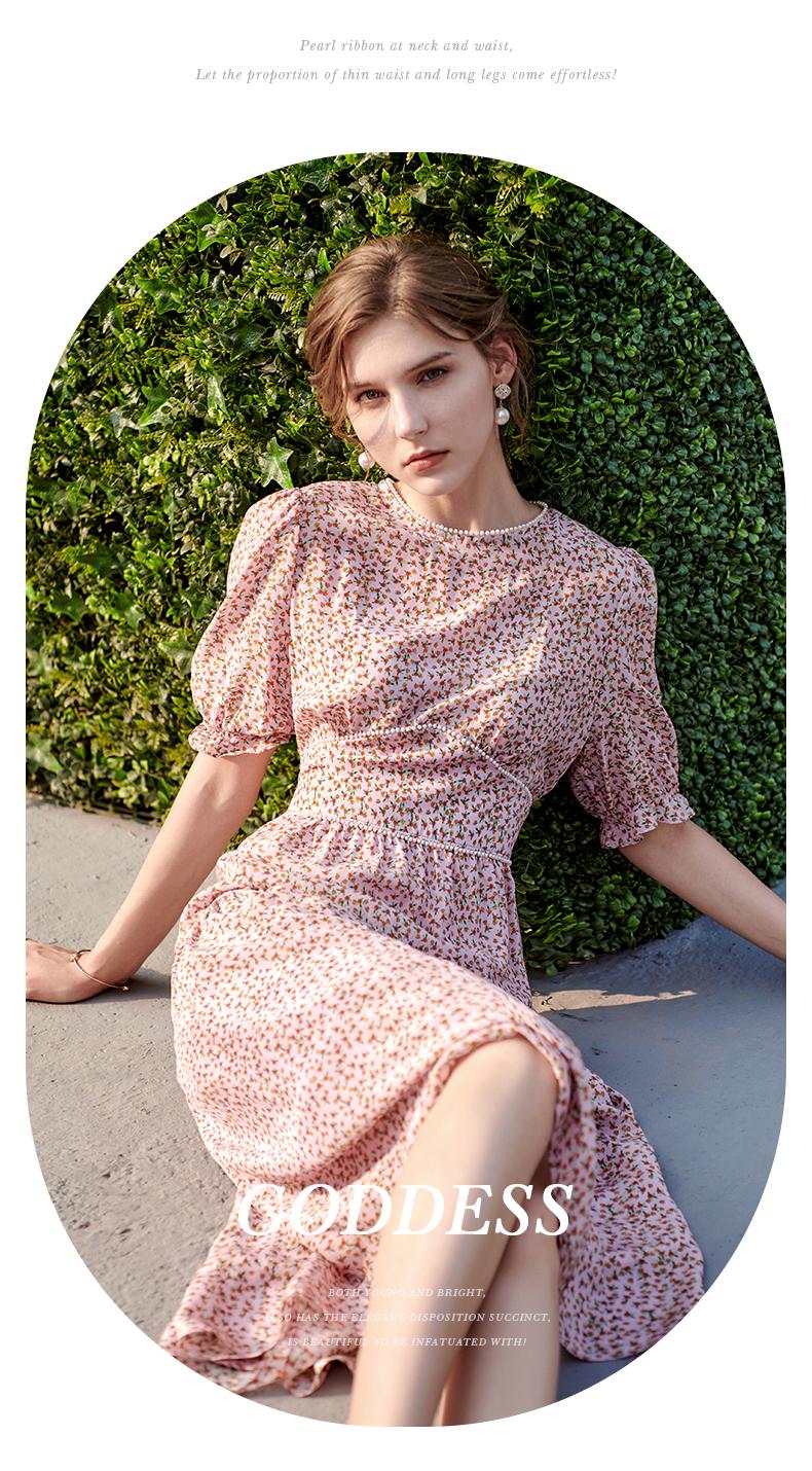 欧芮儿雪纺碎花连衣裙女2021新收腰气质短袖法式长款过膝裙子