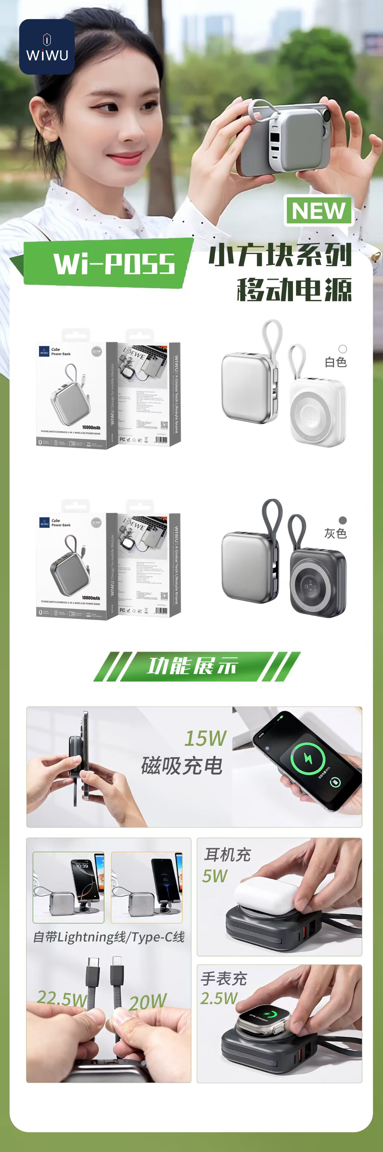 【仅拆封】唯吾小方块系列Wi-P055移动电源手机耳机手表无线充自带L+C线