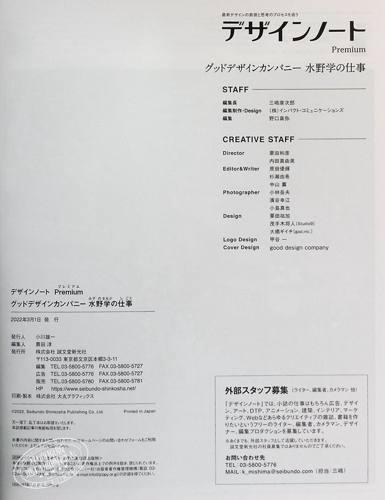 コロナの時代となり、ますます数多の企業、団体は苦悩し、分かってはいるが踏み出せなかったブランディングに本気で取り組むようになってきました。そんな中、ブランディングデザインの一人者、クリエイティブディレクター水野氏、そして氏が主宰するグッドデザインカンパニーは、質、量ともに高次元でクライアントの要求を満足させ続けています。同誌では進化し成果を出し続ける水野氏の仕事を、ふんだんなビジュアルと明快な解説で、その洗練され、見事に本質を突くブランディングデザインのロジック、表現を学ぶことができます。まさに、水野学という1人のクリエイターの本質に迫る一冊となります。