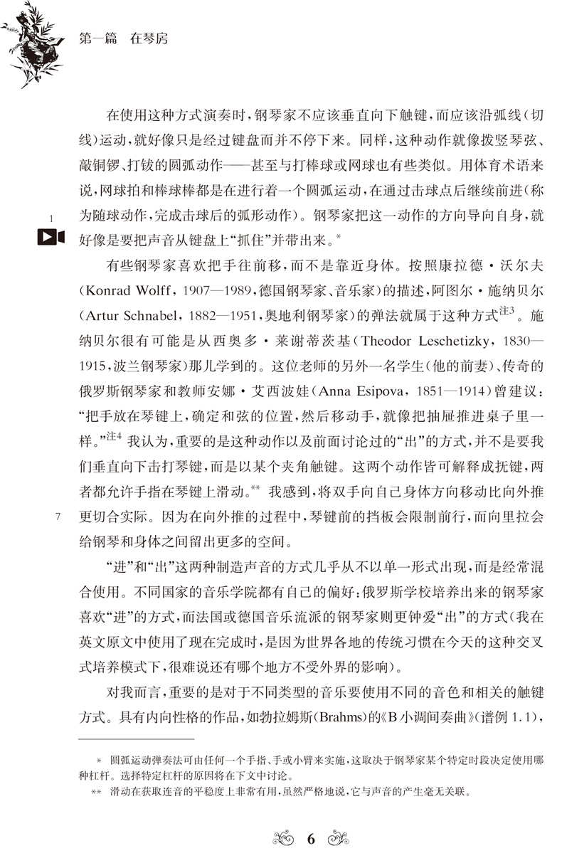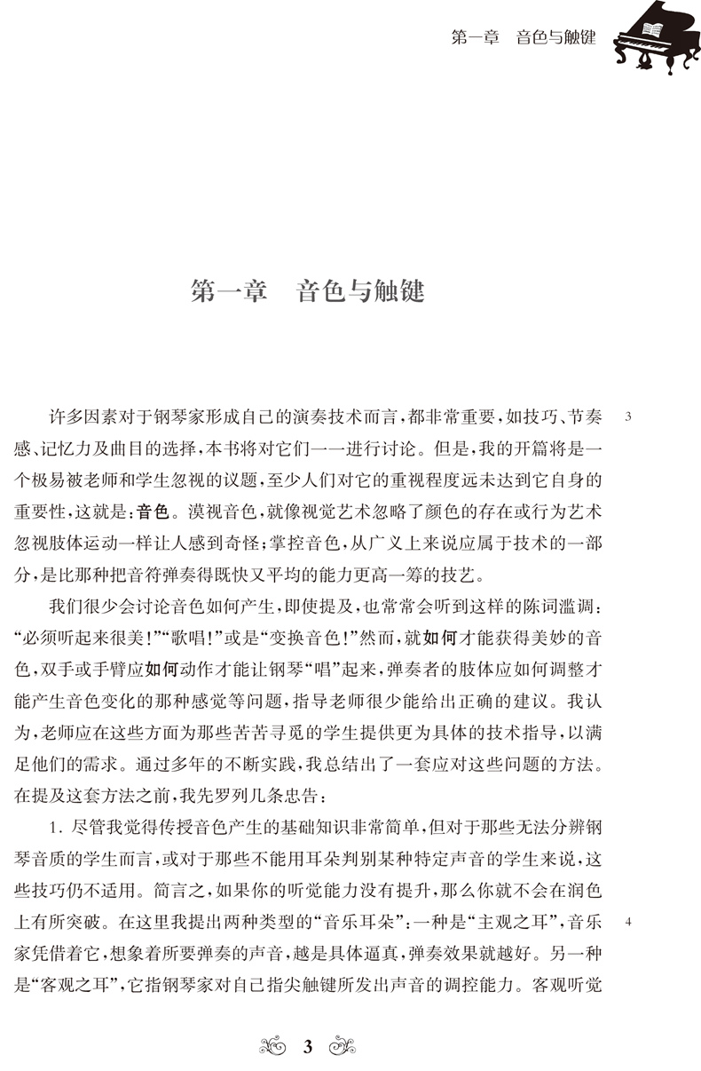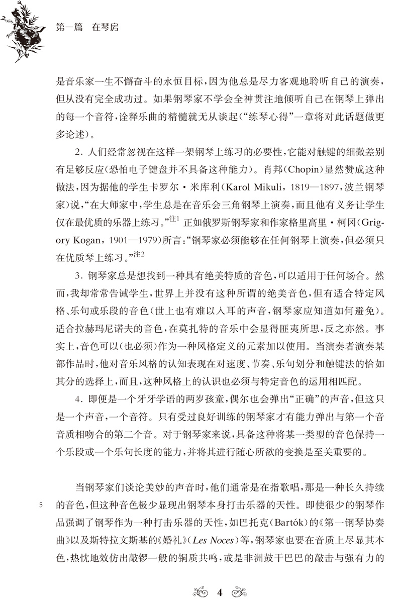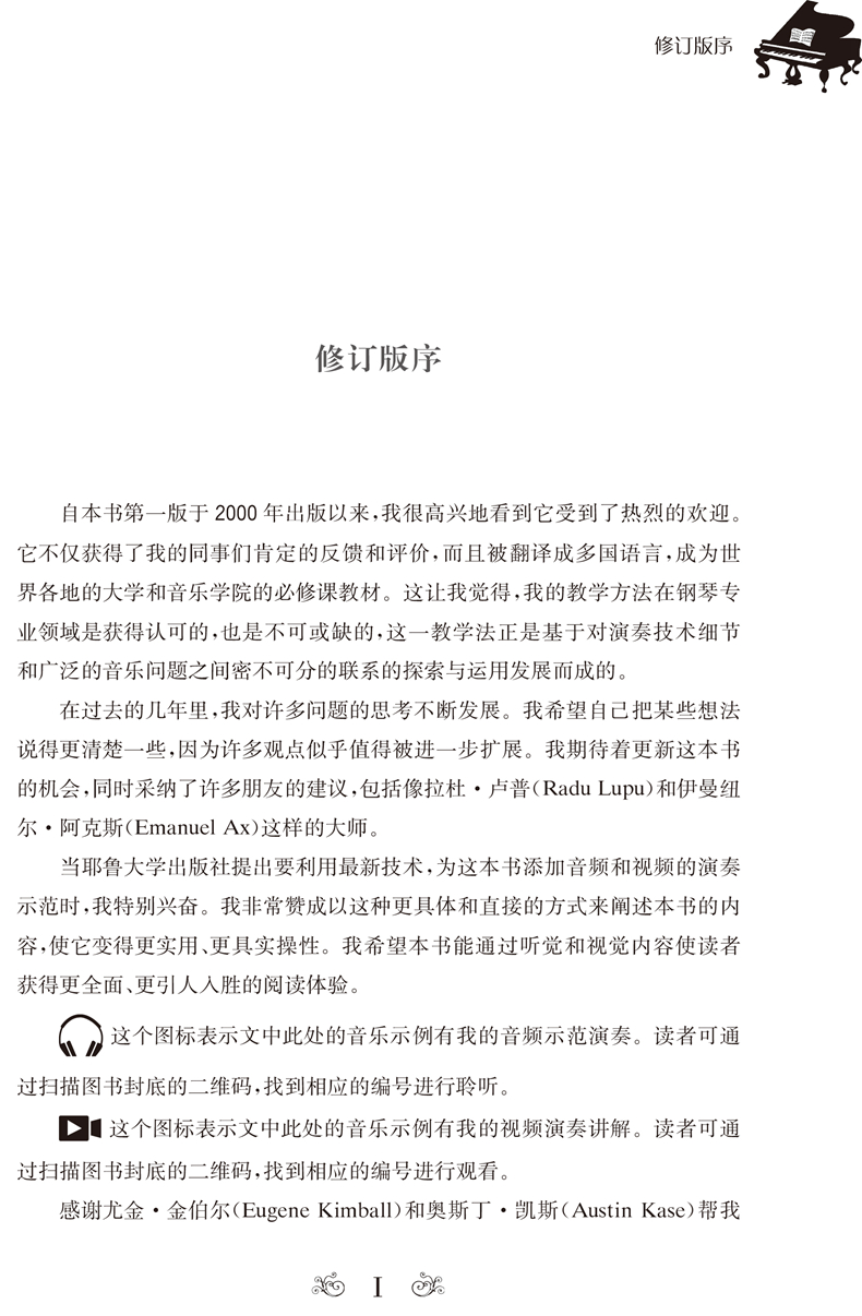 本书概括了我多年来以一名演奏家和教师的身份积累的多种想法、探讨及经验。书中呈现了我在教学和演奏过程中不断出现的课题,它们也是我个人及专业上的反思。很多内容都是在音乐会巡演的过程中和教学课后所记录下来的,这一切也影响了我对本书中所讨论的曲目的选择。本书不可能面面俱到,我并不试图讨论钢琴演奏者可能遇到的所有问题,也并不渴望做任何的革新。事实上,我只是期望我的同行能够认同我在书中陈述的观点,我希望自己建议的方法能对大家解决相似的问题有所帮助。我的目的不是要代替钢琴老师,而是要建议学生应该以参加一次大师班的方式来接触这本书———发掘另一些观点来补充老师给予的指导。在一堂课的有限时间内,教师会面临各种各样的问题。在纠正错音和节奏、建议更好的指法与讨论特定乐段的演奏法之外,他很少有时间再去讨论本书中所涉及的其他课题。因此,我希望我的同行们可以偶尔把本书中的某一章节当作有益的补充阅读材料,使学生在课堂上能有较多且具体的收获。