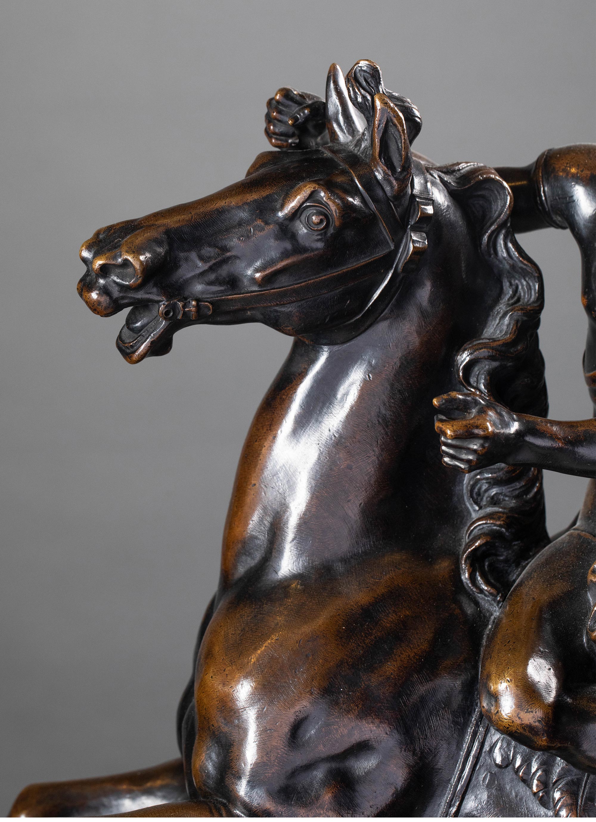 独角鹿西洋古董法国出品雕塑家Antoine Coysevox设计布勒镶嵌底座装饰青铜雕塑作品一对《骑飞马的荣誉女神与墨丘利》