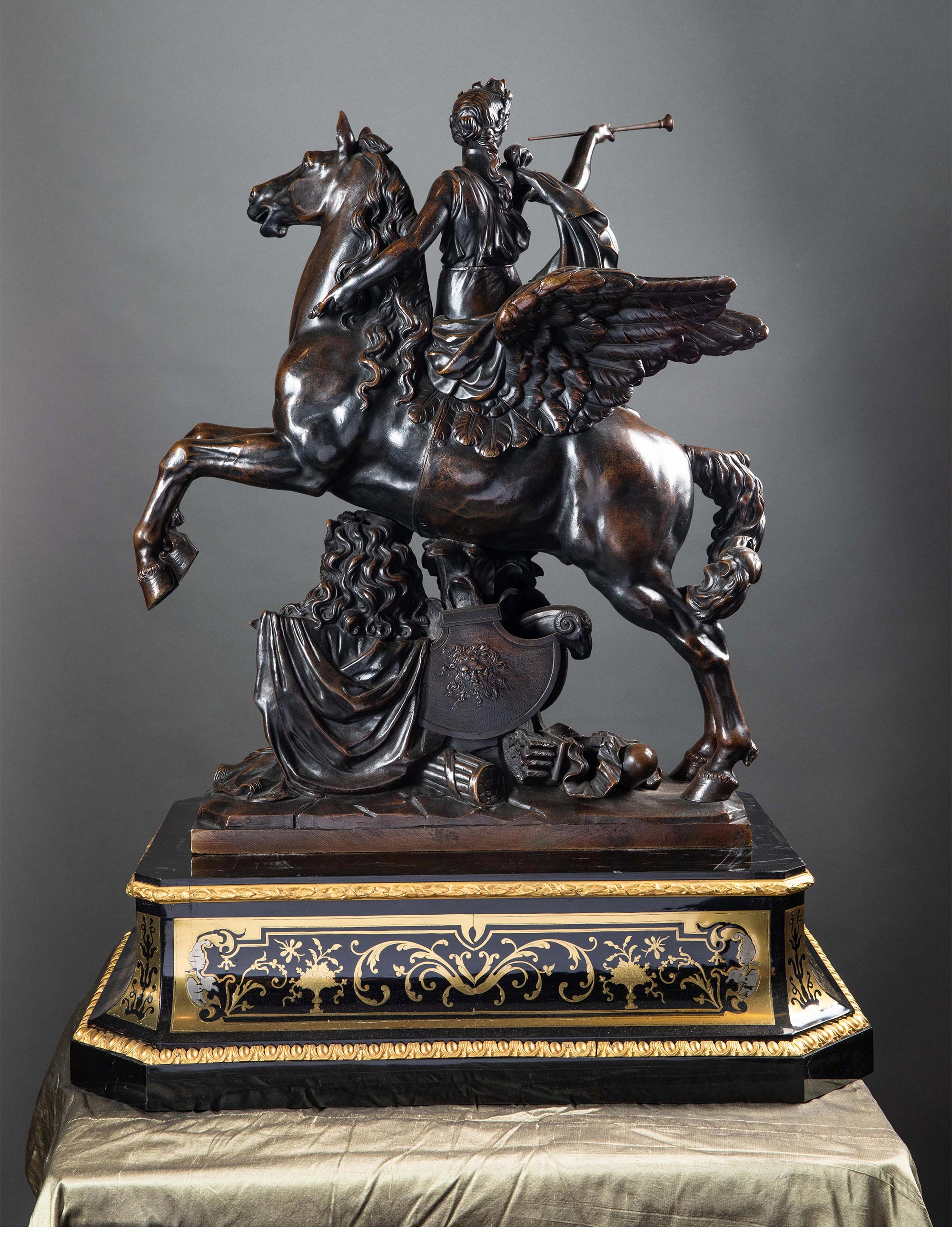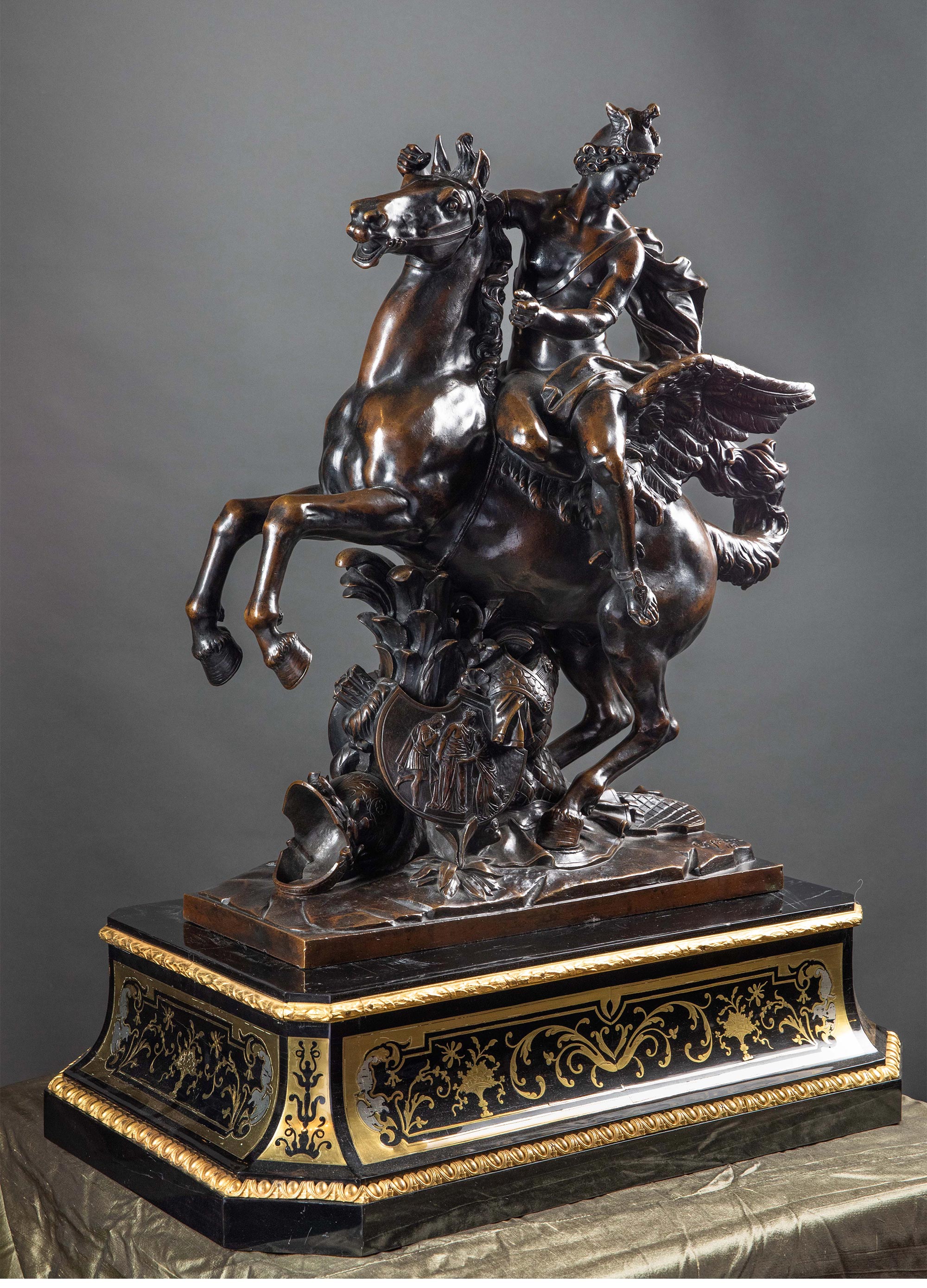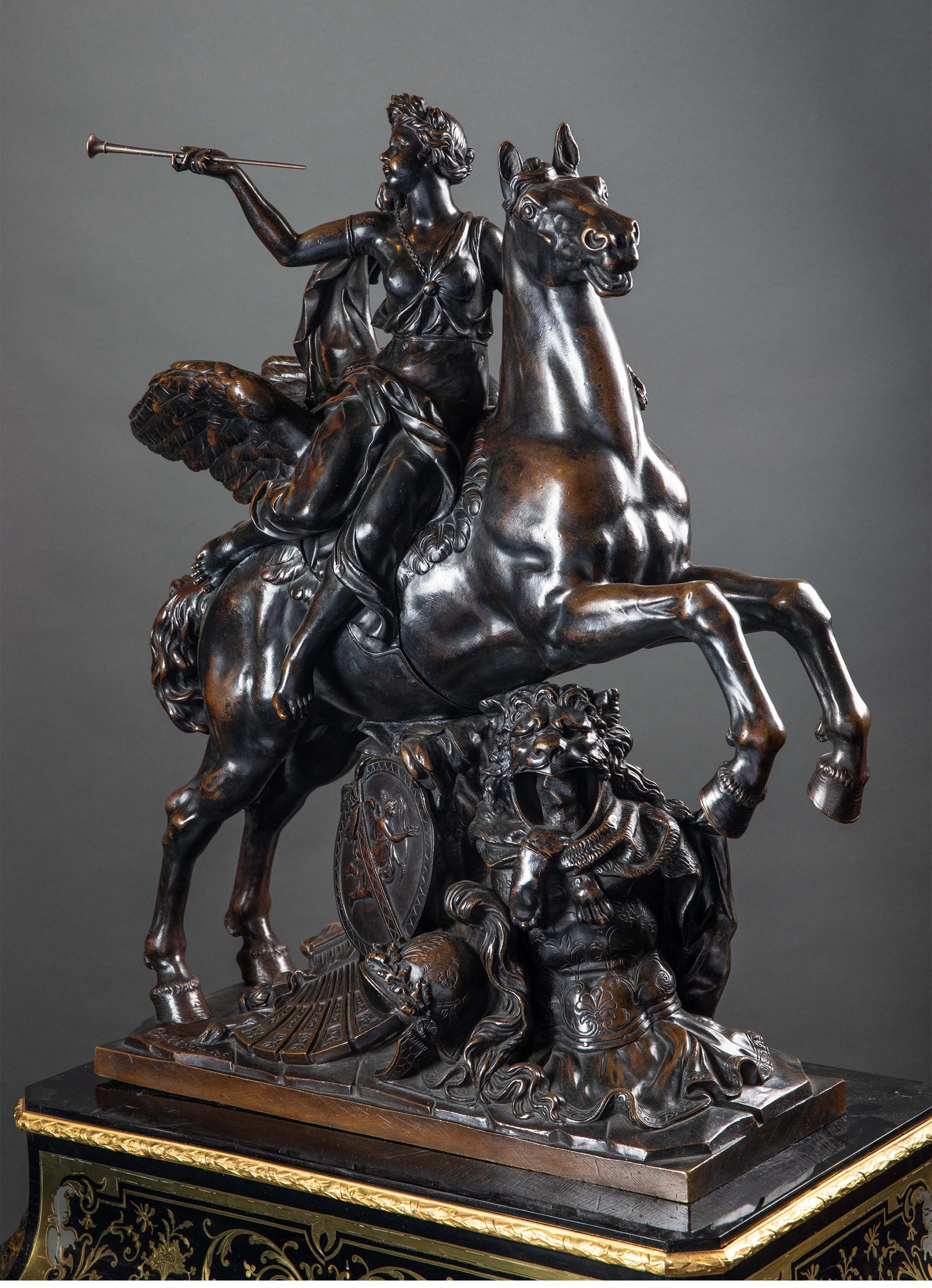 19世纪法国出品雕塑家Antoine Coysevox设计布勒镶嵌底座装饰青铜雕塑作品一对《骑飞马的荣誉女神与墨丘利》