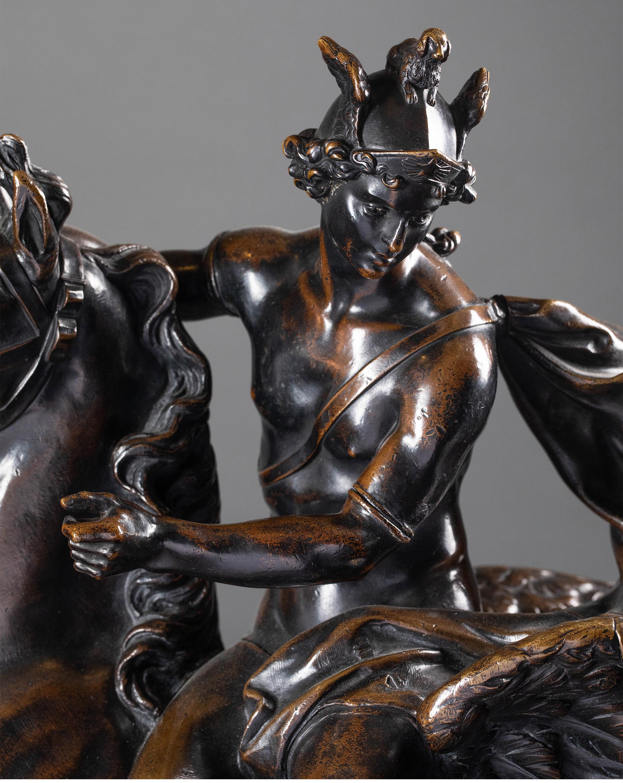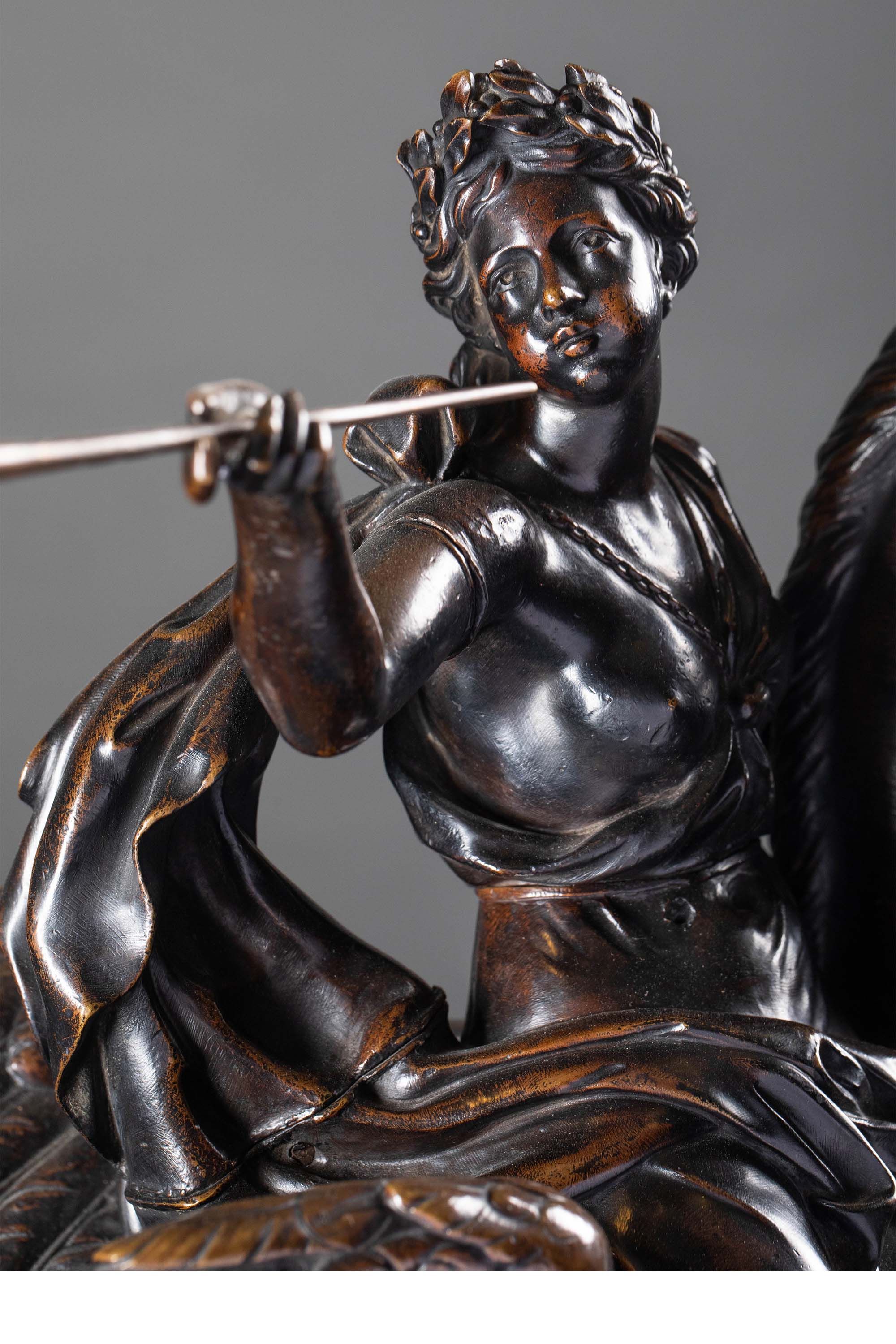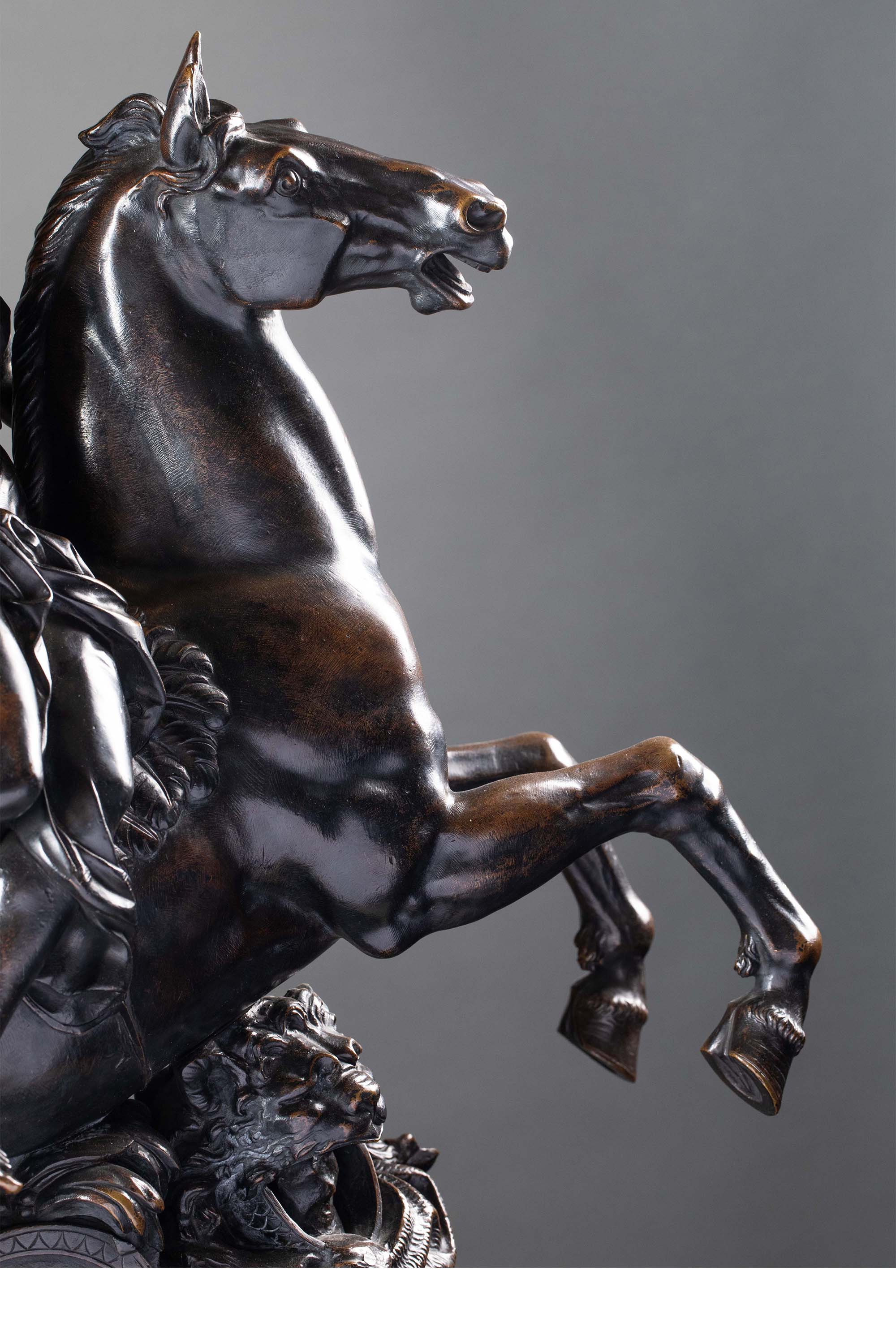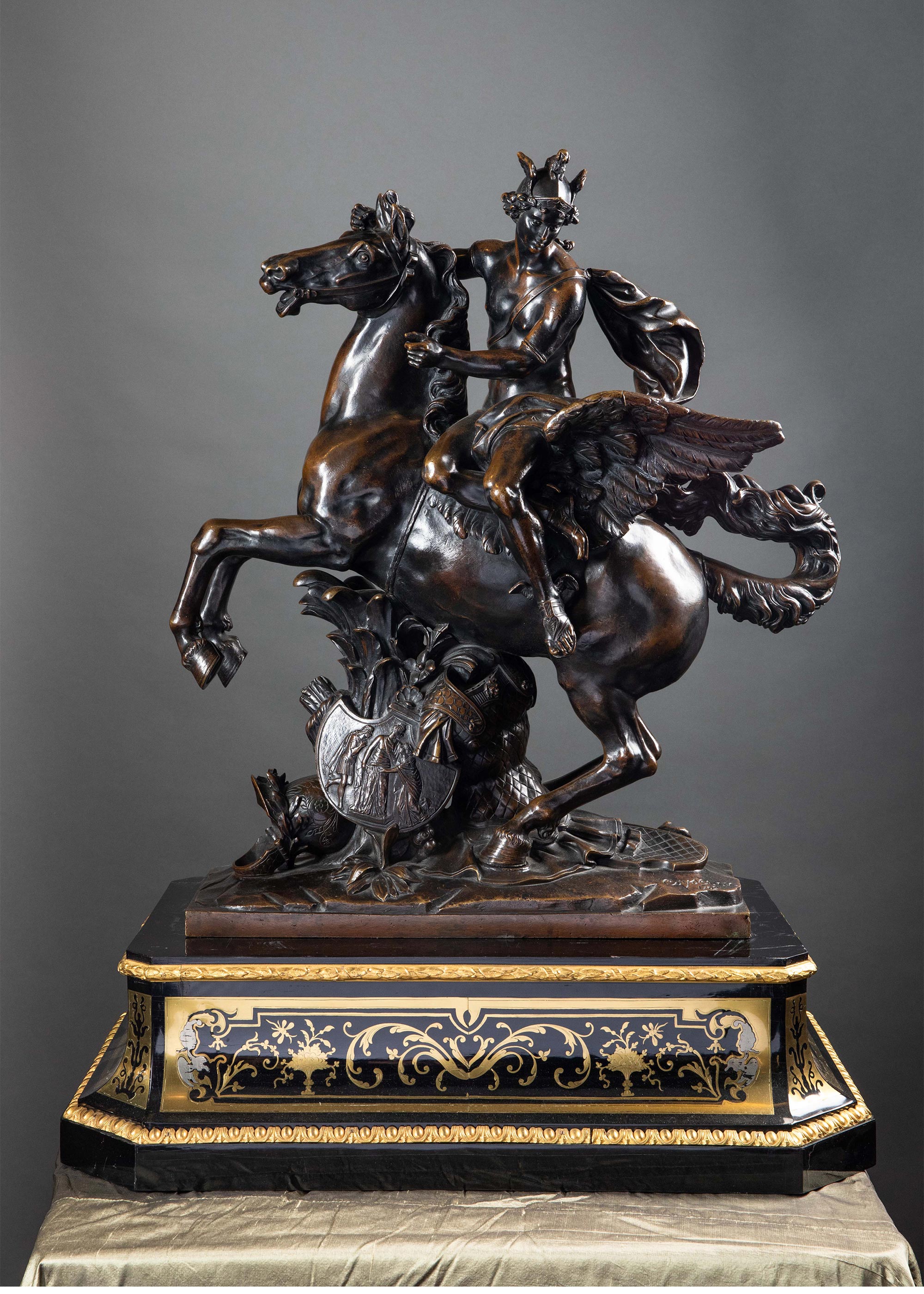 19世纪法国出品雕塑家Antoine Coysevox设计布勒镶嵌底座装饰青铜雕塑作品一对《骑飞马的荣誉女神与墨丘利》