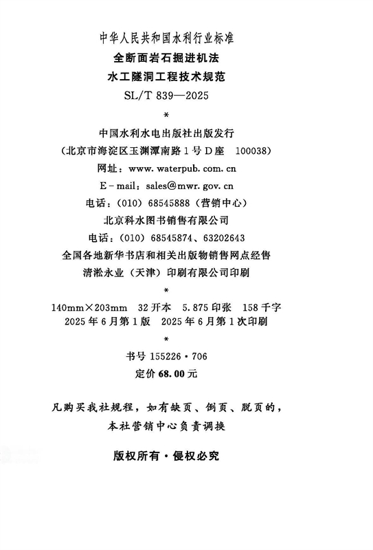 SL/T839-2025全断面岩石掘进机法水工隧洞工程技术规范(中华人民共和国水利行业标准)