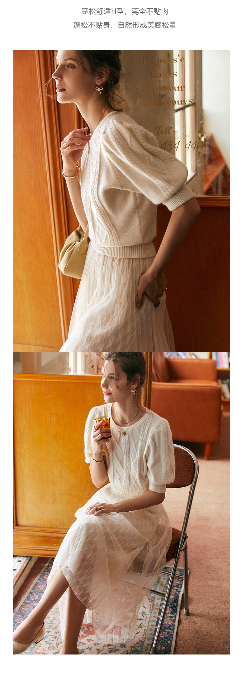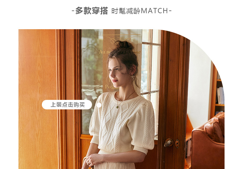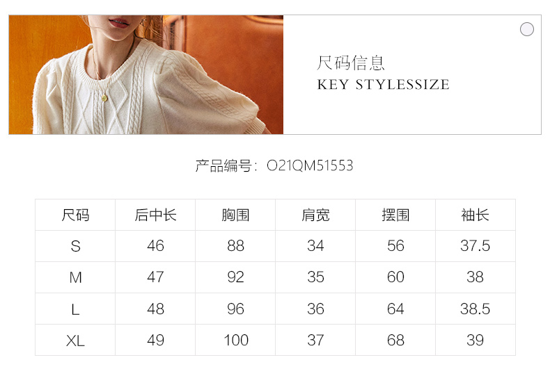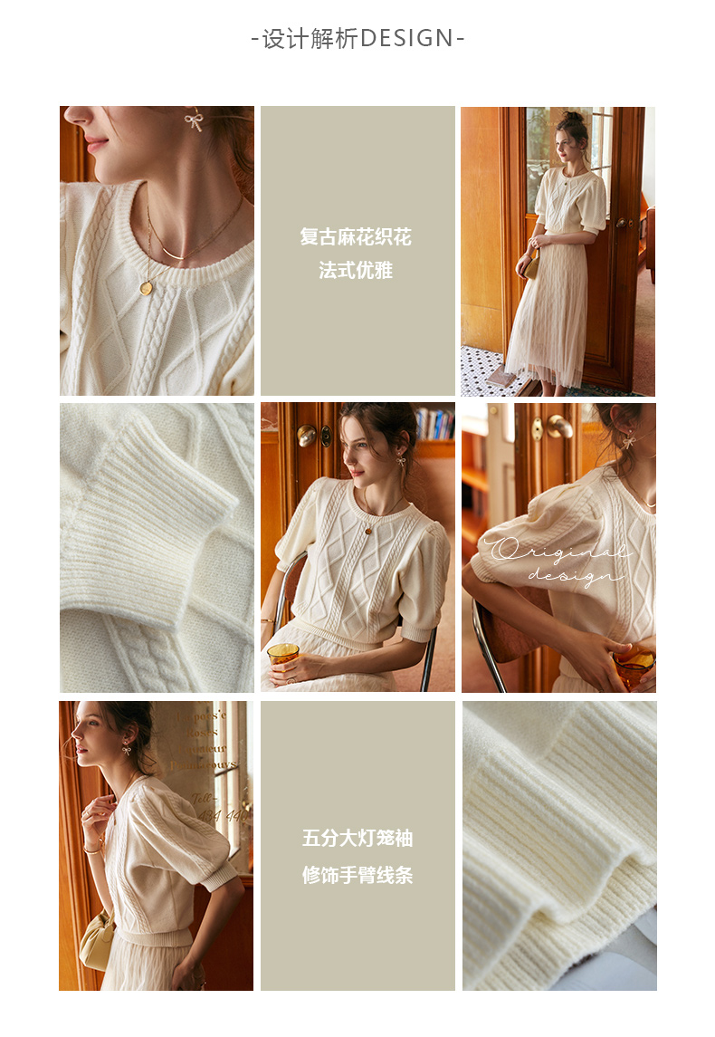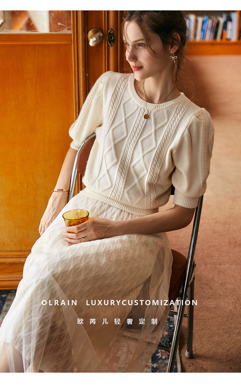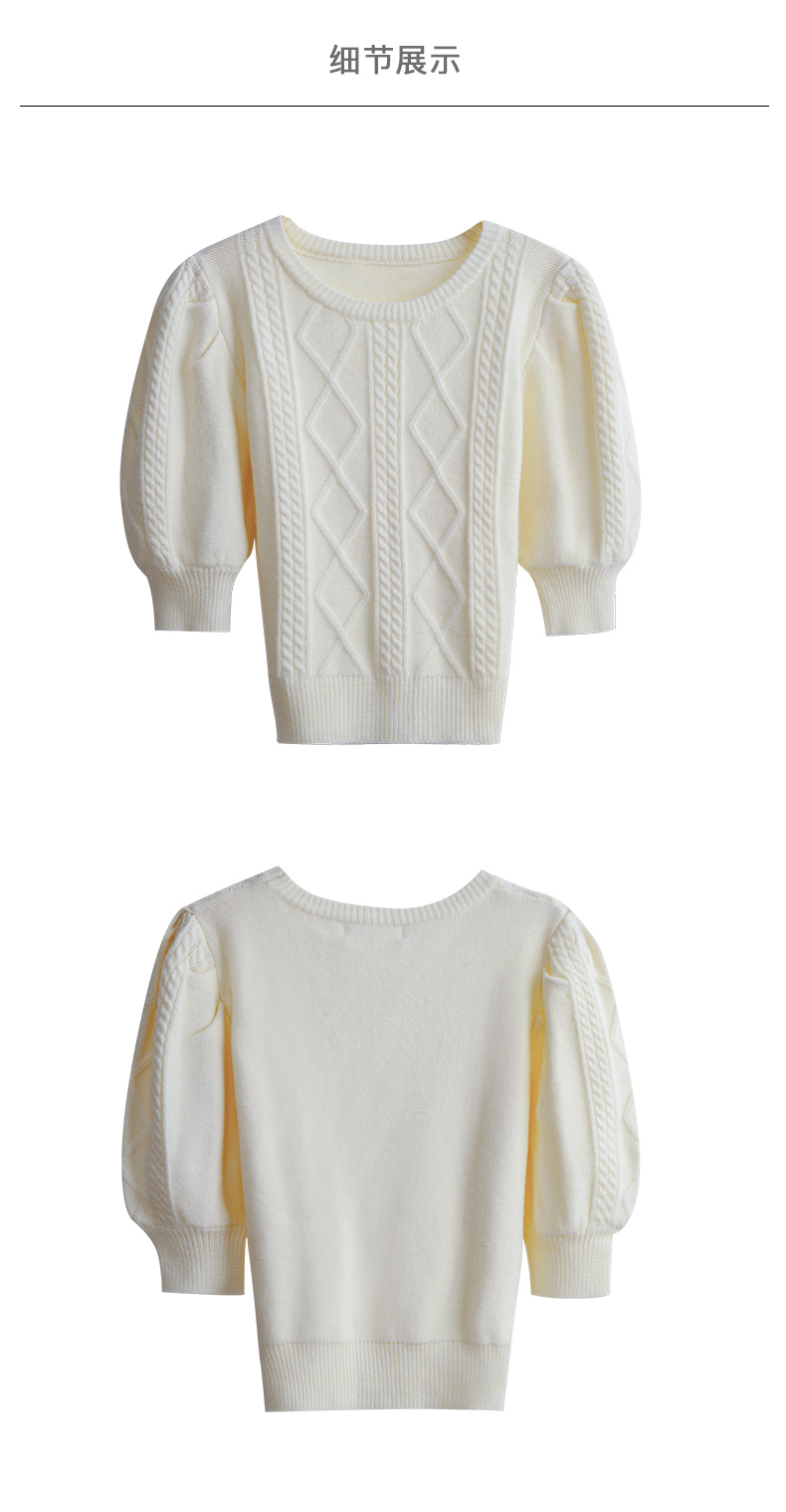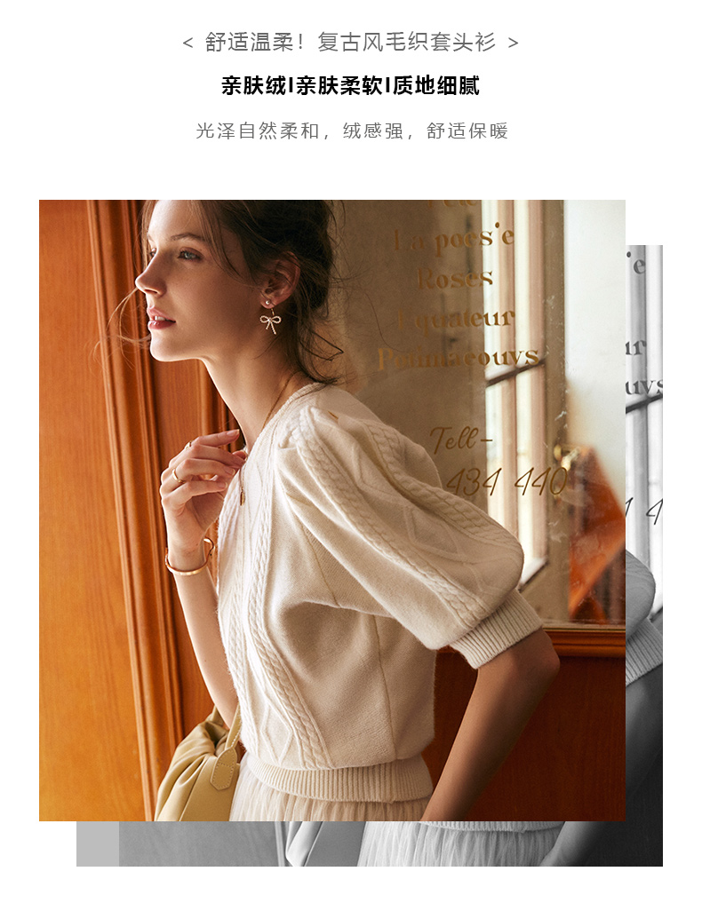 欧芮儿杏色毛衣女秋季新2021宽松显瘦复古风法式五分灯笼袖套头衫