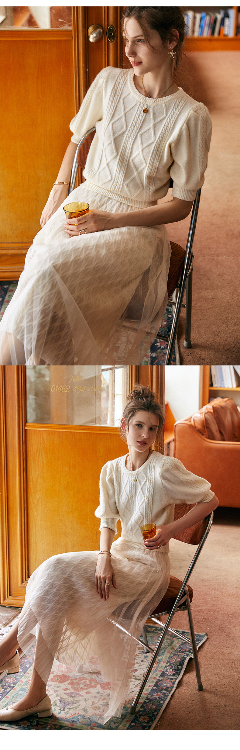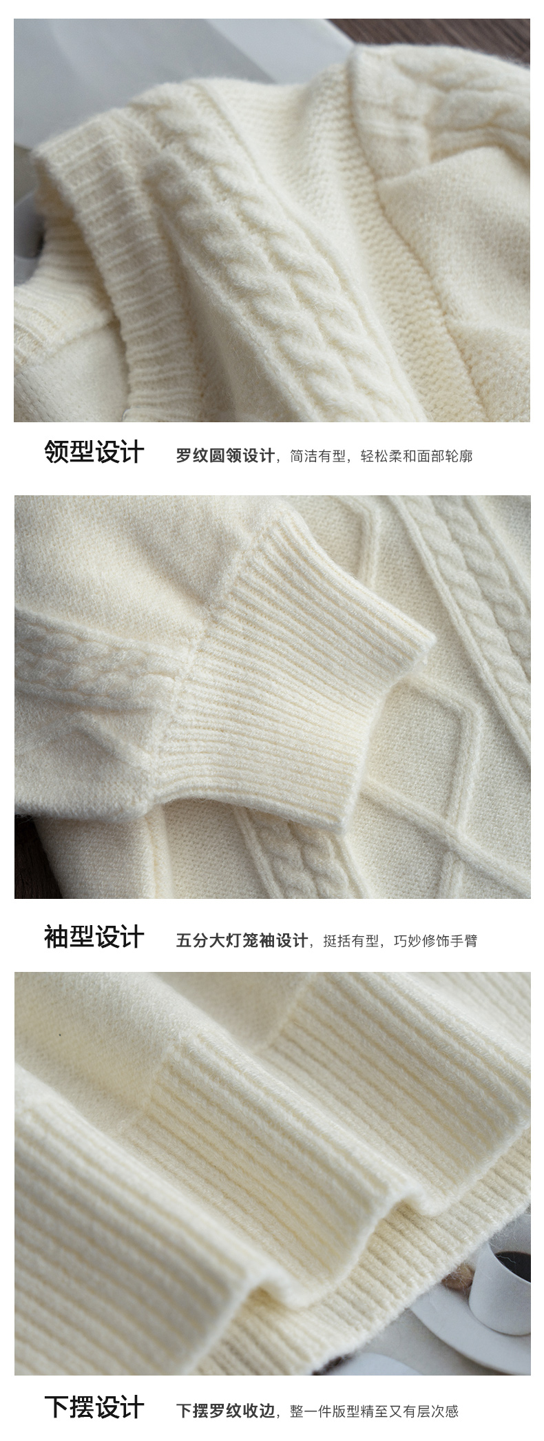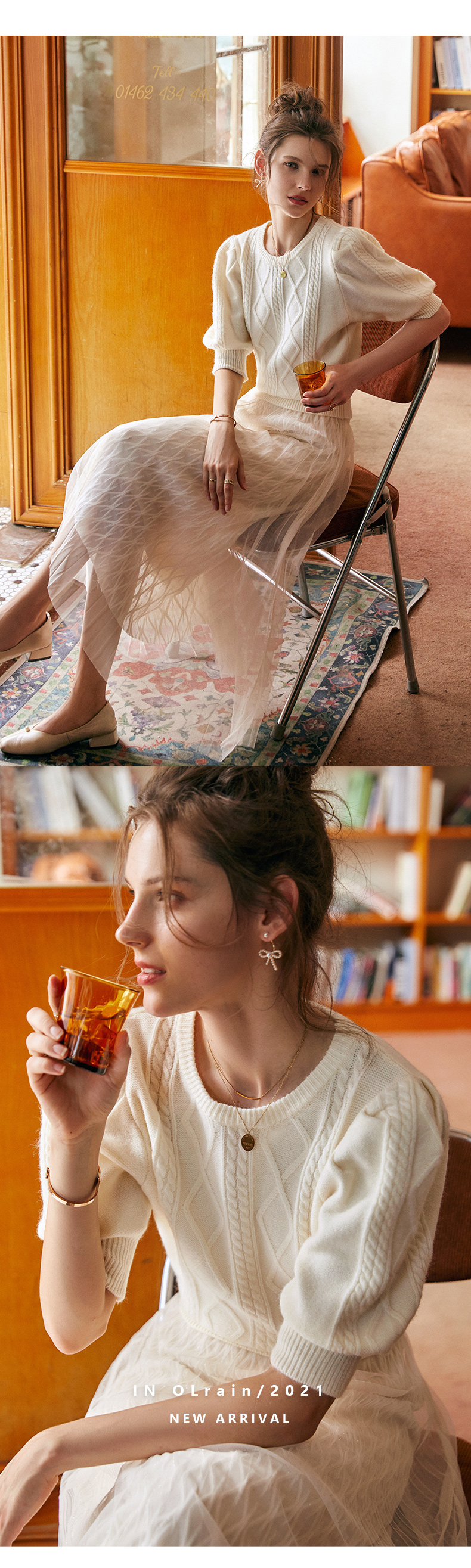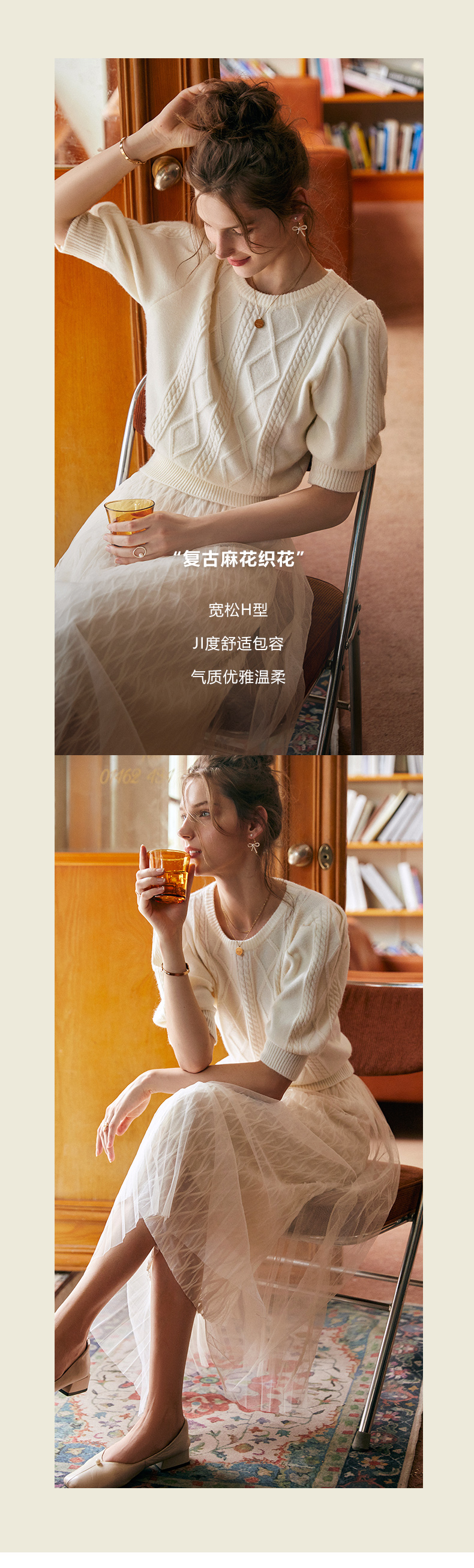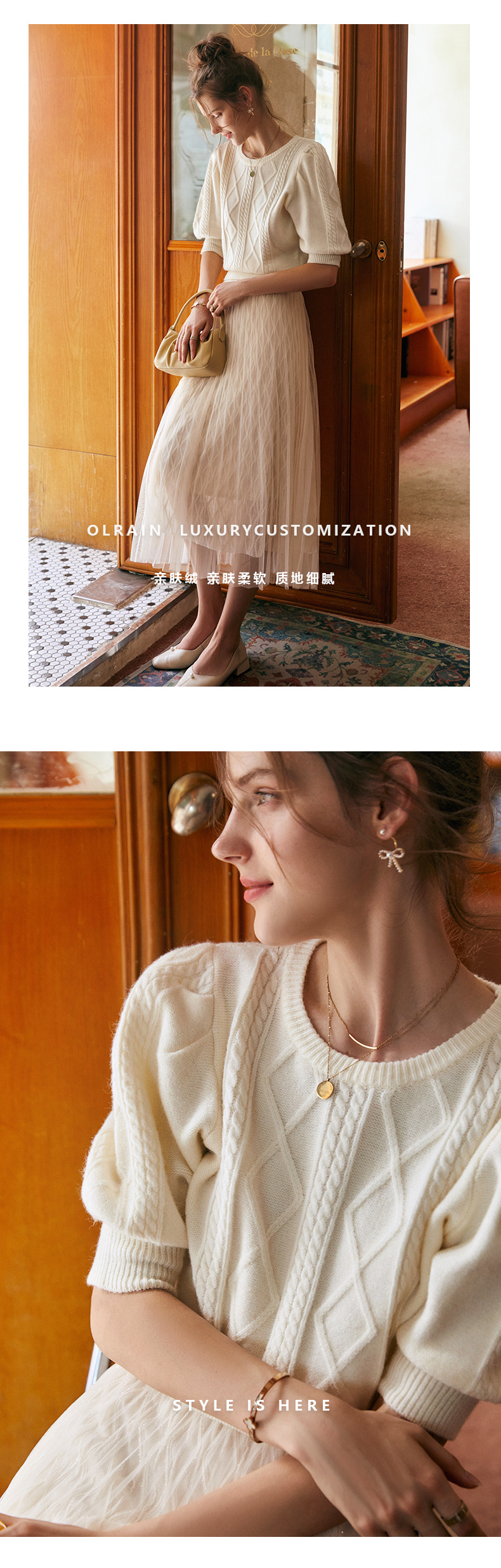 欧芮儿杏色毛衣女秋季新2021宽松显瘦复古风法式五分灯笼袖套头衫