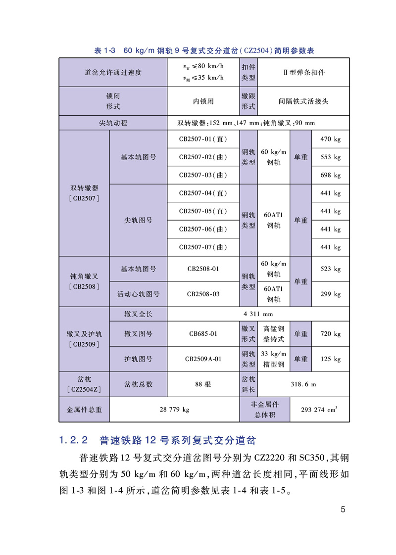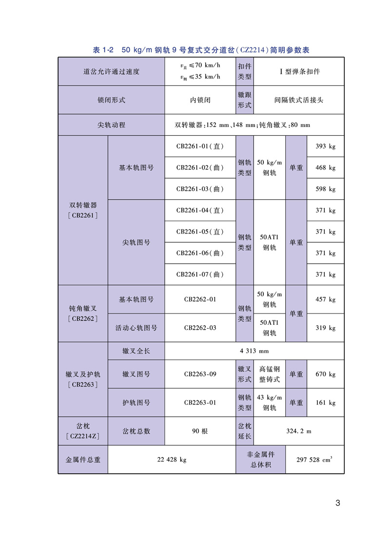 本书为《铁路道岔安装维护手册》之一《普速铁路复式交分系列道岔安装维护手册》,本书全面收集了《铁路道岔使用规定》明确的普速铁路复式交分系列道岔的相关资料,其中详细的介绍了道岔平面线型和简明参数、道岔轨距与框架轨距、钢轨件及钢轨组件、扣件系统、轨下基础和转换设备等信息。同时编写了道岔装卸、运输和贮存的基本要求。详细介绍了道岔现场安装的基本工序与铺设注意事项。列举了道岔的主要作业方法及要求。为进一步方便现场维护人员对道岔铺设及维护过程中,编制了道岔铺设检验项目及要求、道岔日常检查项点记录表,绘制了道岔铺设检验项目图示等。本书既可以作为道岔参数查询手册,同时也为道岔的安装、维护提供了详细资料供现场参考使用。