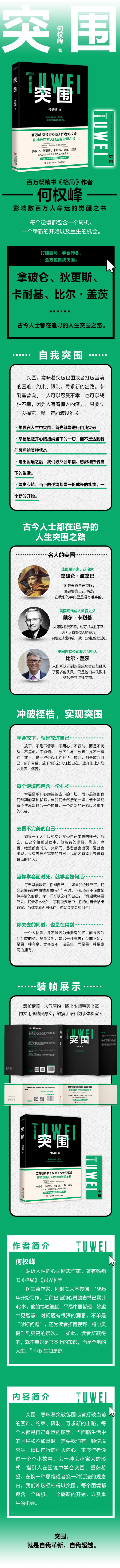 突围,意味着突破包围或者打破当前的困难、约束、,寻求新的出路。每个人都是自己命运的舵手,当面临生活中的困境和不如意时,需要我们有一颗逆境求生、砥砺前行的强大内心。本书作者通过一个个小故事,以一种以小寓大的形式,指引人在困境中学会突围、重获希望,在换一种思维或者换一种活法的观念内,我们冲破桎梏得以突围。每个困境都包含一个转机、一个崭新的开始,以及重生的机会。