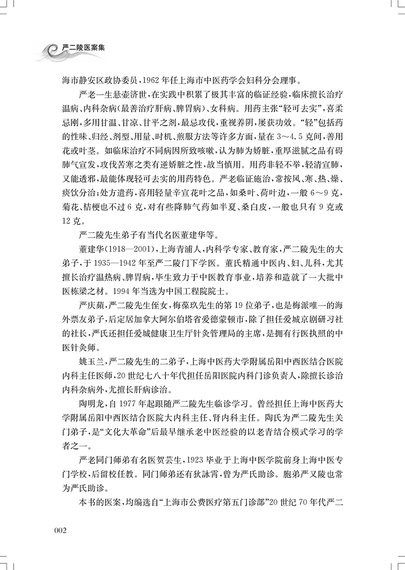 严二陵,现代上海名医,我国著名的中医学家,从事中医内科临床60余年,在学术上自成一派,尤其擅治温病、肝病及妇科病,临证诊疗思想影响深远。