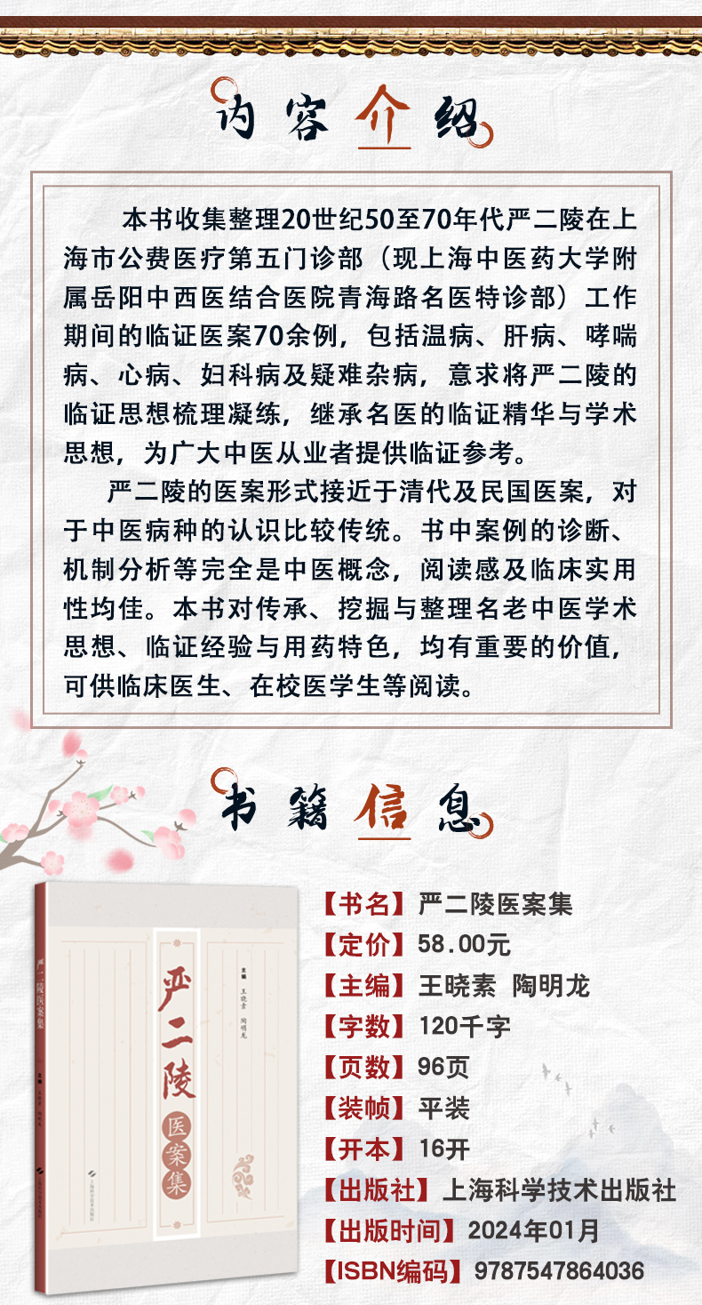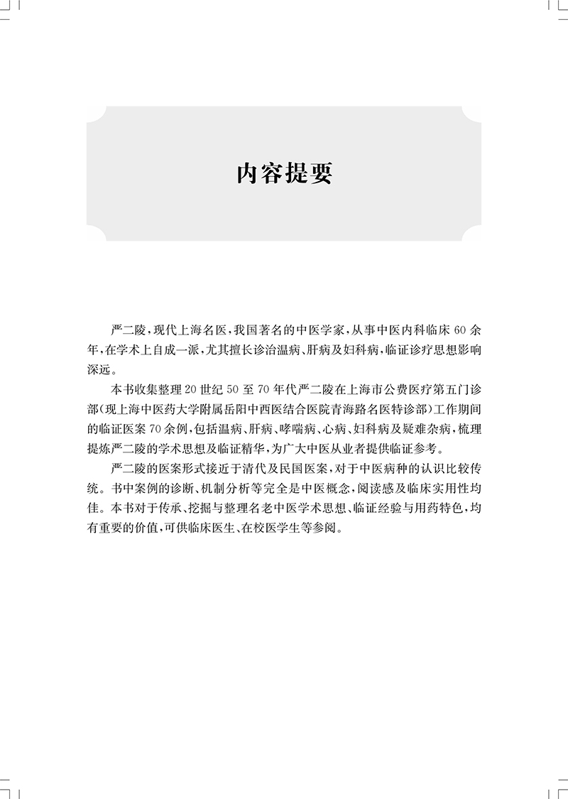 本书收集整理20世纪50至70年代严二陵在上海市公费医疗第五门诊部(现上海中医药大学附属岳阳中西医结合医院青海路名医特诊部)工作期间的临证医案70余例,包括温病、肝病、哮喘病、心病、妇科病及疑难杂病,意求将严二陵的临证思想梳理凝练,继承名医的临证精华与学术思想,为广大中医从业者提供临证参考。