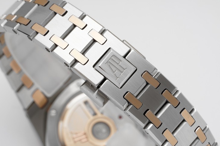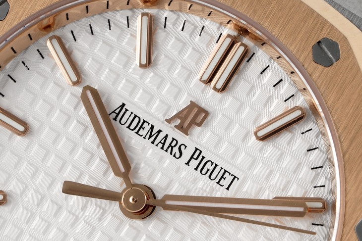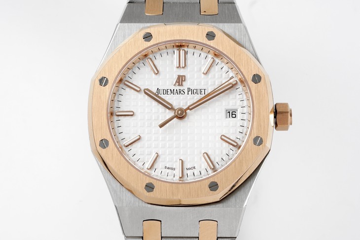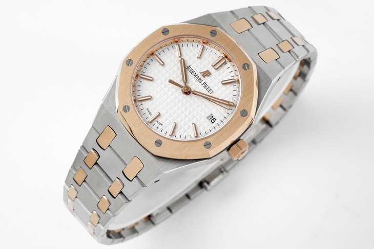 NOOB新品 直径34毫米的皇家橡树系列自动上链腕表,以全新表壳尺寸再现这一传奇系列的前卫风格,并为纤细手腕的佩戴者演绎出别样的优雅格调。全新腕表均搭载9015改Calibre 5800自动上链机芯,采用为该款式特别设计的玫瑰金金自动摆陀。