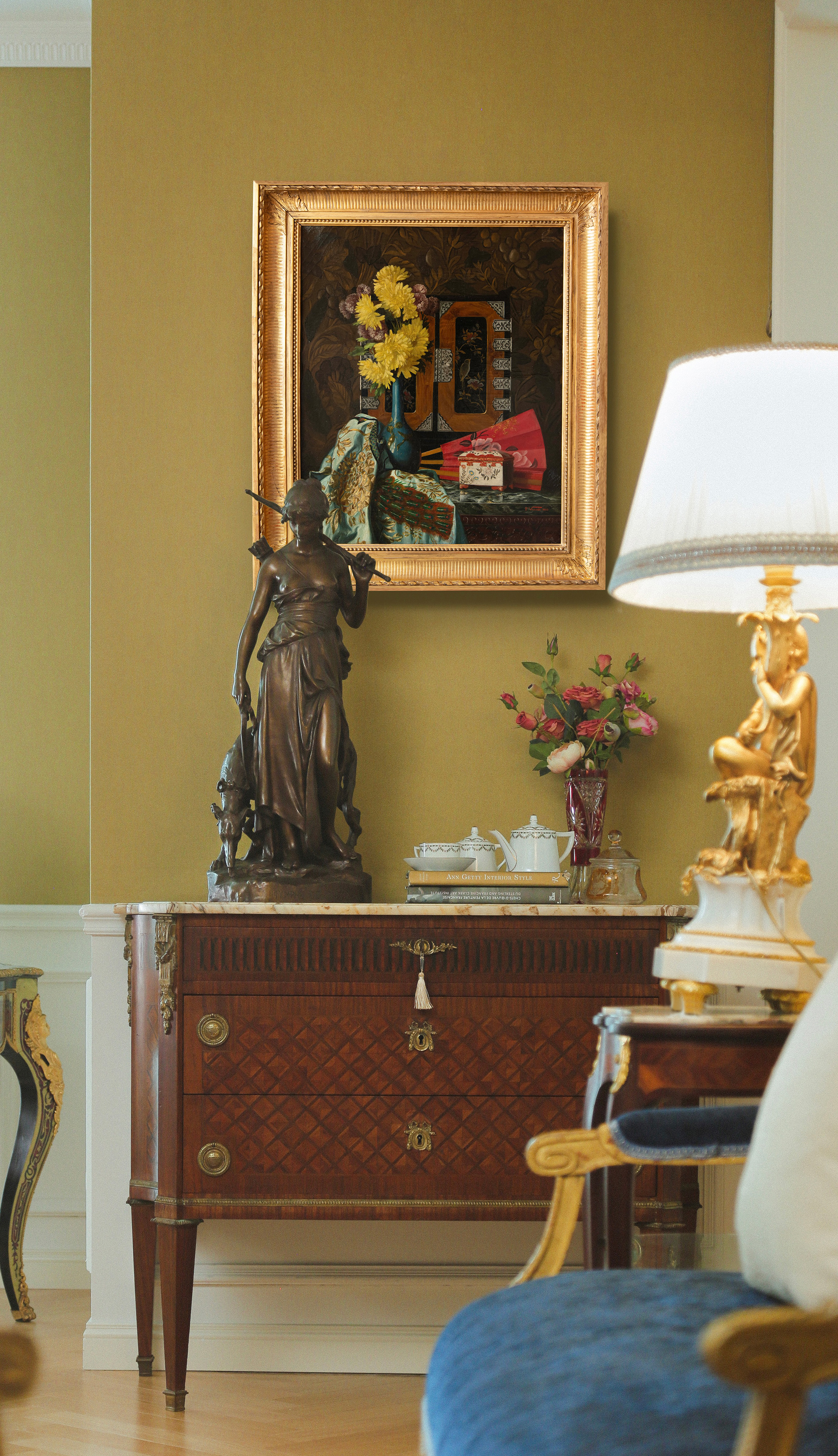 独角鹿西洋古董1888年法国画家Pauline Vallée签名创作东方主义风格静物油画作品《中国风与日本主义的构图》