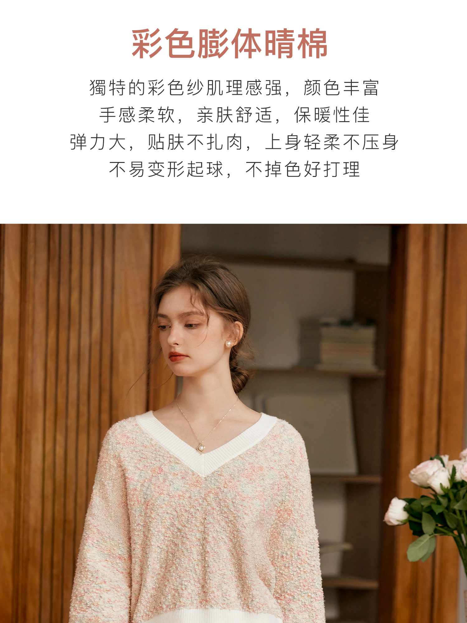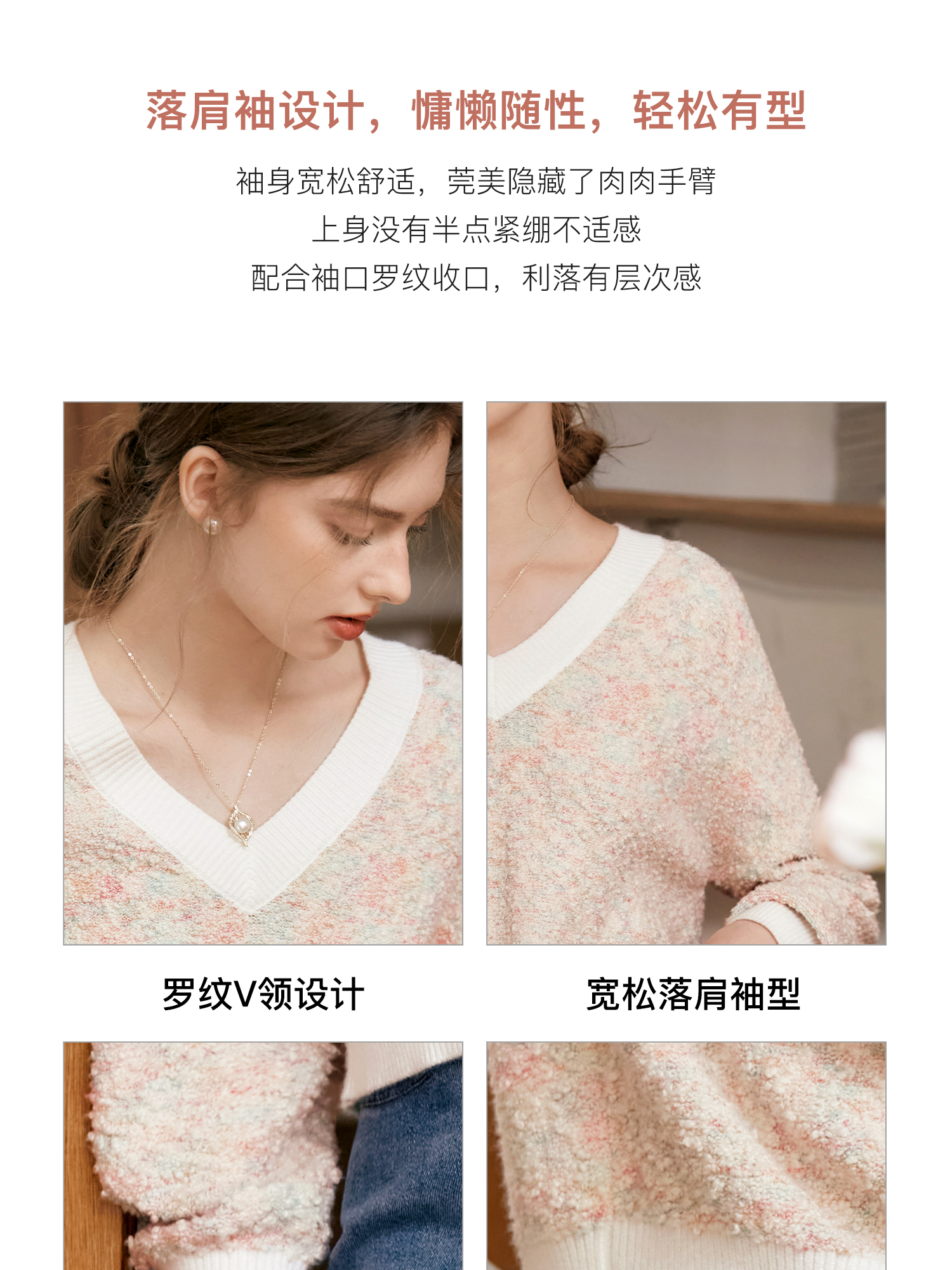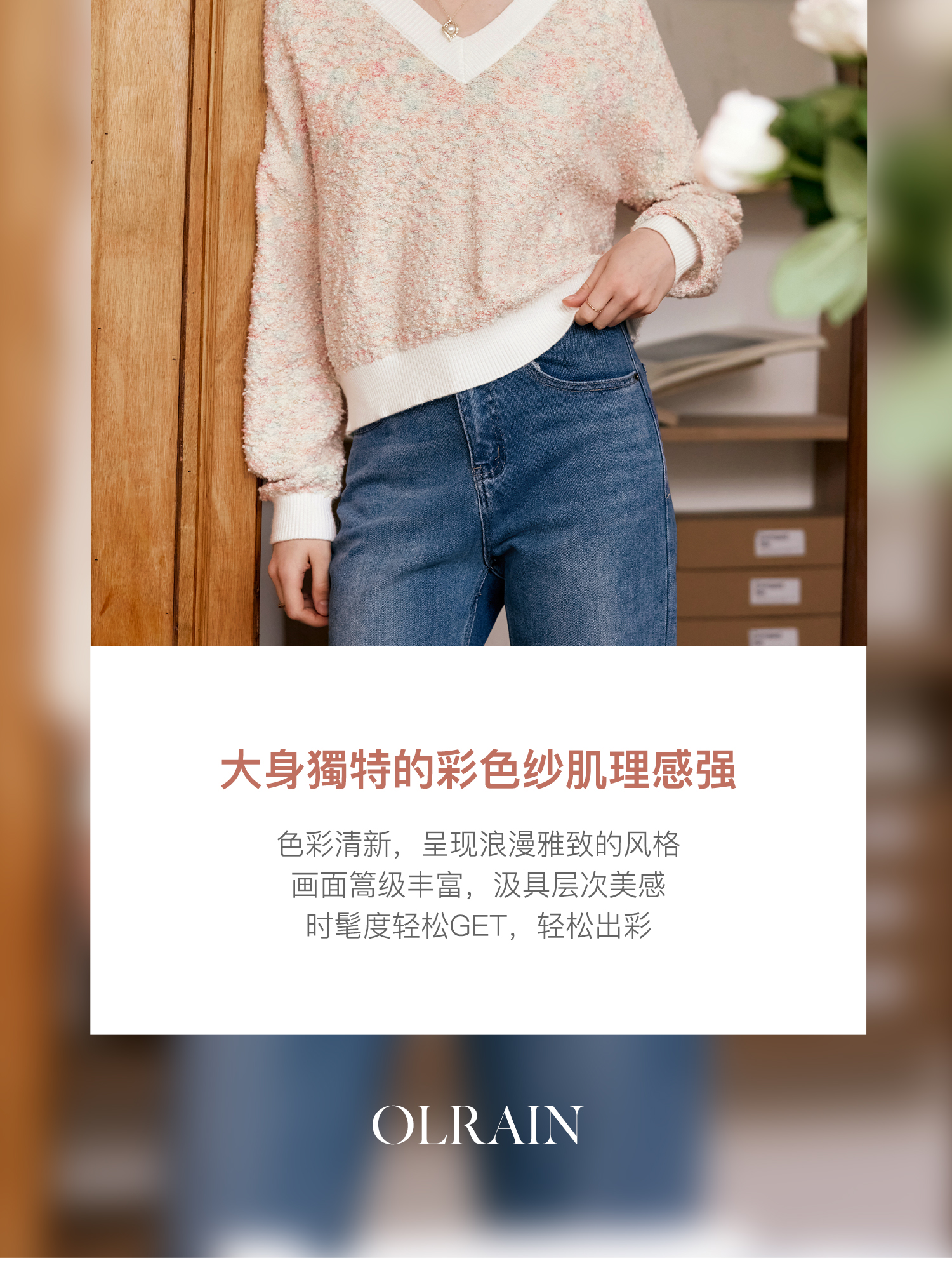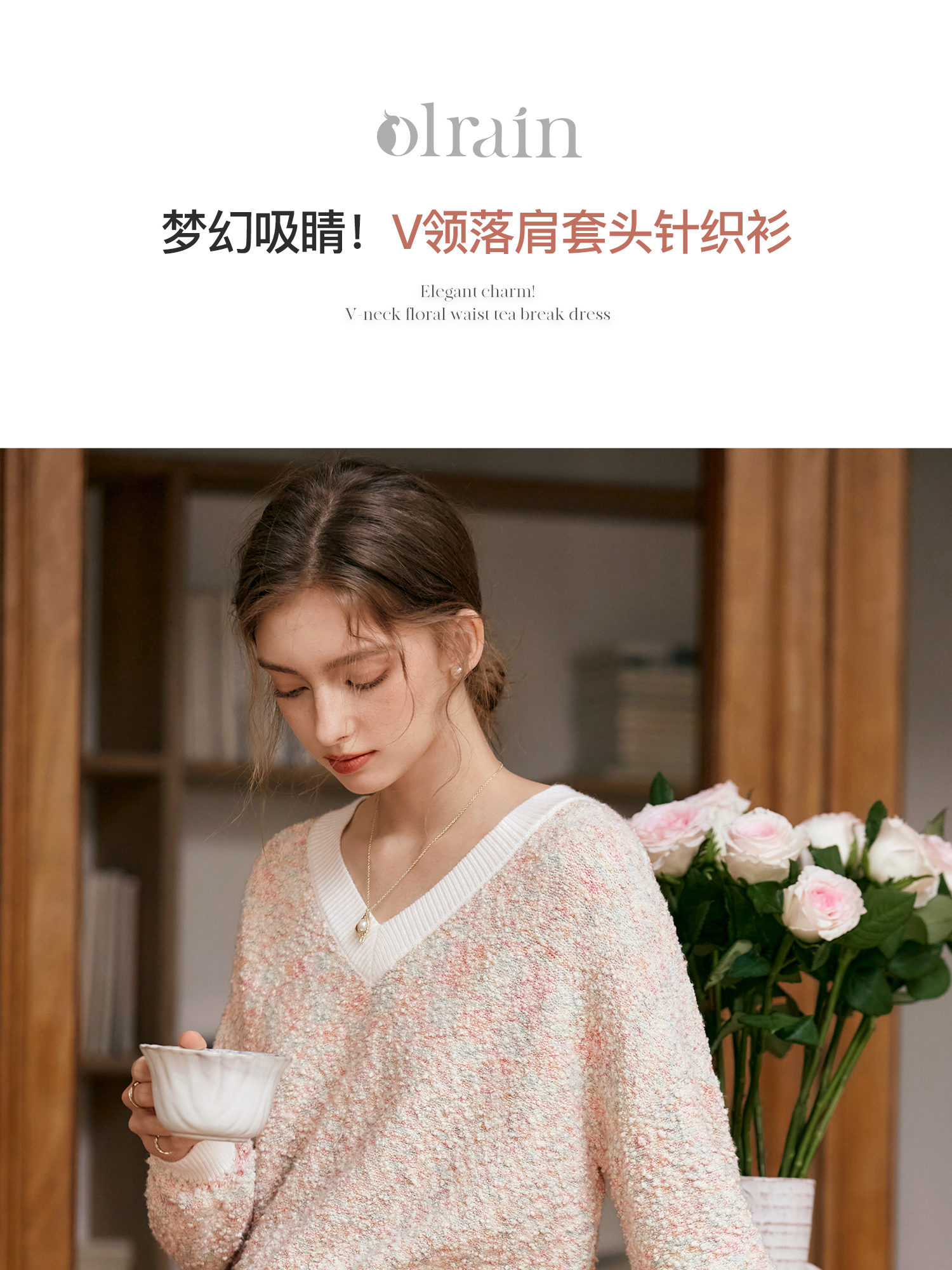 OLrain欧芮儿法式幻彩V领针织衫女秋季2024新款宽松落肩显瘦上衣