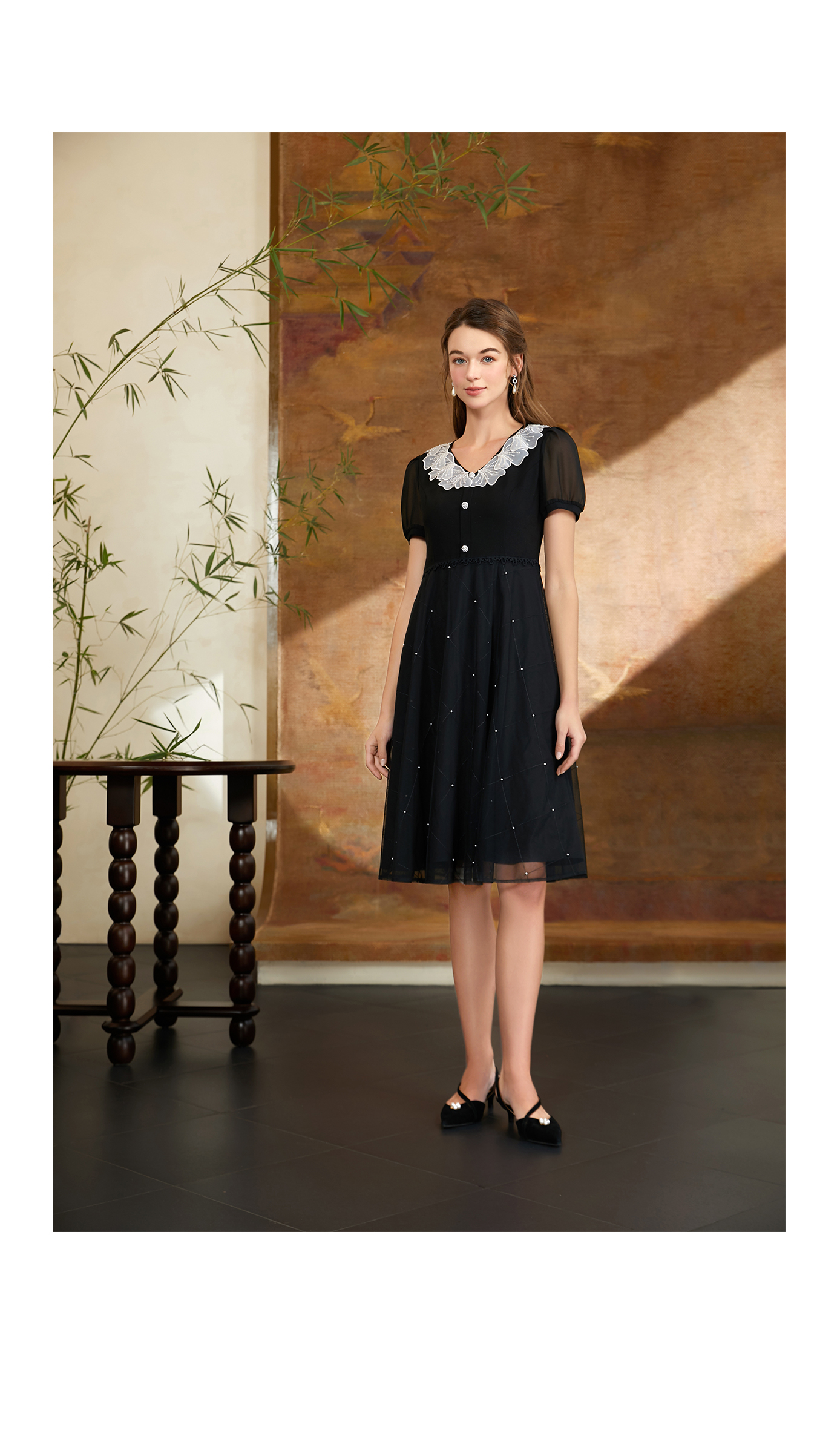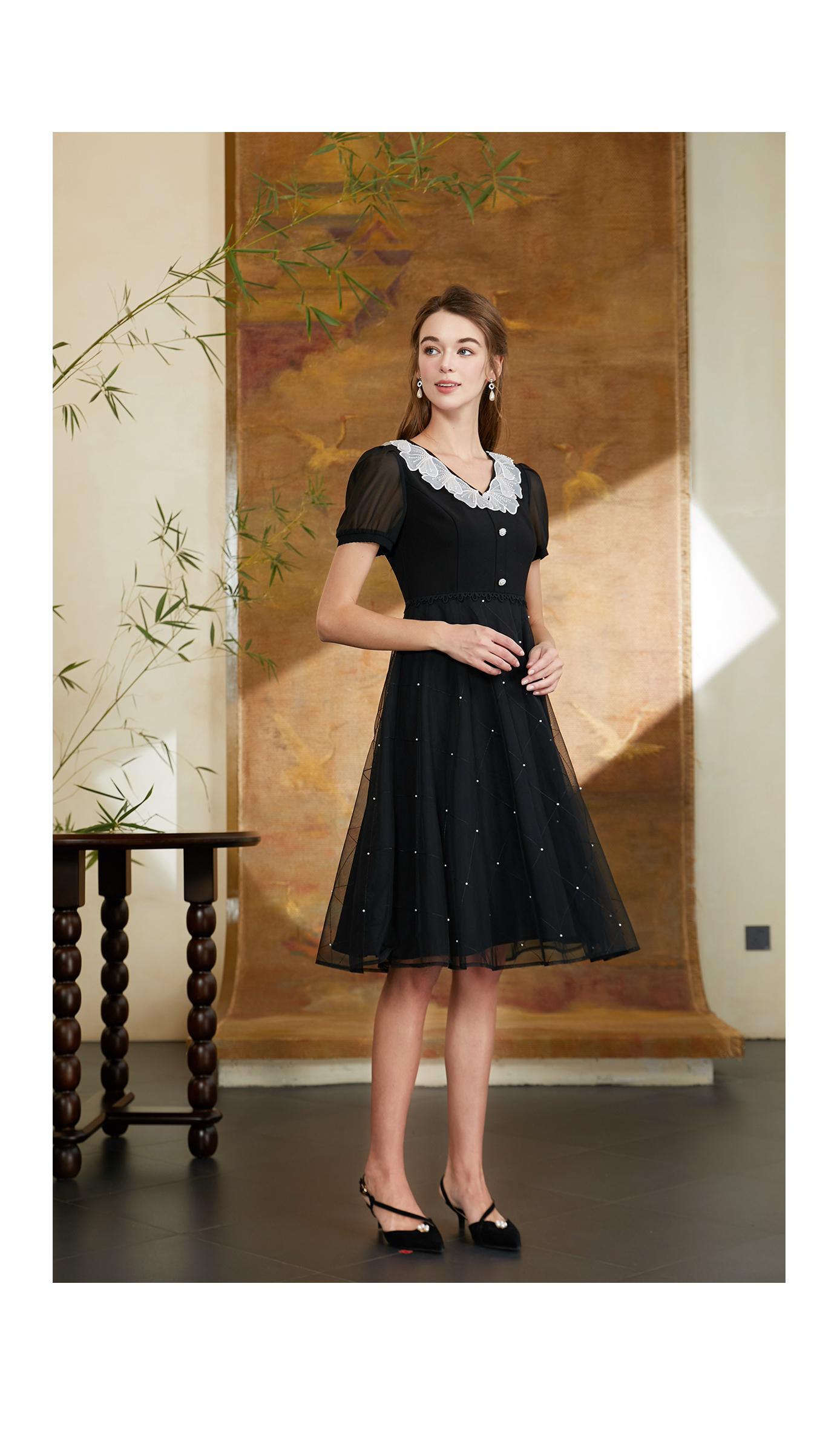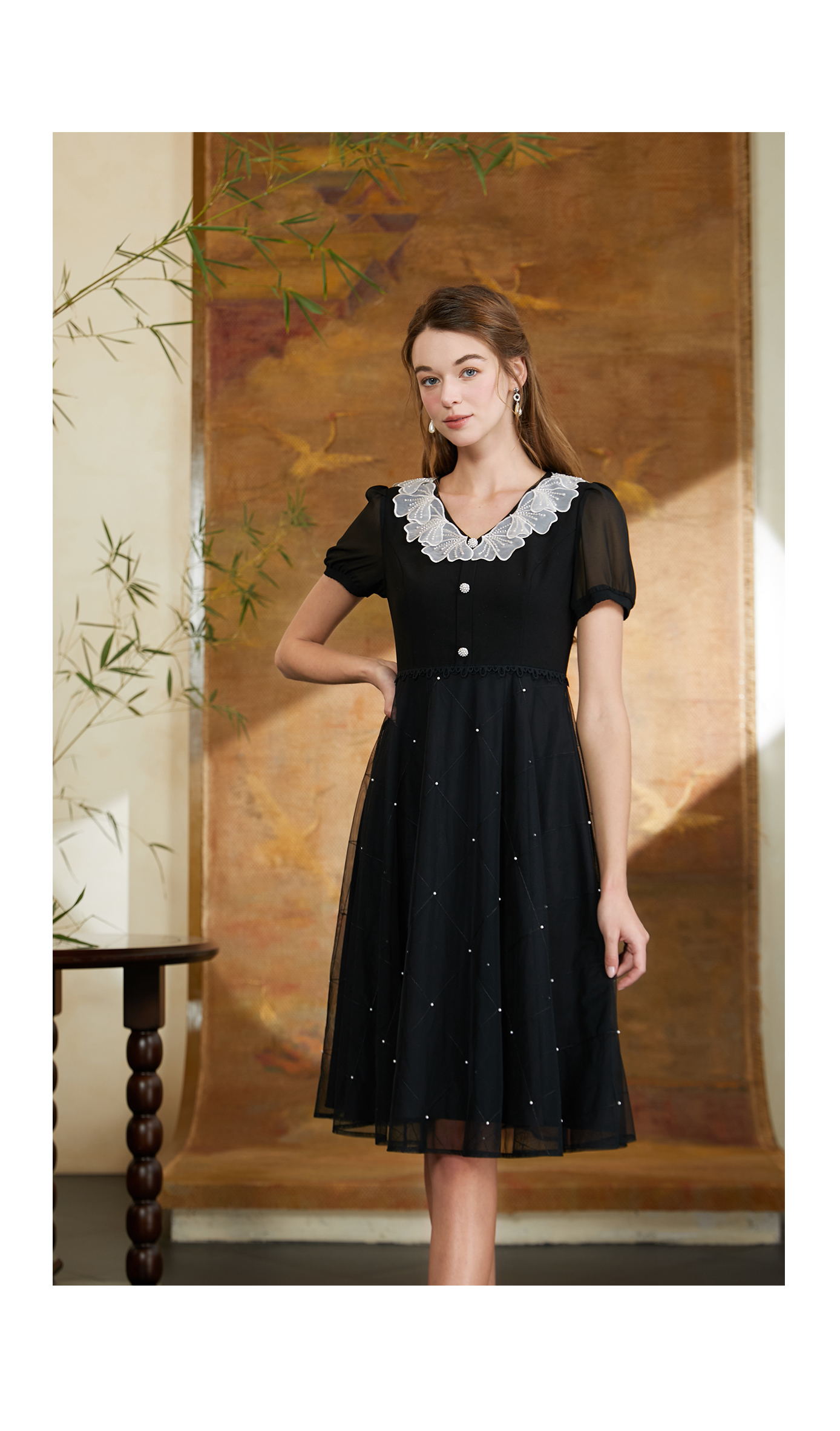 司歌假两件蕾丝绣花连衣裙弹力短袖A911212X