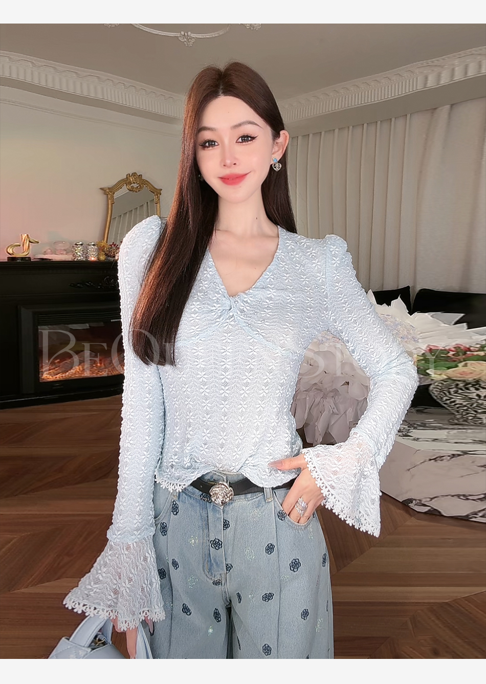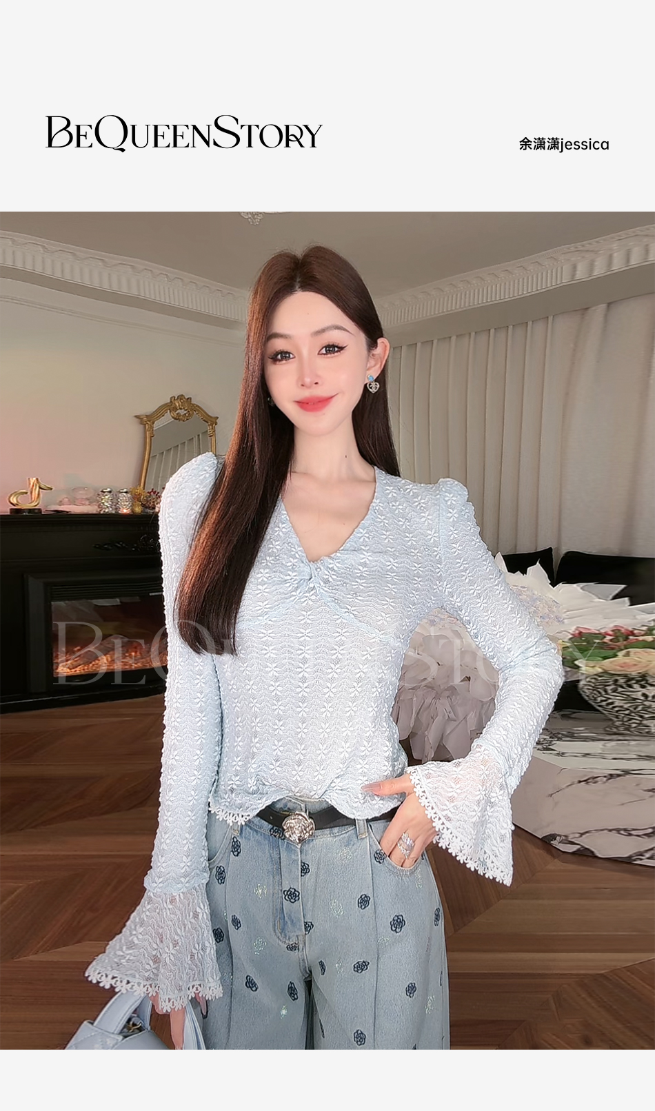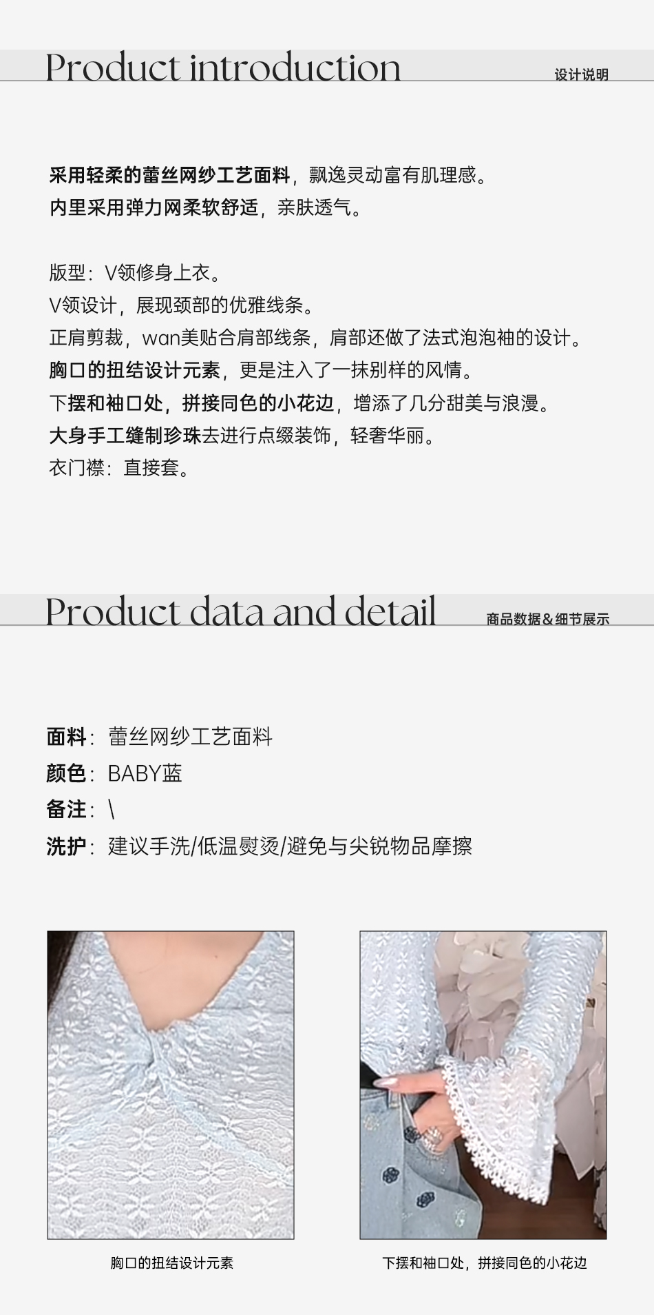 【孤品样衣,不退不换】【海蓝星辰】2025弹力蕾丝网纱泡泡袖V领修身上衣打底蓝色
