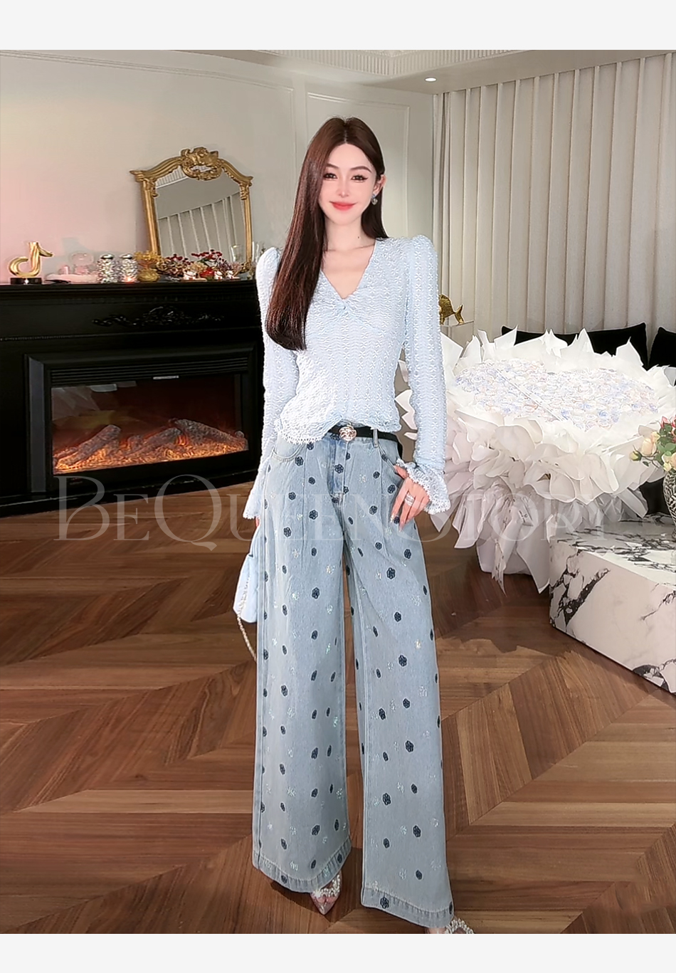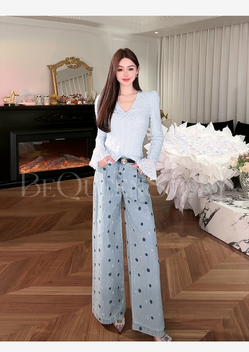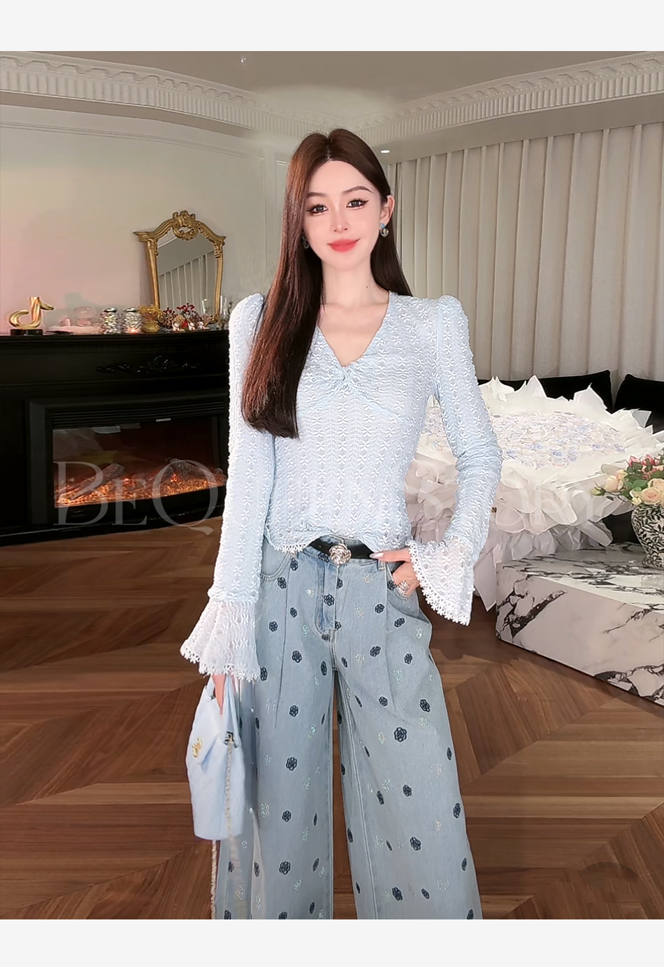 【孤品样衣,不退不换】【海蓝星辰】2025弹力蕾丝网纱泡泡袖V领修身上衣打底蓝色