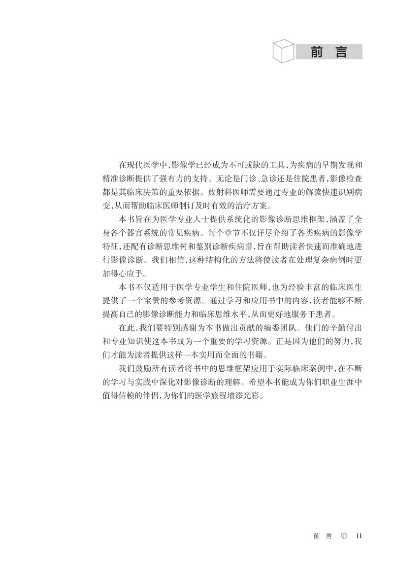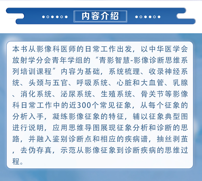 本书从影像科医师的日常工作出发,以中华医学会放射学分会青年学组的“青影智慧-影像诊断思维系列培训课程”内容为基础,系统梳理、收录神经系统、头颈与五官、呼吸系统、心脏和大血管、乳腺、消化系统、泌尿系统、生殖系统、骨关节等影像科日常工作中的近300个常见征象,从每个征象的分析入手,凝练影像征象的特征,辅以征象典型图进行说明,应用思维导图展现征象分析和诊断的思路,并融入鉴别诊断点和相应的疾病谱,抽丝剥茧,去伪存真,示范从影像征象到诊断疾病的思维过程。
