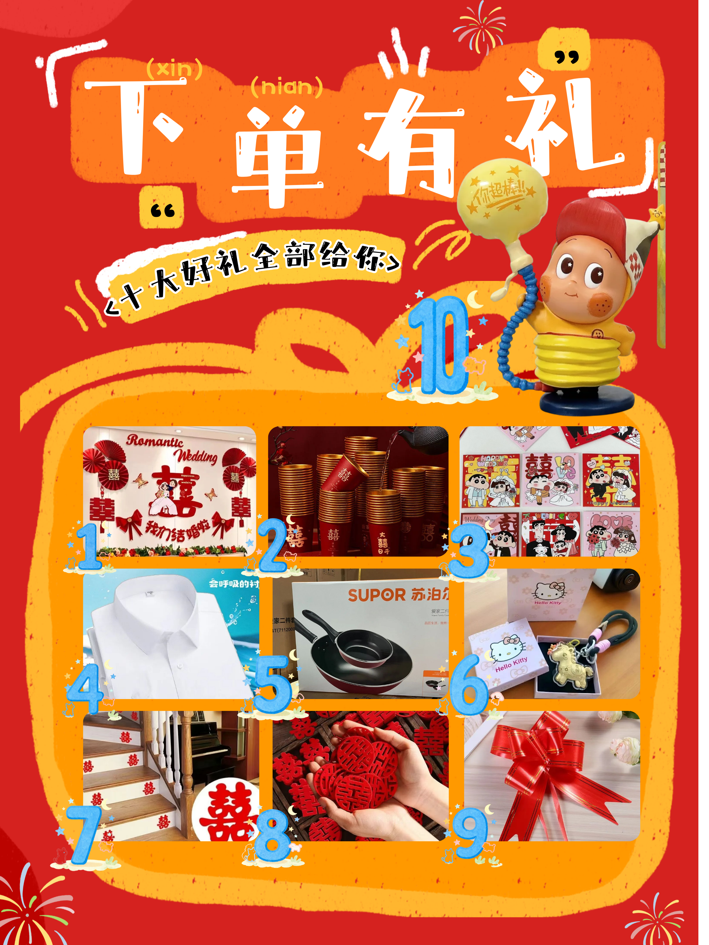 1.婚房布置2.喜字一次性杯3.堵门小红包4.衬衫一件5.苏泊尔电炒锅一套 6.小金马挂坠 7.喜字贴 8.手炮喜字9.香烟扎带10.星星人盲盒