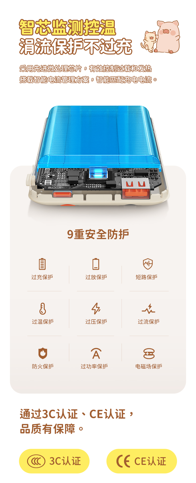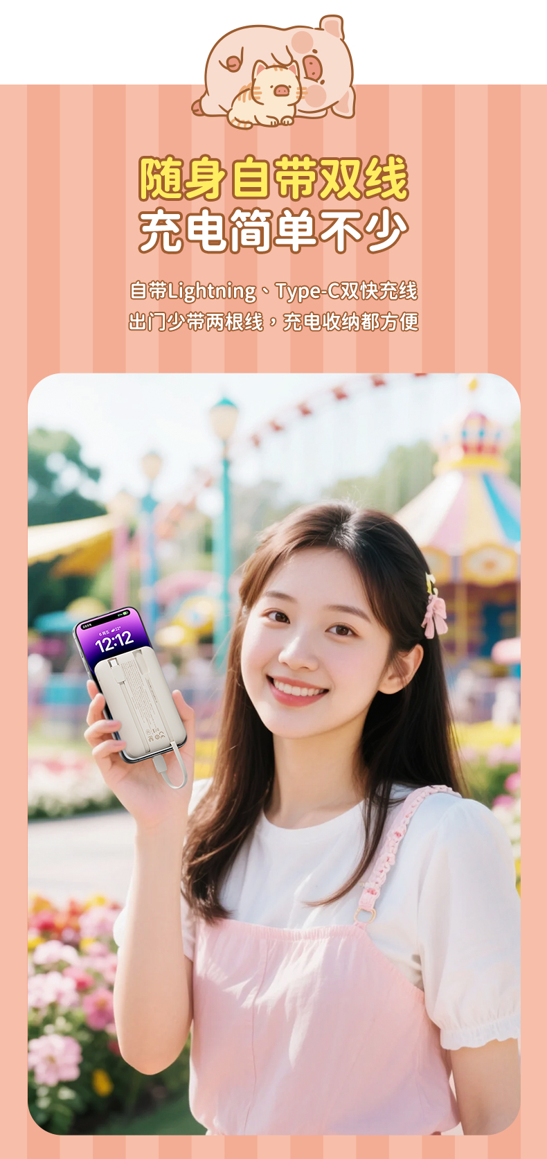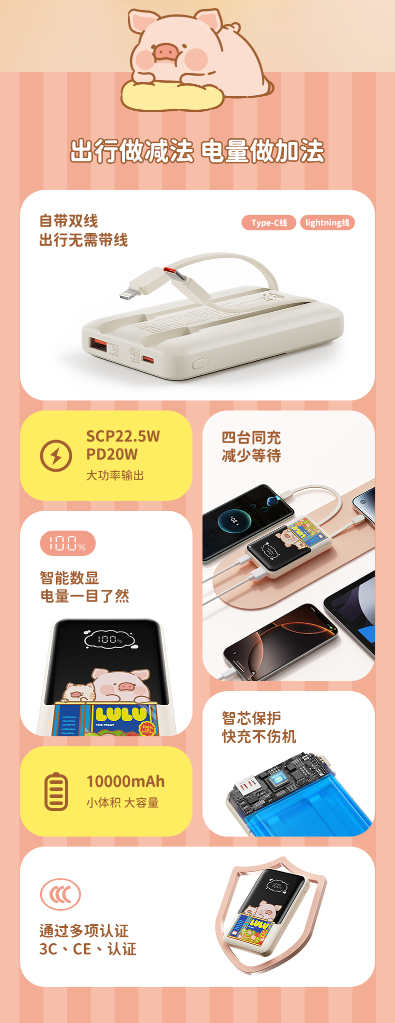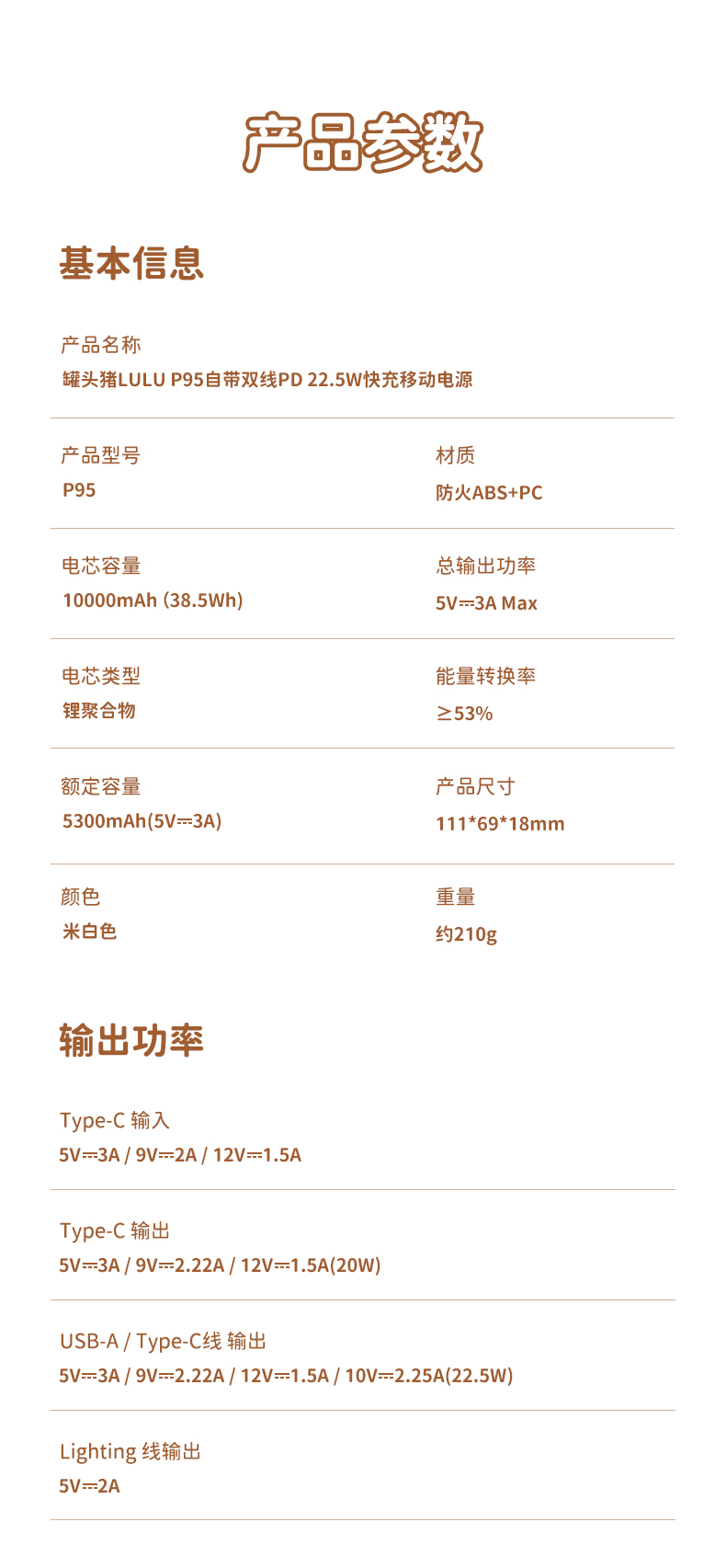 ROCK 罐头猪LULU P95自带双线PD 22.5W快充移动电源10000mah
