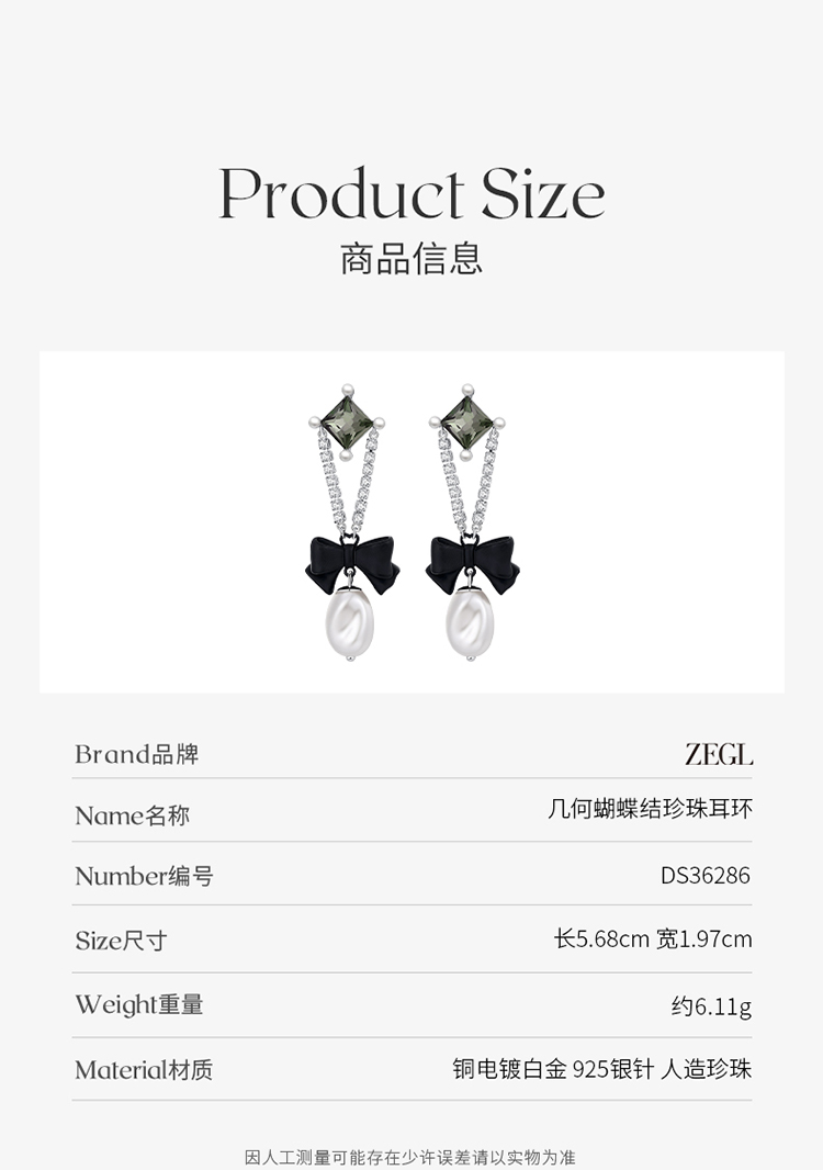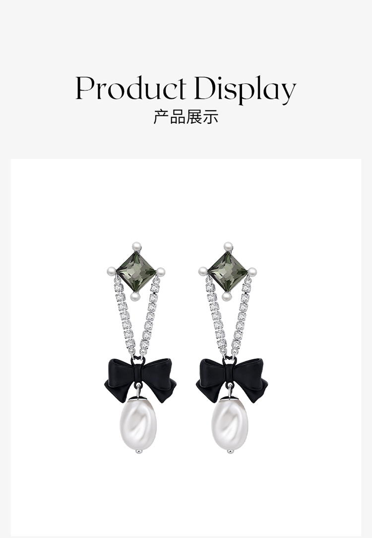 ZEGL设计师黑公主系列蝴蝶结人造珍珠耳环女复古耳钉925银针耳饰
